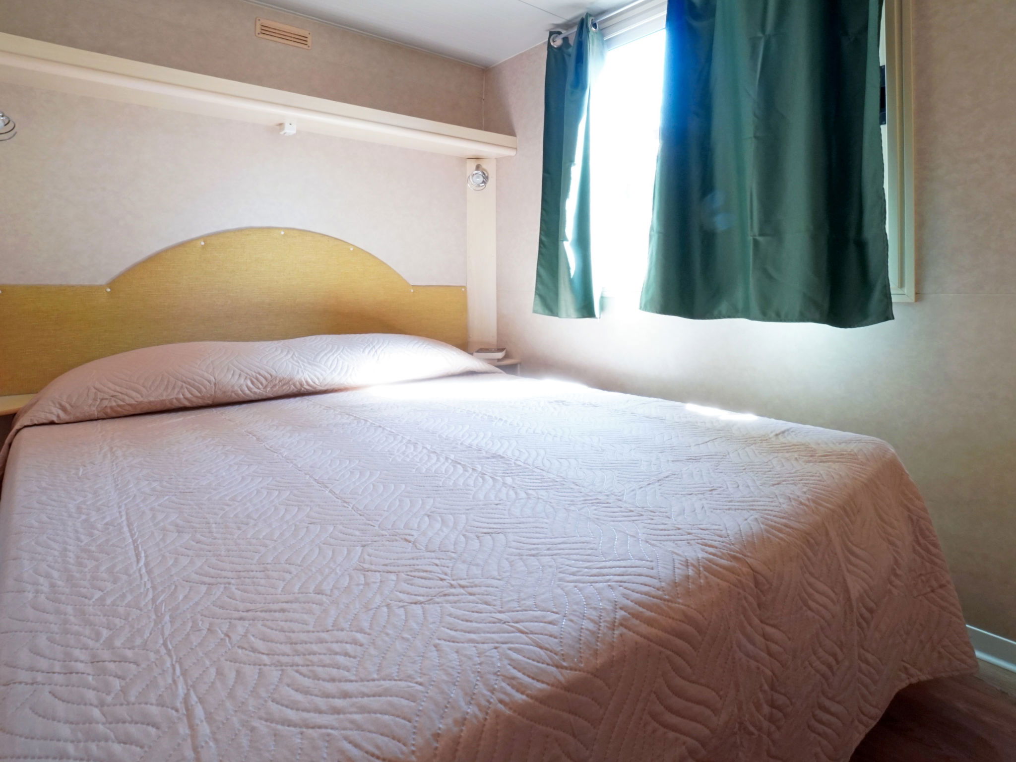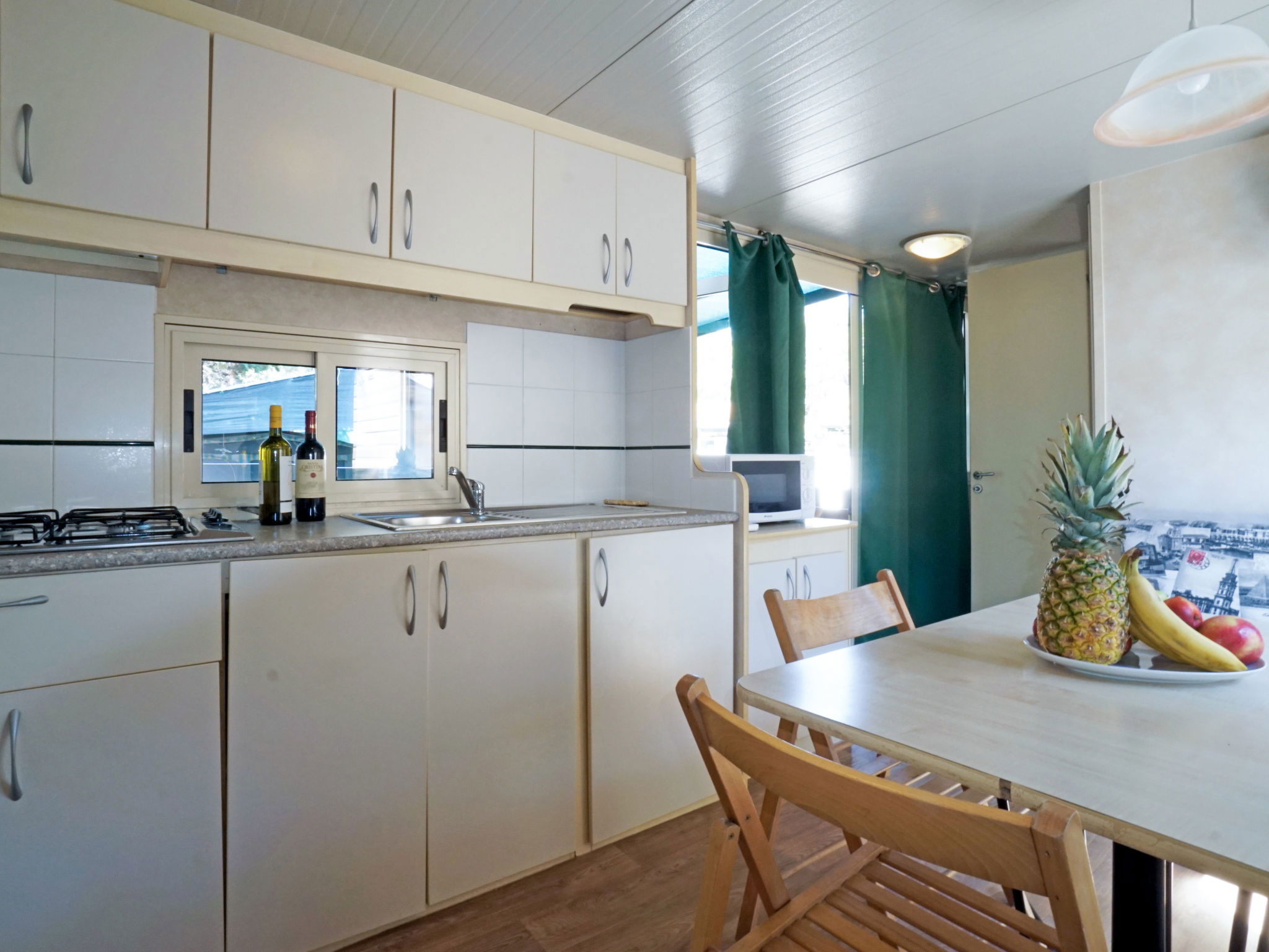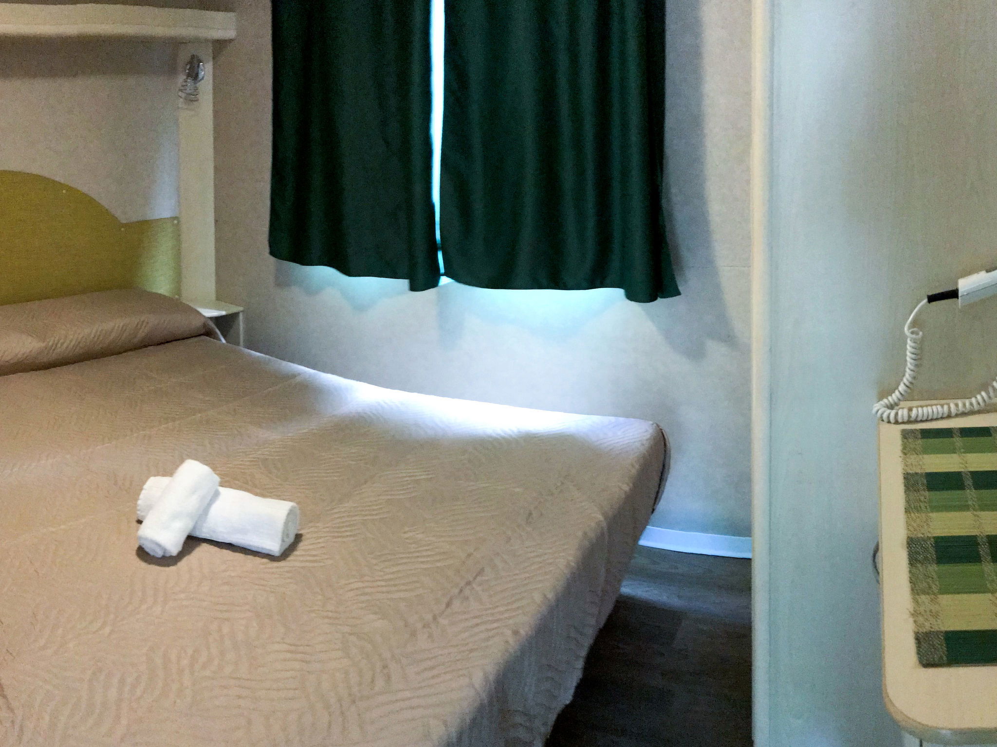 "Ponente", 3-room mobile home 24 m2. Practical furnishings: living/sleeping room with 1 sleeping facility, dining table, kitchen corner and air conditioning. Exit to the terrace. 1 room with 1 french bed (140 cm, length 190 cm). 1 room with 2 beds (70 cm, length 185 cm), 1 x 1 bunk beds (70 cm, length 185 cm). Open kitchen (4 gas rings, microwave, freezer). Shower/WC, sep. WC. Heating, air-conditioning. Terrace 18 m2, roofed. Terrace furniture. Facilities: mosquito net. Parking (1 car). Maximum 1 pet/ dog allowed. IT049001B1KRISVGSR