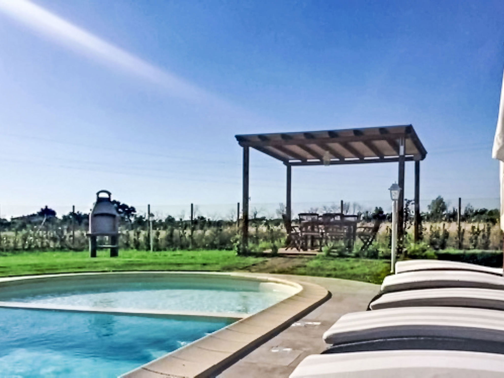 Comfortable house "Villa gli Olivi", 2 storeys. 4 km from the centre of Bibbona, 8 km from the centre of Cecina, in an elevated position, 5 km from the sea, 5 km from the beach. Private: property 4'700 m2 (fenced), well-kept garden, lawn for sunbathing, swimming pool (12 x 6 m, depth 80 - 140 cm, seasonal availability: 01.May. - 31.Oct.). Paddling pool, outdoor shower, pergola, barbecue. Linen change (suppl. charge extra). Towel change (suppl. charge extra). Motor access (1.5 km via unmade road). Roofed, parking. Shop 3.5 km, grocery 3.5 km, supermarket 4 km, restaurant 100 m, bus stop 1.5 km, railway station 9 km, thermal baths "Calidario" 30 km. Golf course (9 hole) 900 m. Nearby attractions: Bolgerhi 6.5 km, Pisa 70 km, Lucca 90 km, Firenze 120 km. Please note: car recommended.