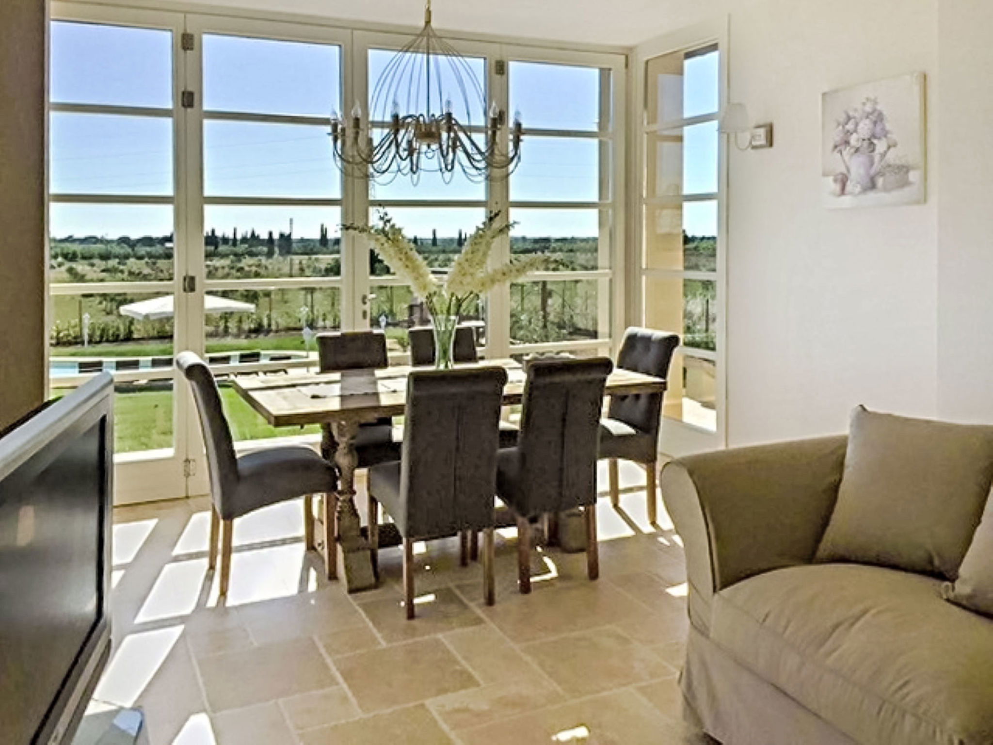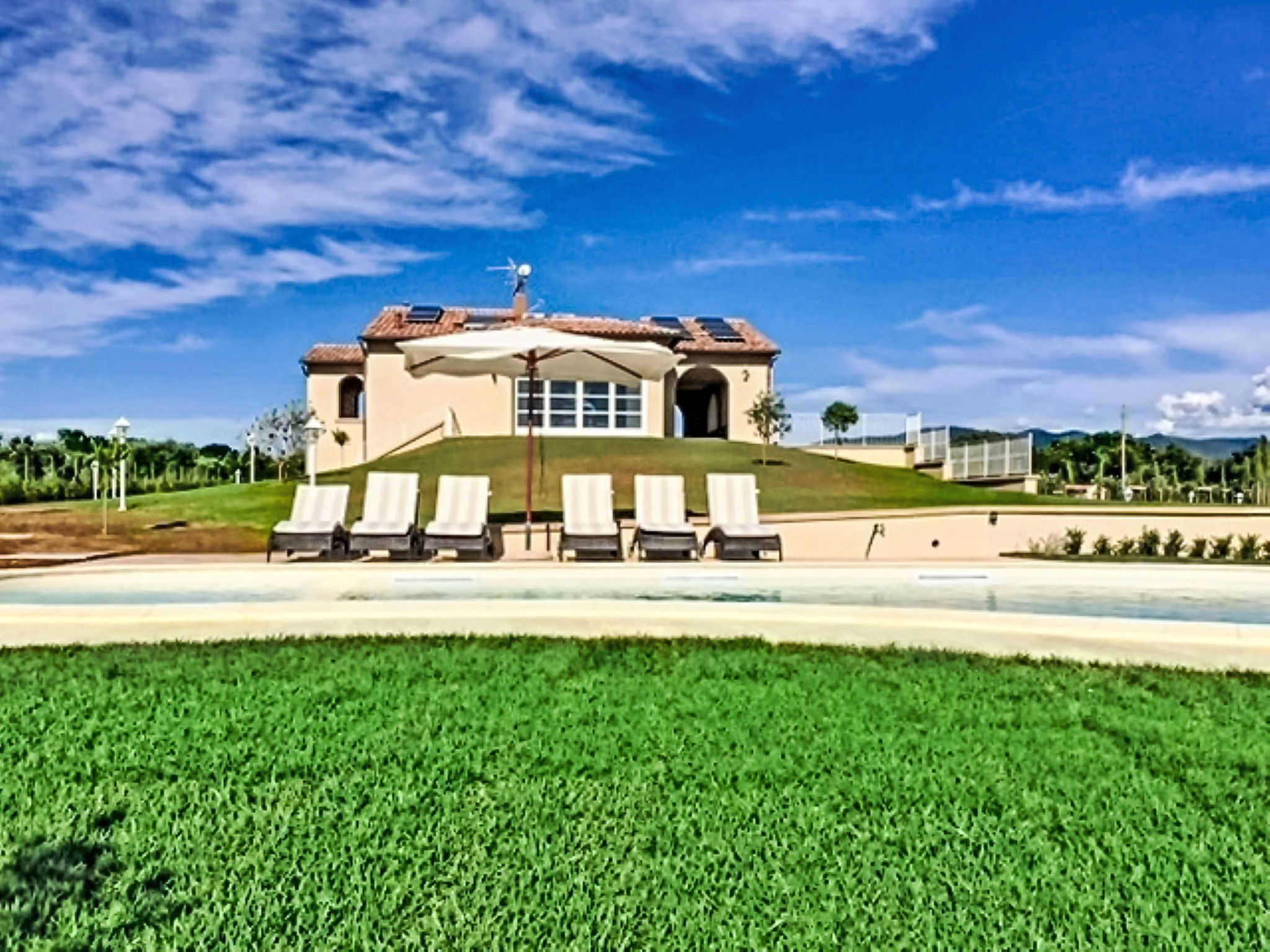 3-room villa 120 m2. Spacious, comfortable and tasteful furnishings: living/dining room with panoramic window with 1 double sofabed, dining table and air conditioning. Exit to the veranda. 1 room with 1 bed and 1 double bed. 1 room with 1 bed and 1 double bed. Exit to the loggia. Open kitchen (dishwasher, Gas stove, 4 gas rings, toaster, kettle, electric coffee machine). Shower/bidet/WC. Electric heating, gas heating, air-conditioning. Terrace 70 m2, roofed. Terrace furniture, box-room. Beautiful panoramic view of the swimming pool and the countryside. Facilities: washing machine, dryer, iron, mosquito net, children's high chair, baby cot, hair dryer. Internet (WiFi, free). Parking. Please note: non-smokers only. 2 pets/ dogs allowed. Smoke alarm, fire extinguisher.
