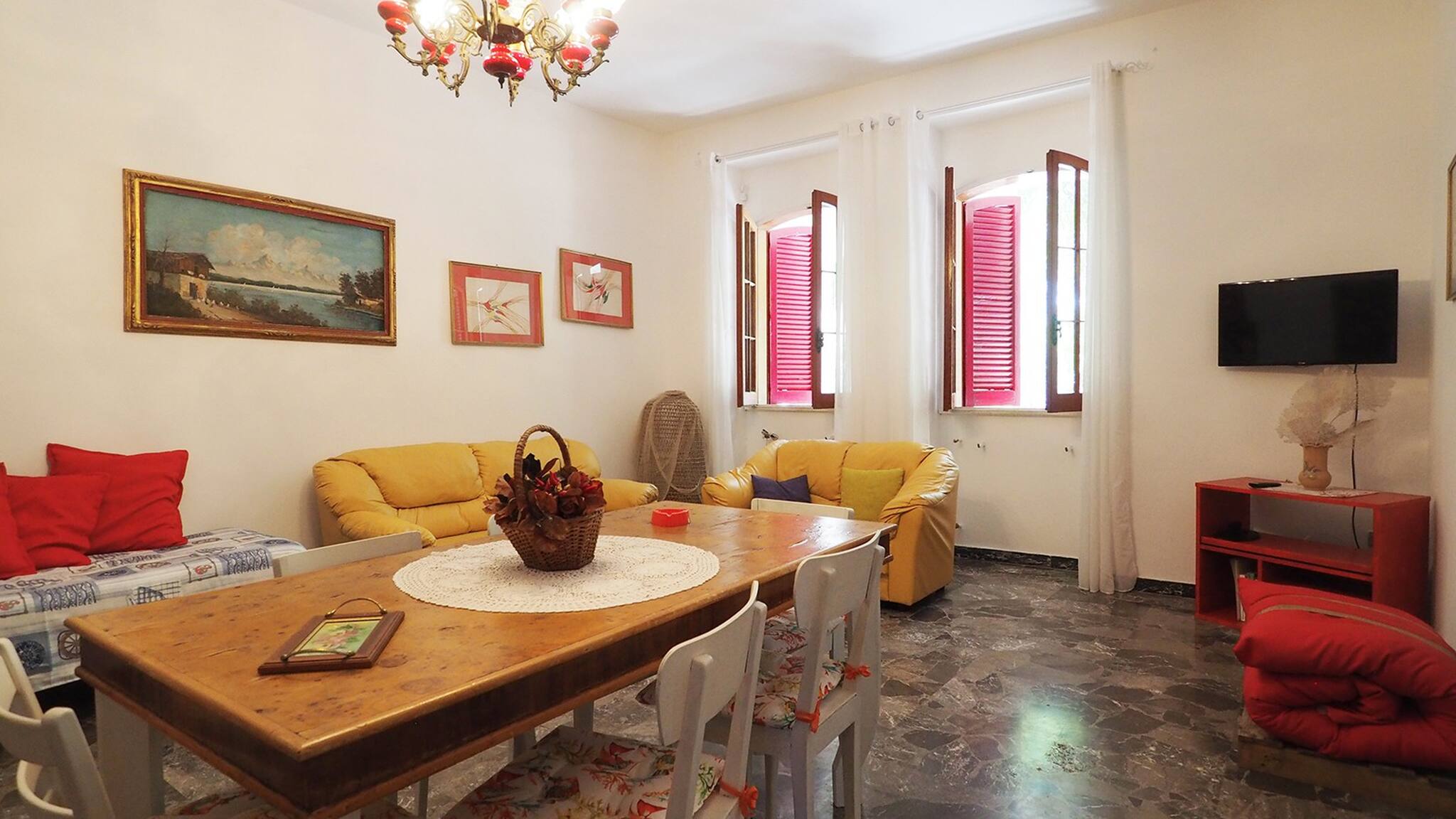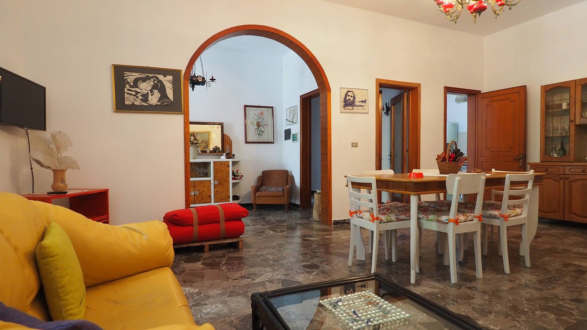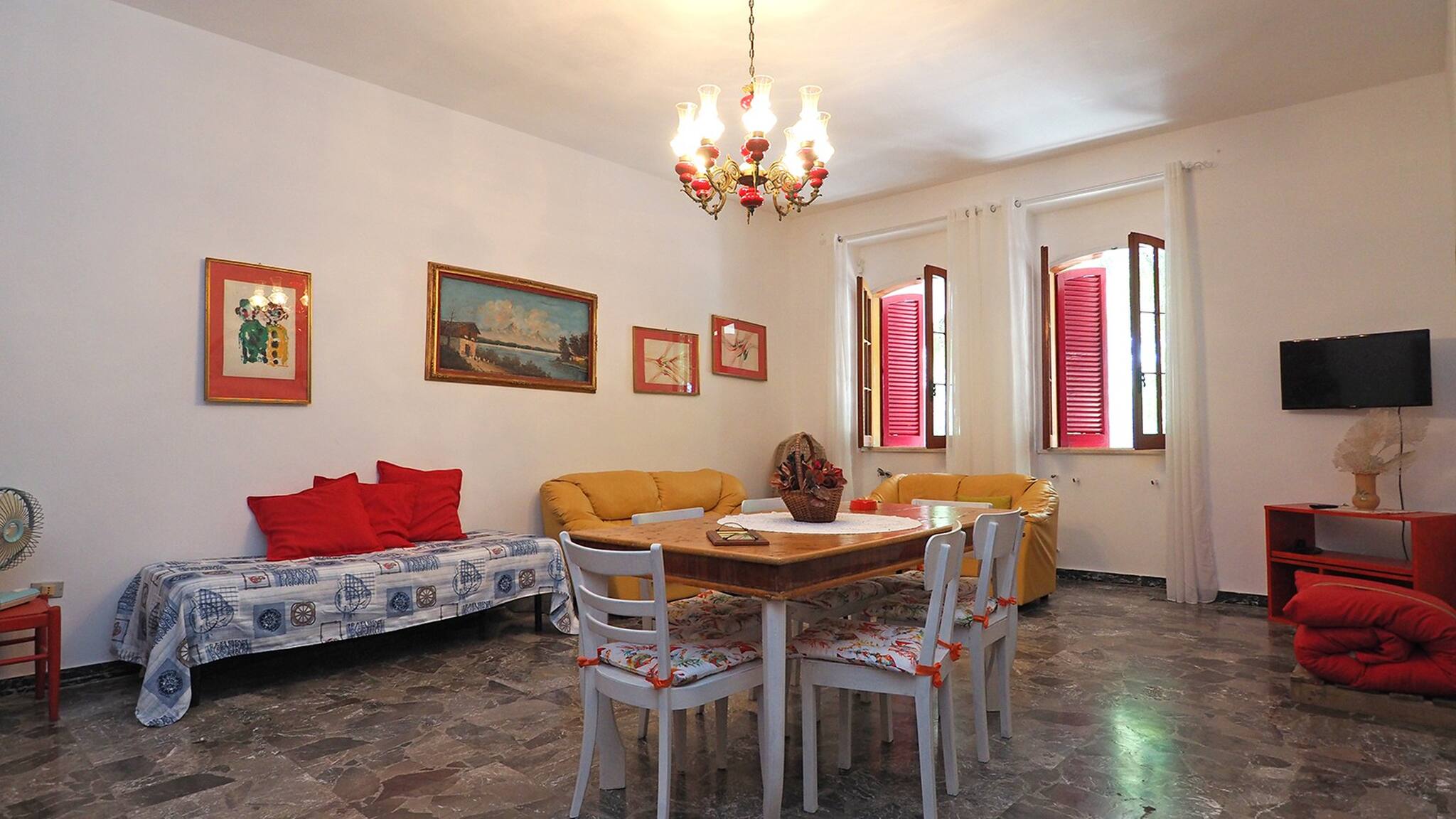 Internally, there is an entrance that opens onto a very large living room with a dining table, TV, sofas, and the possibility of adding up to three beds; then the kitchen with another dining table, two double bedrooms and one double room; two bathrooms, one with a shower and one with a shower and bathtub.