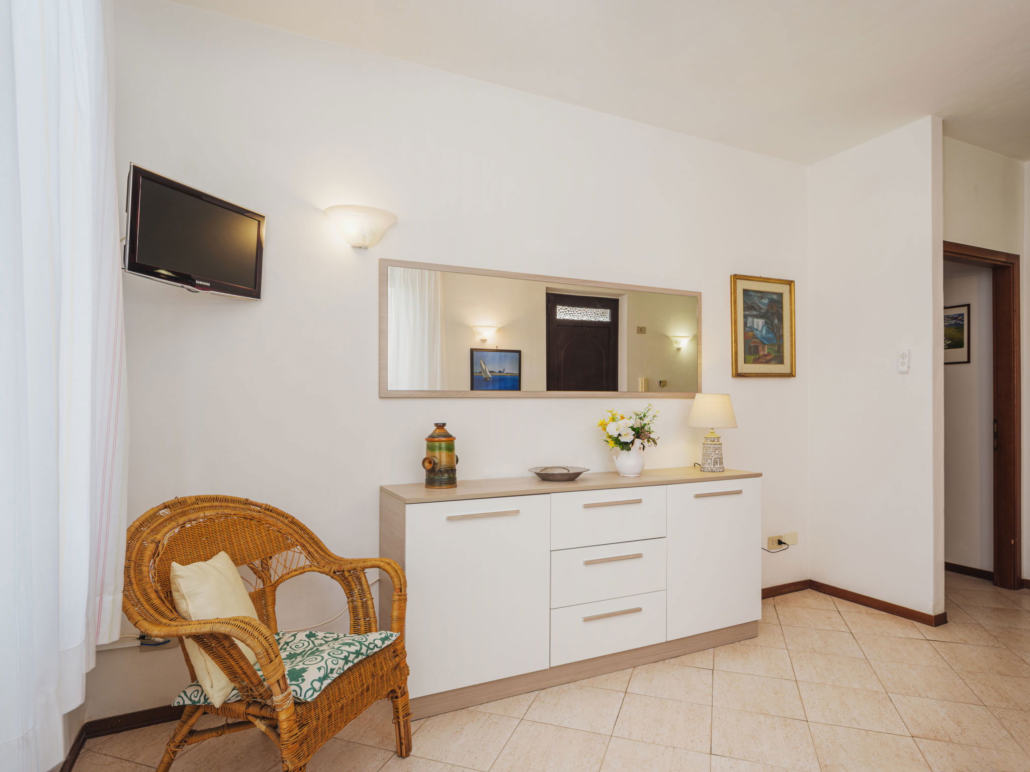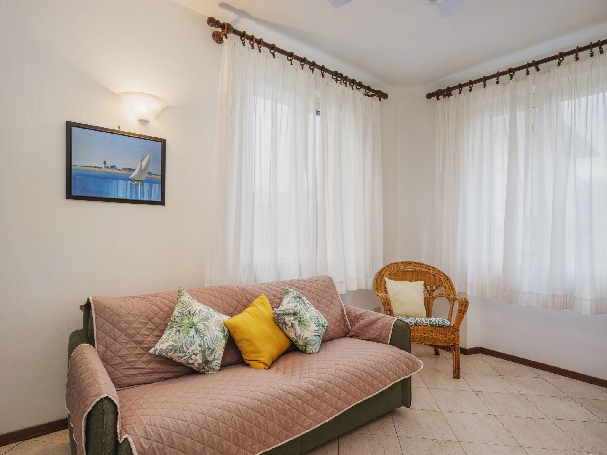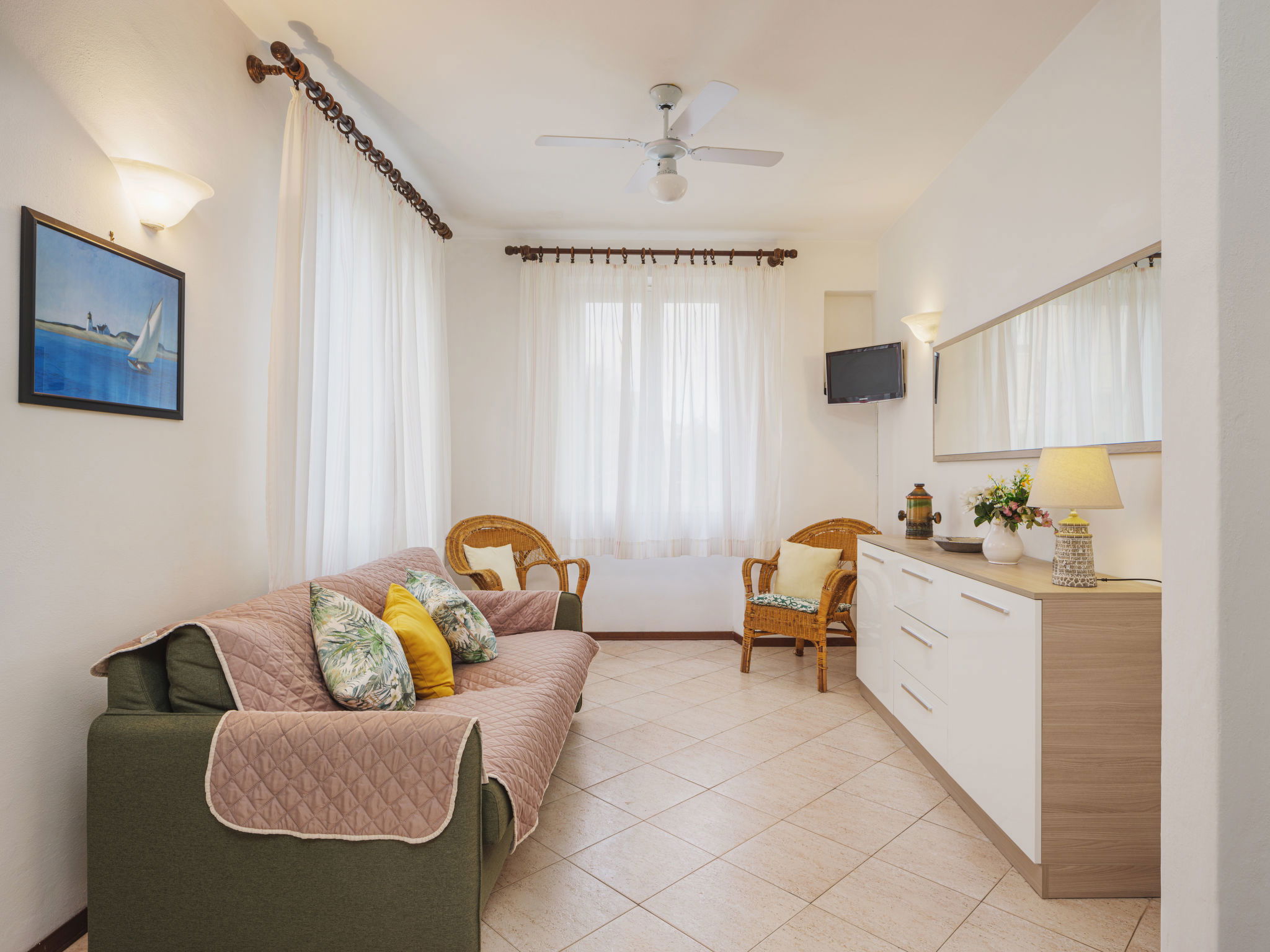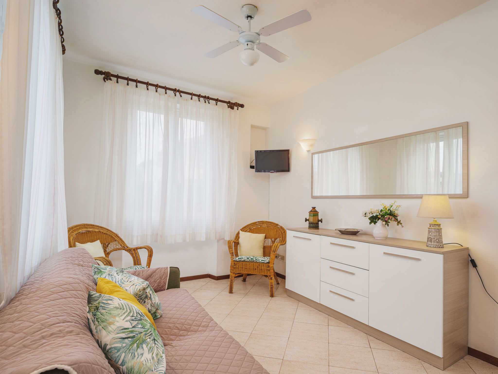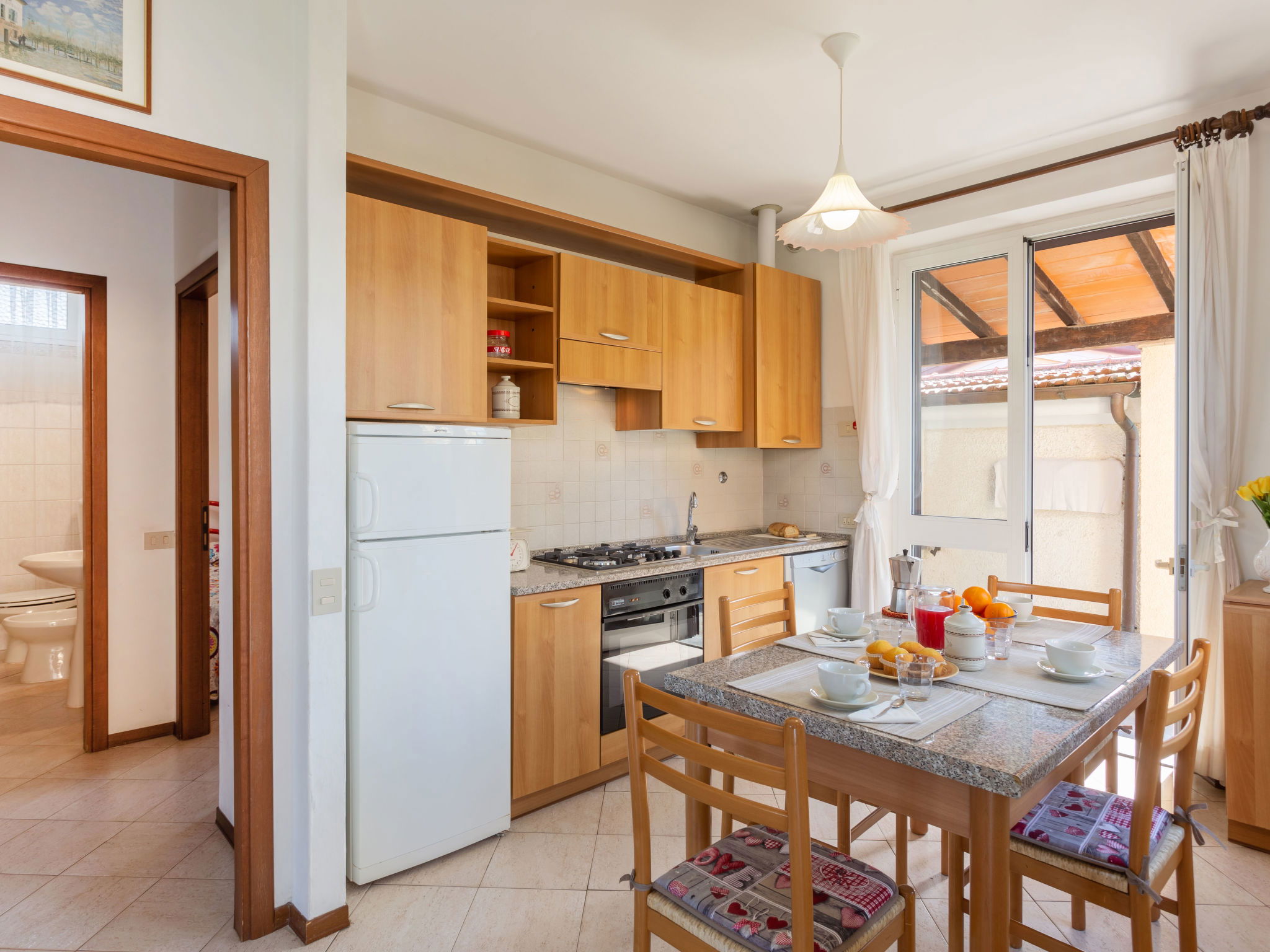 3-room house 70 m2, on the ground floor. Simple and practical furnishings: living/dining room with veranda with TV and fan. Exit to the garden, to the veranda. 1 double bedroom with fan. 1 room with 2 beds. Kitchenette (4 hot plates, oven, dishwasher, freezer). Shower/bidet/WC. Gas heating. Heating available only from 01.11. to 15.04. Small garden. Terrace furniture, barbecue (portable). Distant view of the mountains. Facilities: washing machine. Internet (WiFi, free). Parking (fenced 1 car). Please note: suitable for families. Parking space for small car only. Maximum 1 pet/ dog allowed. IT046024C2F6B3XZKW