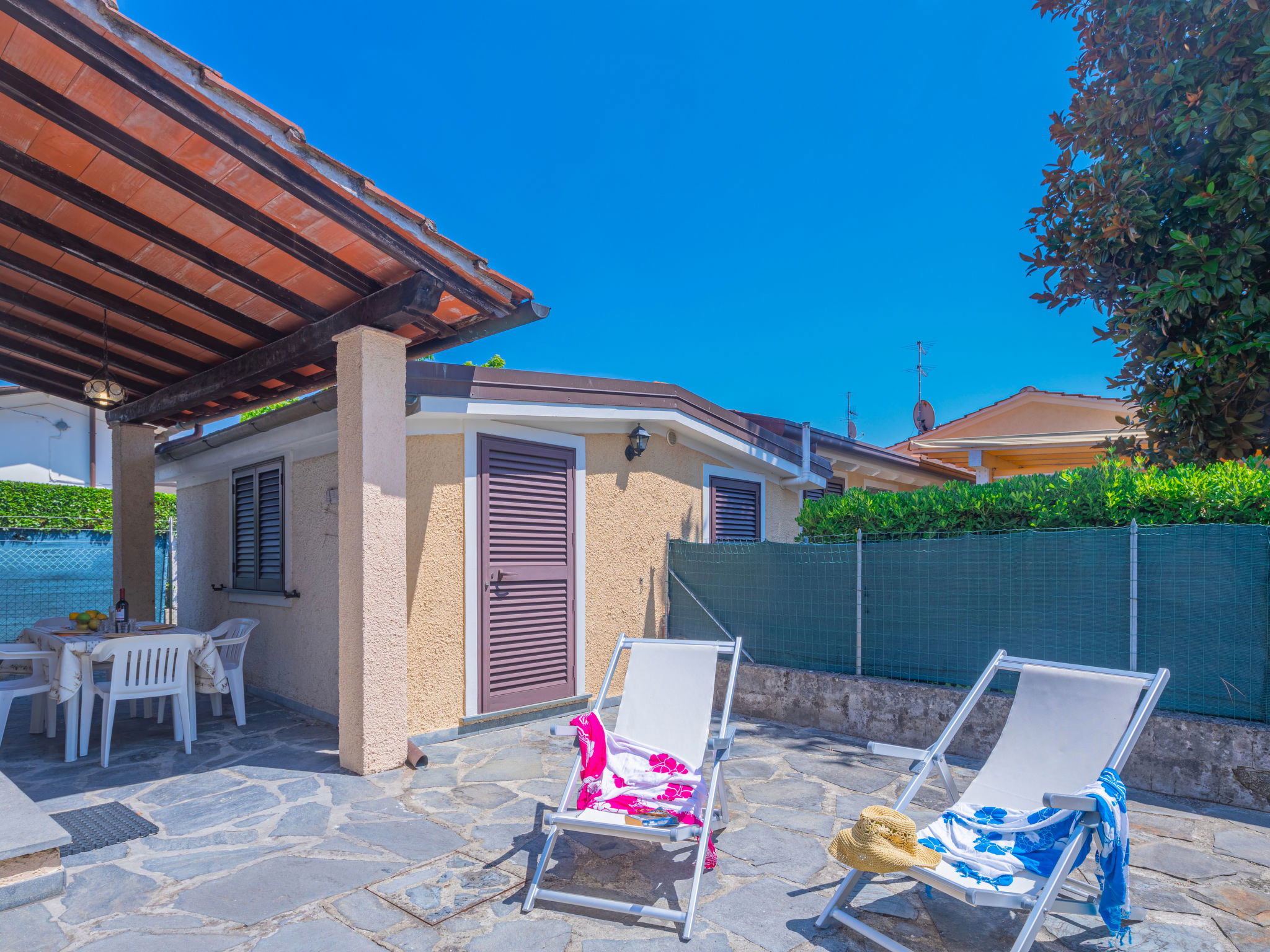 Located in a quiet district of Marina di Pietrasanta, the holiday home "Francesca" will allow you, given the strategic position, to fully enjoy the most beautiful beaches of Versilia, as well as to spend moments of complete relaxation in the garden small, cosy single-family house "Francesca". 3 houses in the residence. 800 m from the centre of Marina di Pietrasanta, in the district Tonfano, in a quiet position residential area (villas), 1 km from the sea, located by a road. Private: garden 150 m2 (fenced) flowers and trees. Garden furniture. In the house: washing machine, heating available only from 01.Nov. - 15.Apr.. Parking at the house. Shop 700 m, grocery 900 m, shopping centre 3 km, restaurant 400 m, bus stop 400 m, railway station 5 km, sandy beach 1 km. Golf course (12 hole) 2 km, tennis 800 m. Nearby attractions: Pietrasanta 4 km, Forte dei Marmi 6 km, Pisa 38 km, Lucca 40 km. Please note: suitable for families. The owner does not accept any youth groups. Property ref. IT5181.90.1 is situated on the same property.