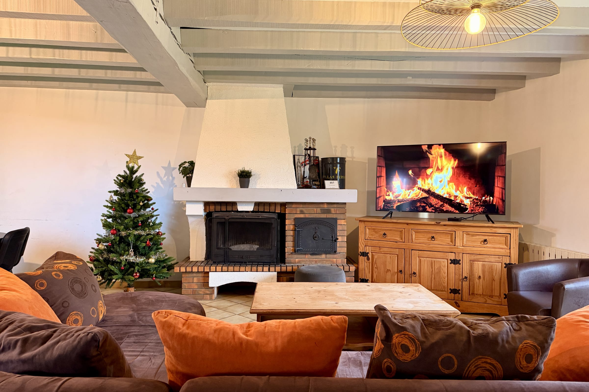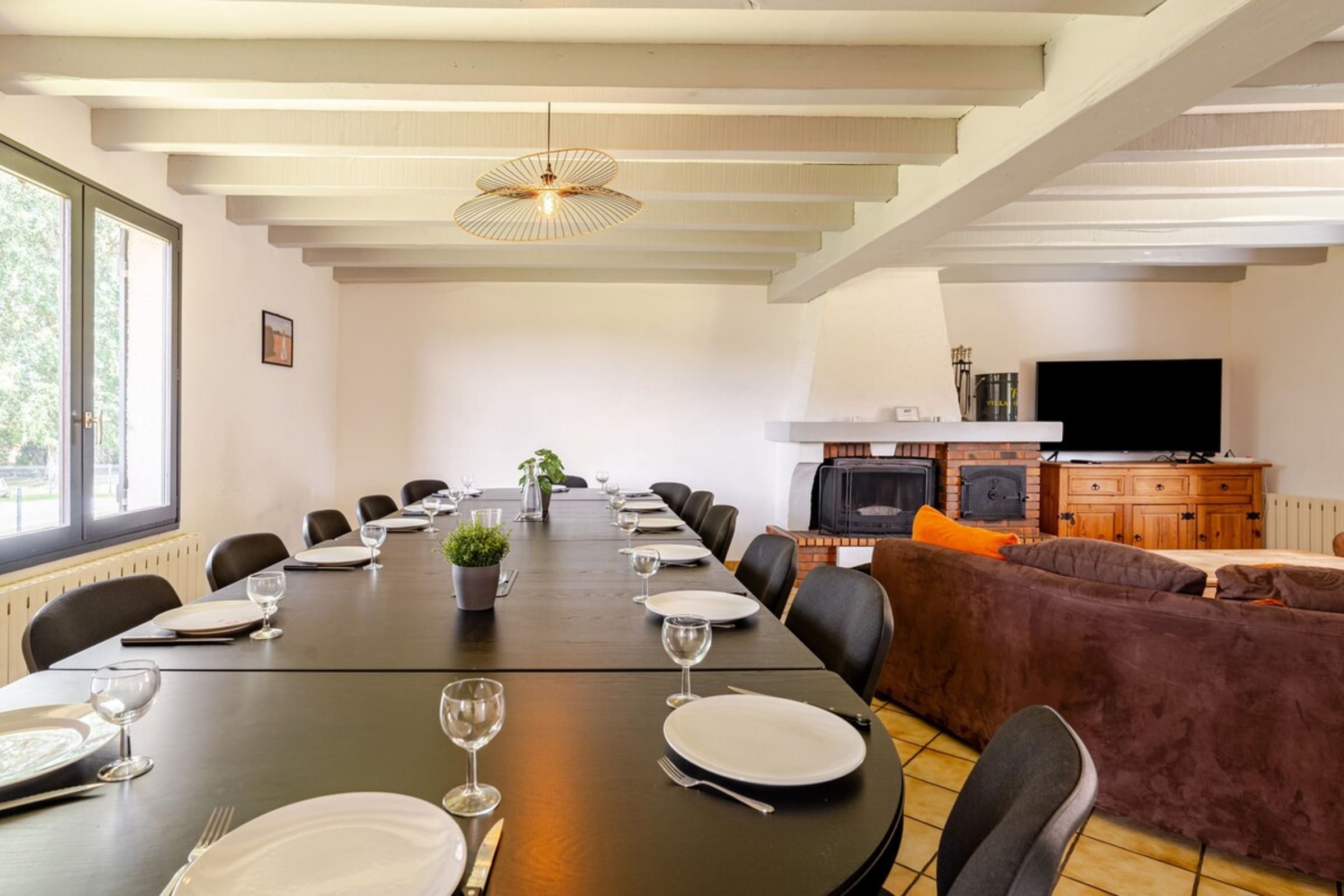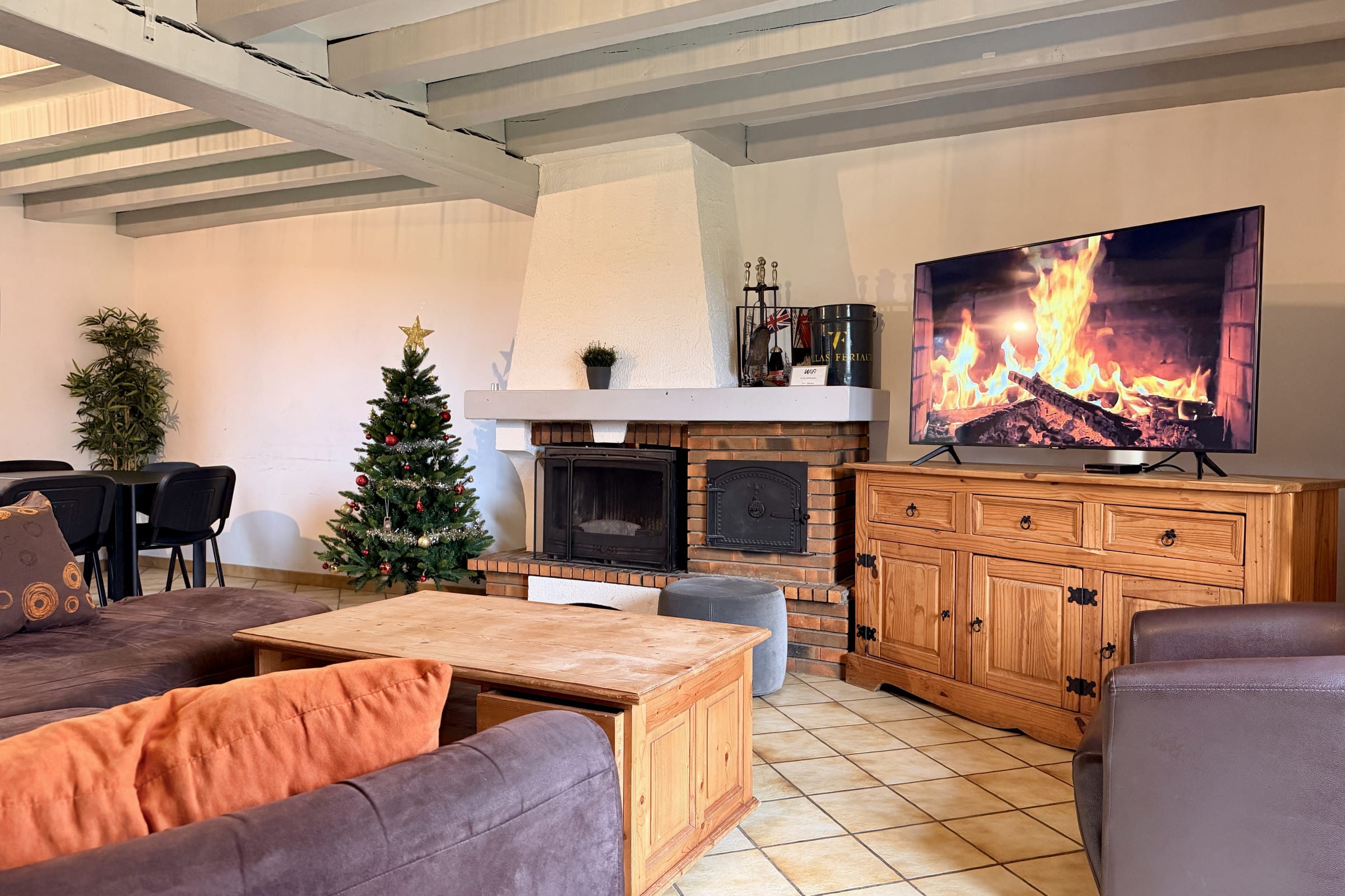 Located on the ground floor, a large living/dining room with a wood-burning fireplace (wood not provided), a sofa and a coffee table. The dining room has two large tables that can accommodate all your guests.