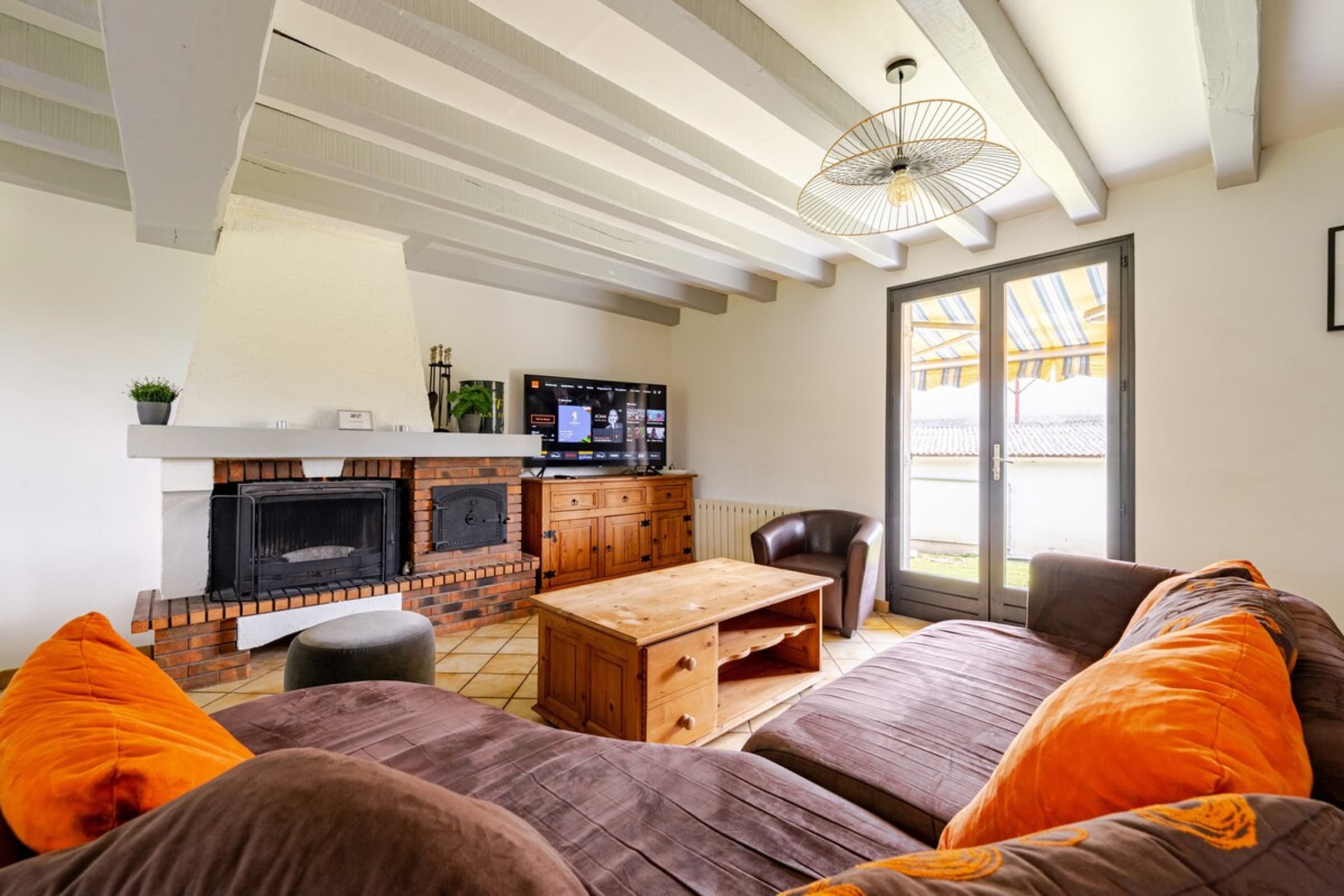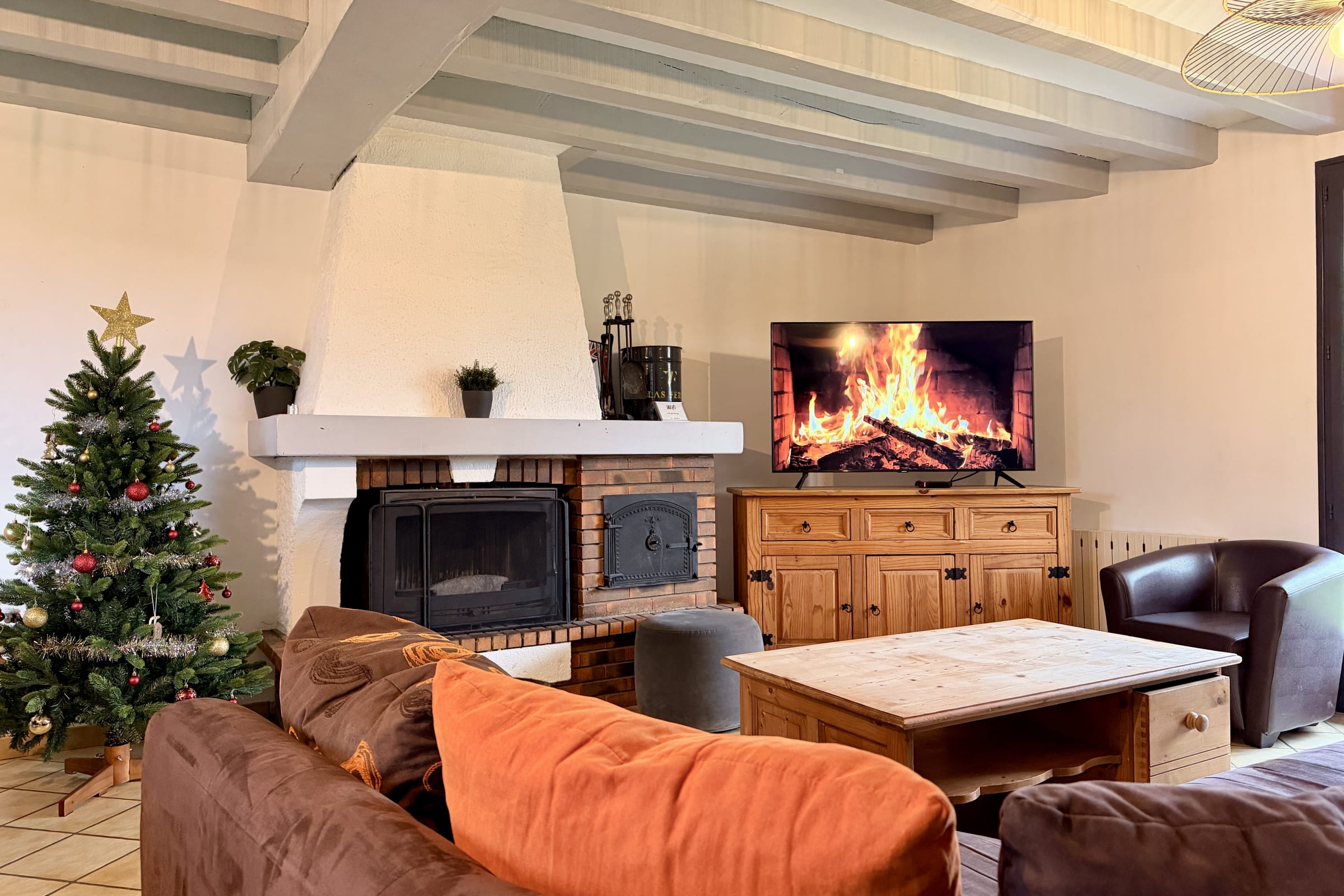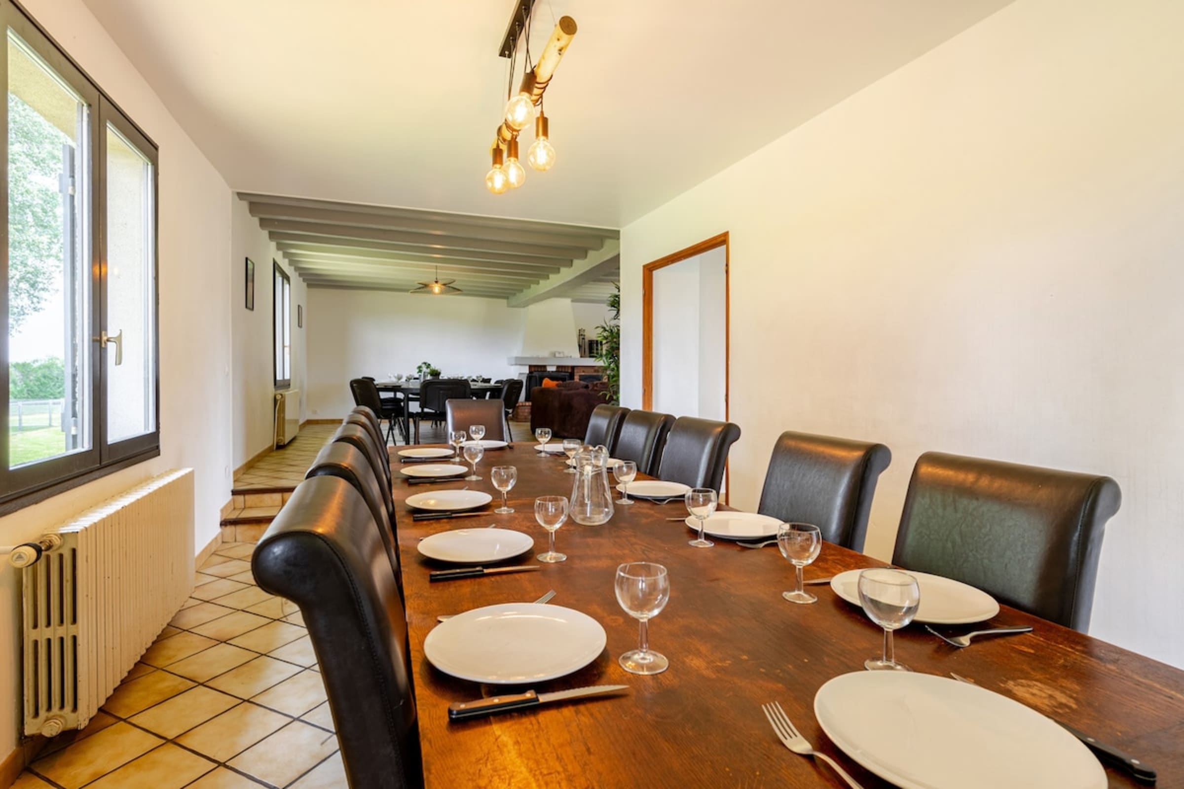 Located on the ground floor, a large living/dining room with a wood-burning fireplace (wood not provided), a sofa and a coffee table. The dining room has two large tables that can accommodate all your guests.