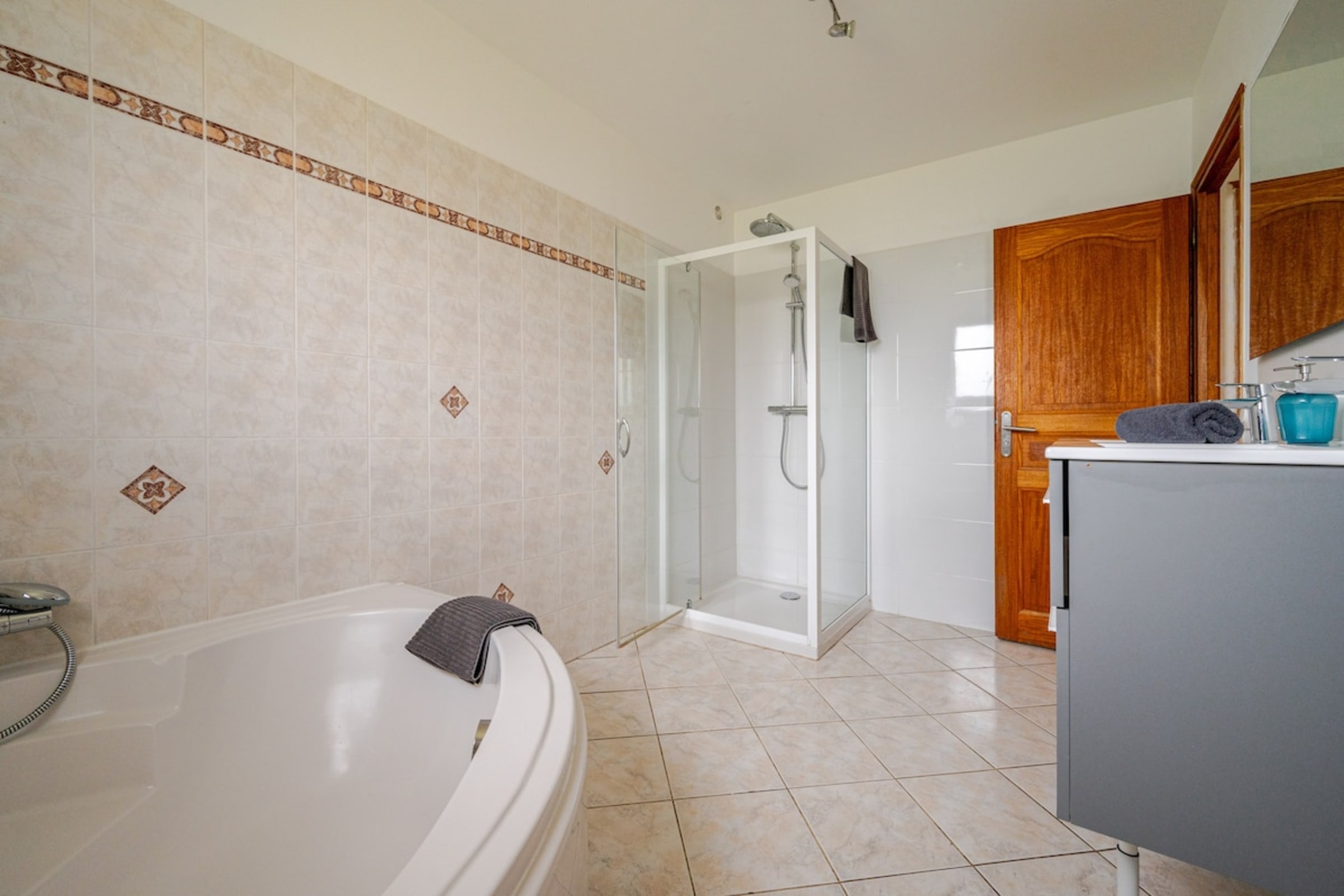 The on the ground floor, equipped with a double sink unit, a shower and a bathtub.