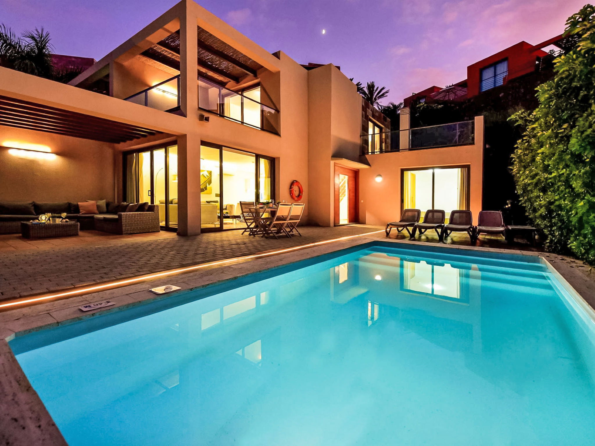 Cosy, luxurious villa "Las Terrazas 14". In the centre of Salobre Golf Resort, 1 km from the beach. Private: beautiful garden to relax, swimming pool angular (6 x 2 m, depth 140 cm, seasonal availability: 01.Jan. - 31.Dec.). Patio, arbour, pergola, garden furniture, barbecue. In the house: air conditioning. Parking at the house. Bus stop "Las Crucitas" 19 km. Please note: car recommended. On request. Object suitable for 4 adults. The owner does not accept any youth groups. Neighbourhood highly sensitive to noise. Quietness and good behaviour expected.