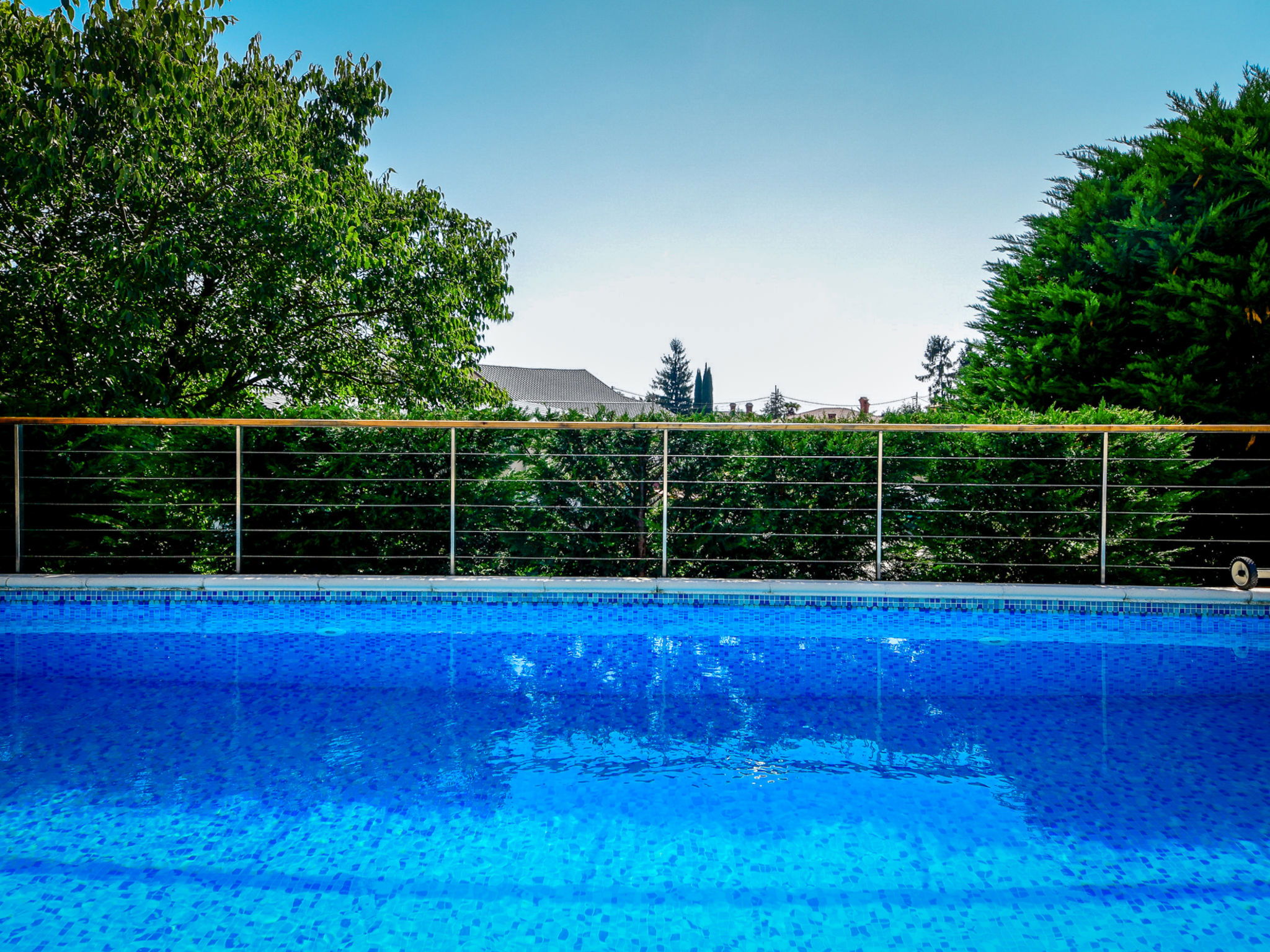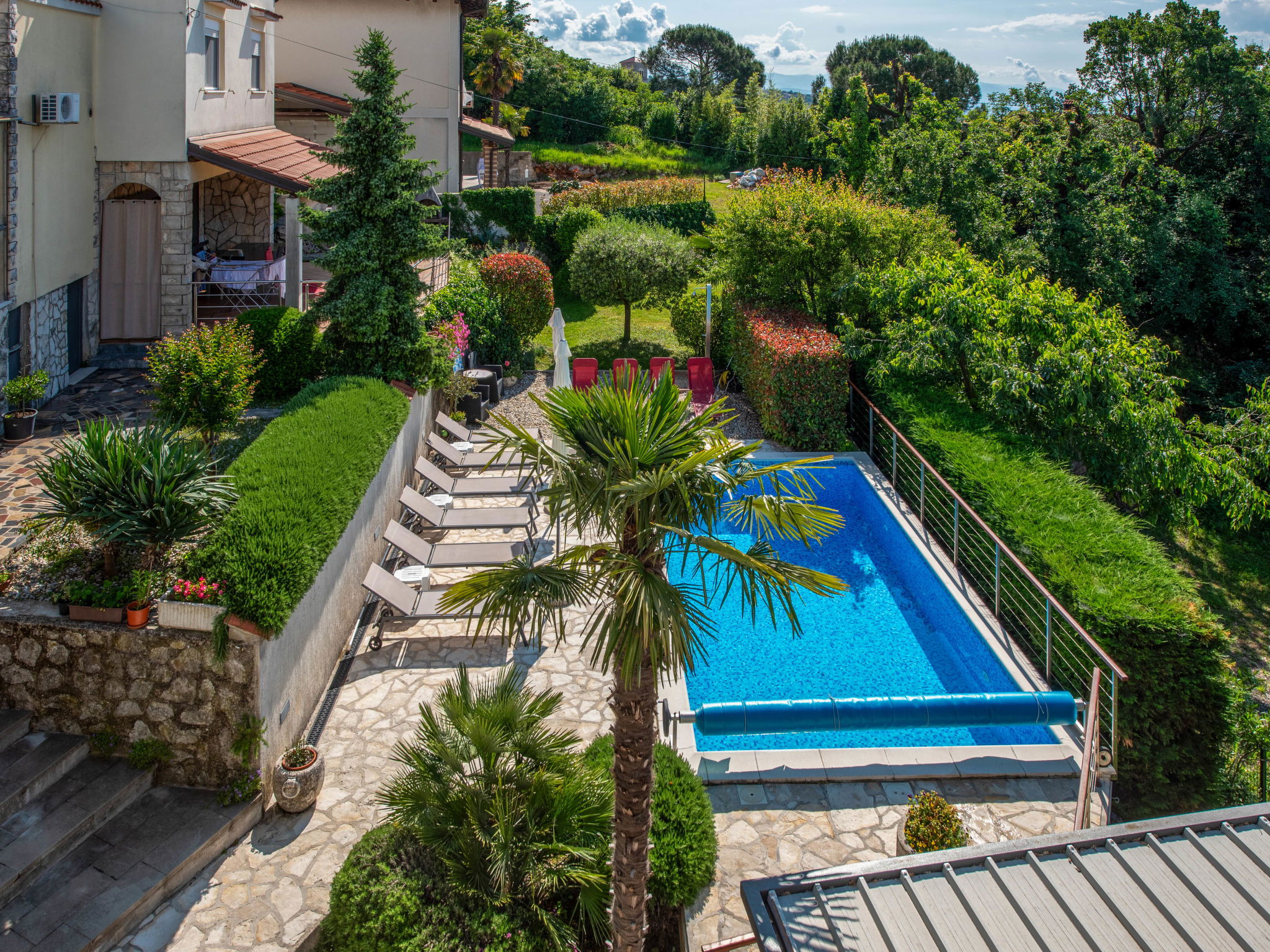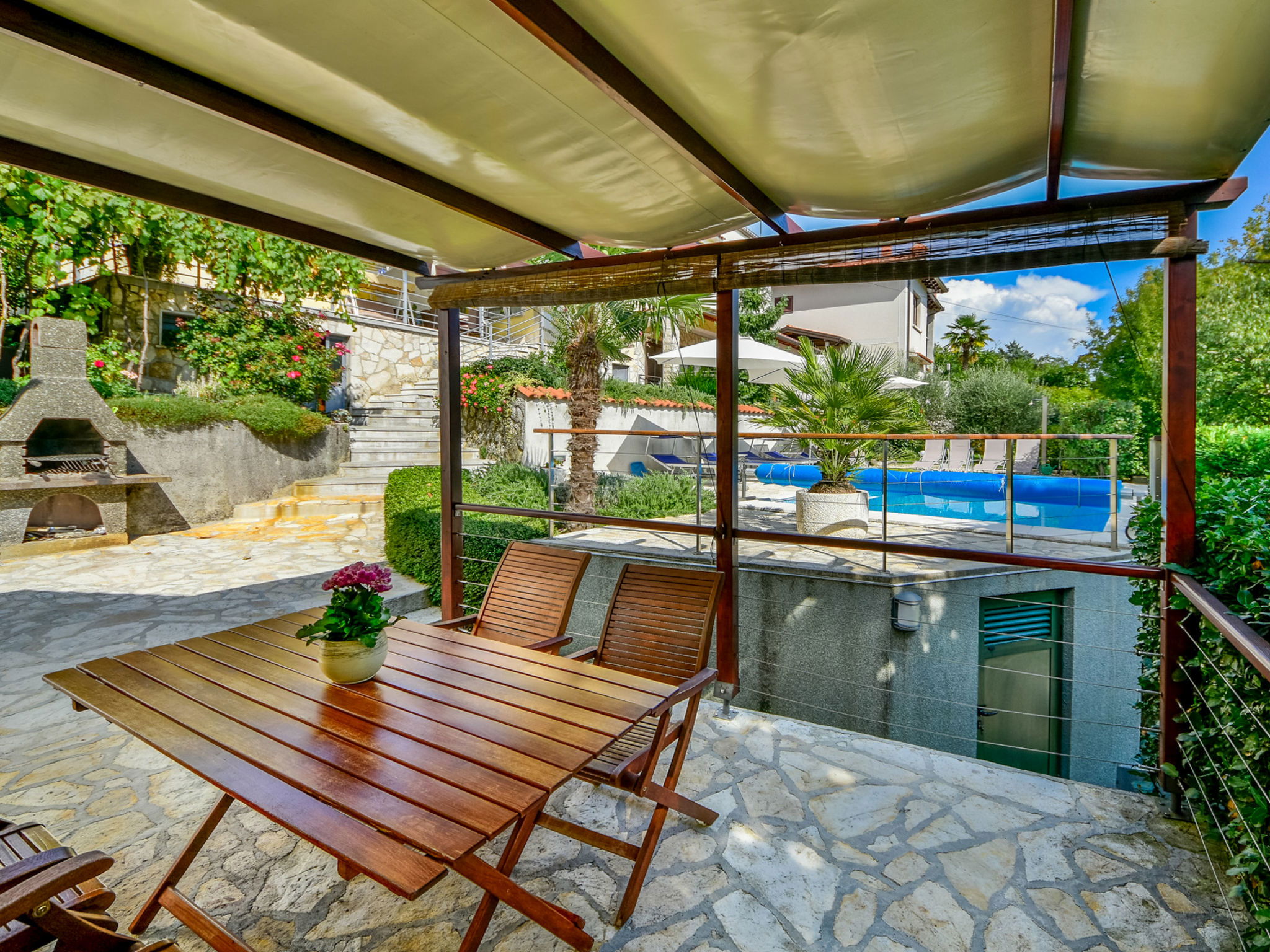 Matulji 5 km from Opatija: Bungalow "Lucija". 300 m from the centre of Matulji, 3 km from the sea. For shared use: property 2'000 m2 (fenced), swimming pool angular (7 x 3 m, 24 m2, depth 140 cm, seasonal availability: 07.May. - 01.Oct.). Outdoor shower, table tennis, barbecue. In the house: internet access. Parking at the house on the premises. Shop 270 m, supermarket, restaurant 300 m, bus stop 270 m, pebble beach 3 km, concrete beach 3 km. Please note: Property ref. HR3110.100.1 is situated on the same property.