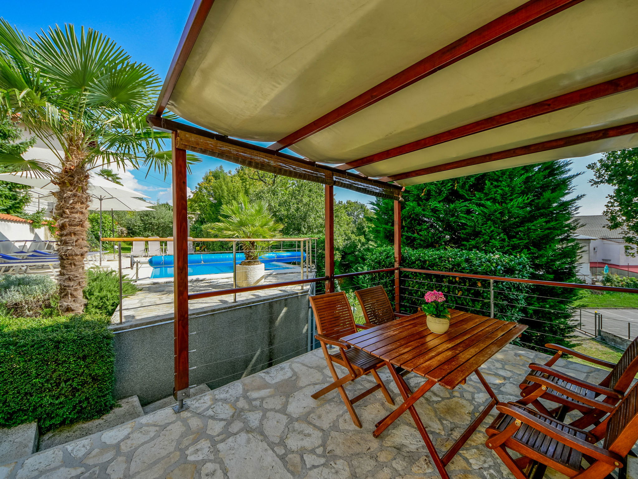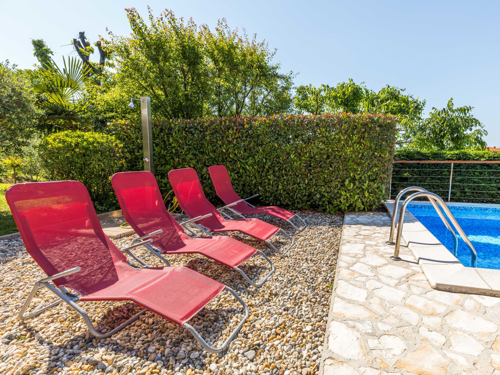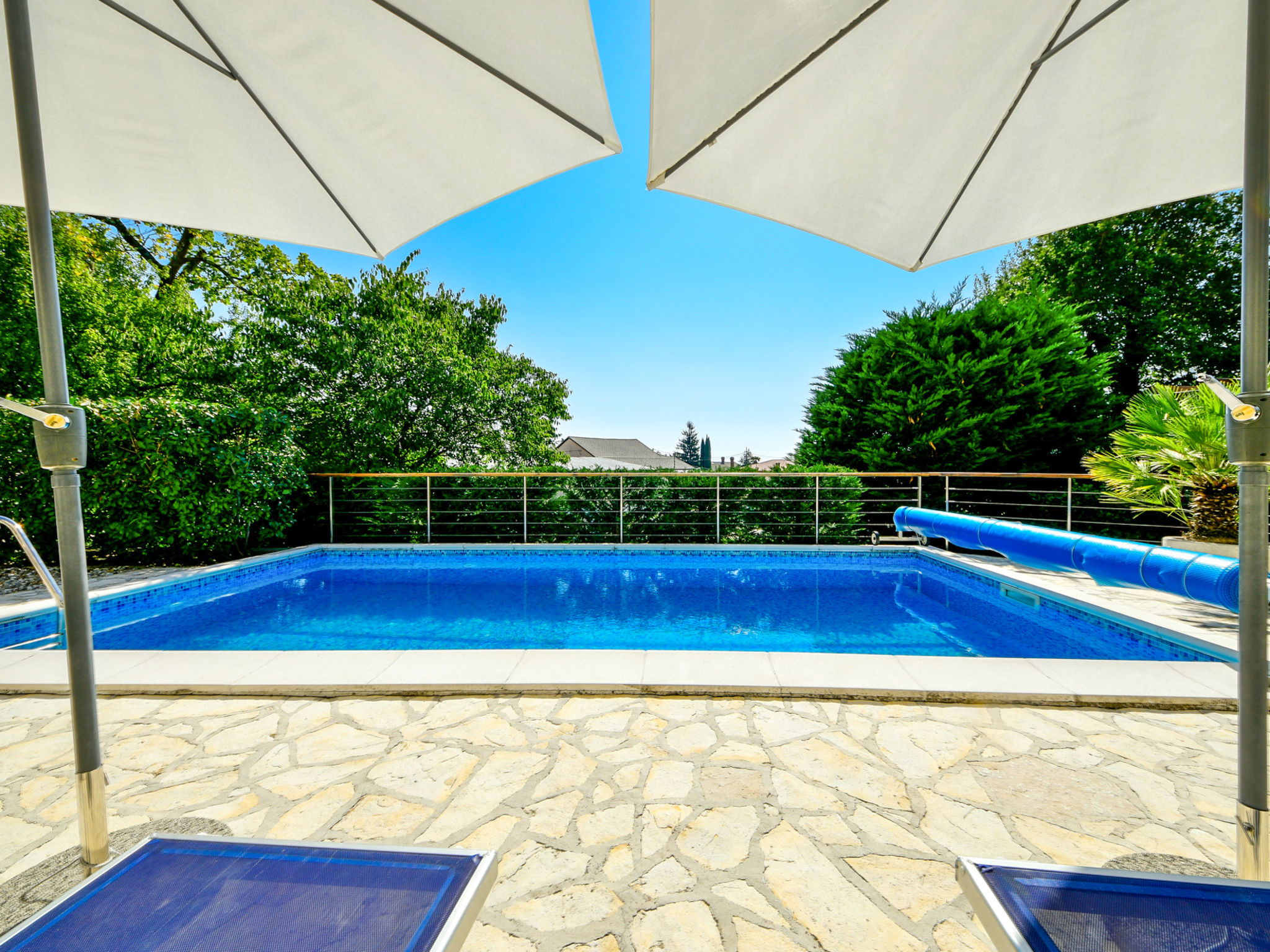 Matulji 5 km from Opatija: Bungalow "Lucija". 300 m from the centre of Matulji, 3 km from the sea. For shared use: property 2'000 m2 (fenced), swimming pool angular (7 x 3 m, 24 m2, depth 140 cm, seasonal availability: 07.May. - 01.Oct.). Outdoor shower, table tennis, barbecue. In the house: internet access. Parking at the house on the premises. Shop 270 m, supermarket, restaurant 300 m, bus stop 270 m, pebble beach 3 km, concrete beach 3 km. Please note: Property ref. HR3110.100.1 is situated on the same property.
