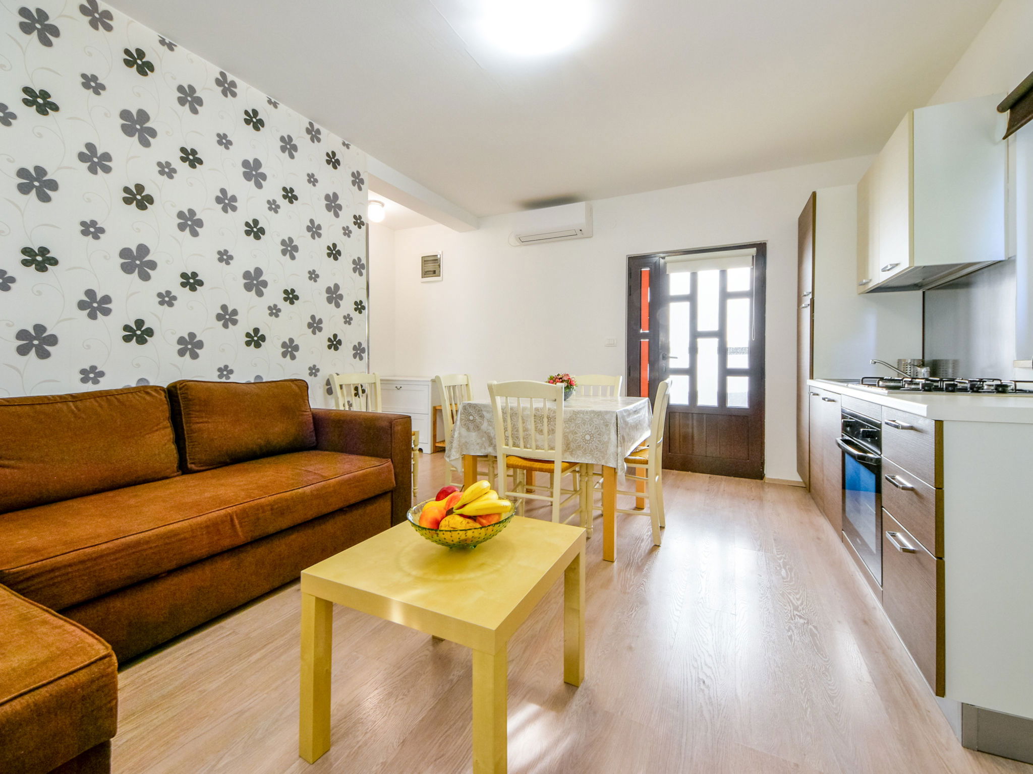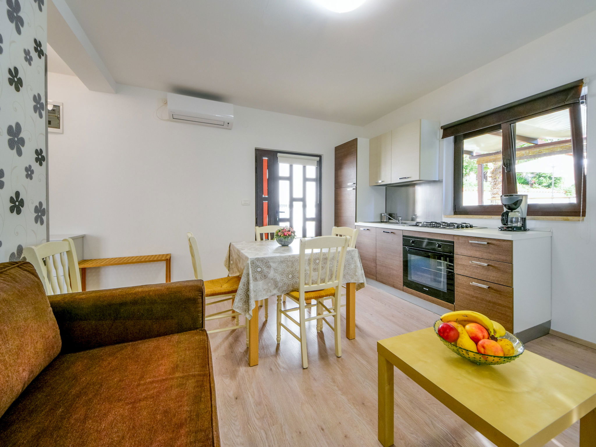 2-room house 40 m2, south facing position. Living/dining room with 1 double sofabed (140 cm, length 205 cm), satellite TV (flat screen), air conditioning. Exit to the terrace. 1 room with 1 french bed (160 cm, length 200 cm). Open kitchen (4 hot plates, oven, freezer, electric coffee machine). Shower/bidet/WC. Heating (extra). Terrace 15 m2. Terrace furniture. View of the swimming pool. Facilities: Internet (WiFi, free). Maximum 1 pet/ dog allowed.