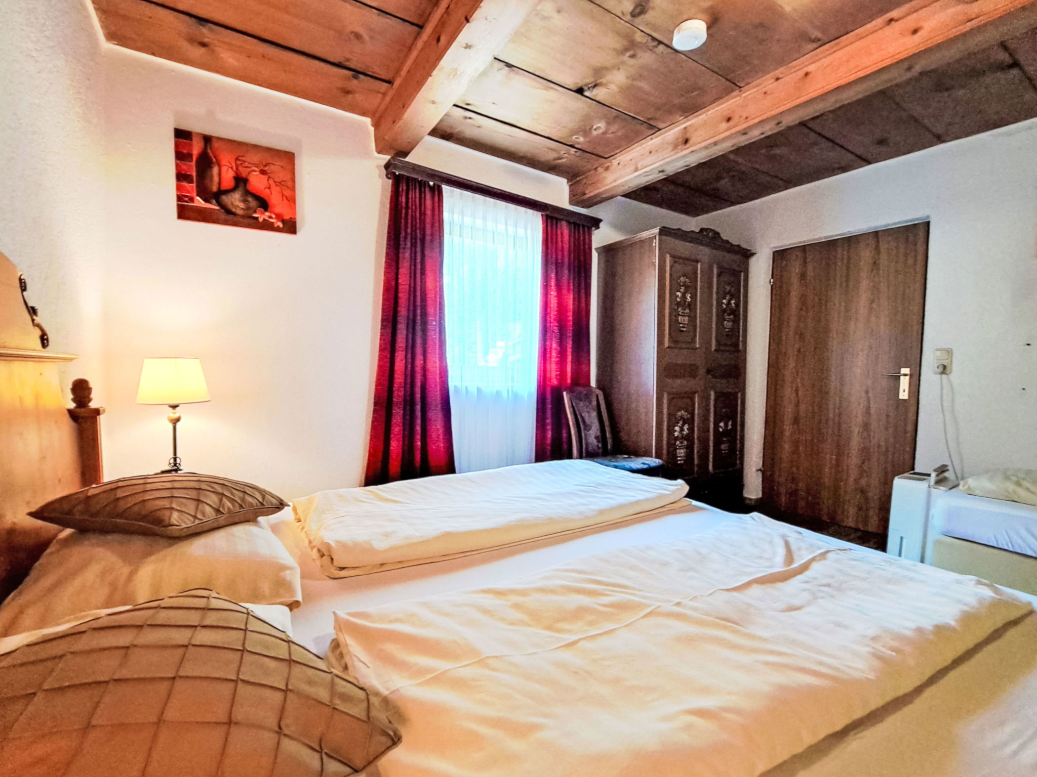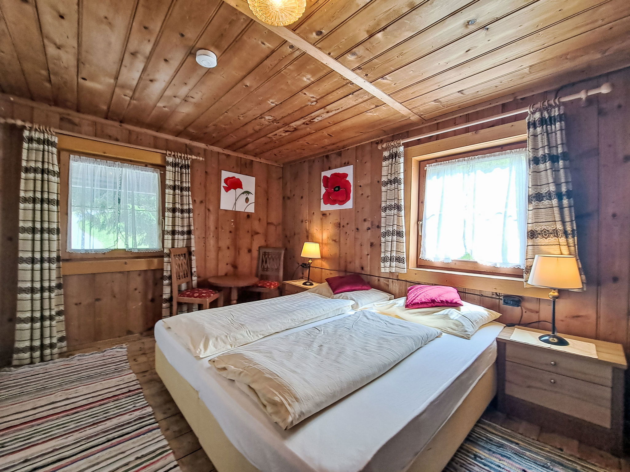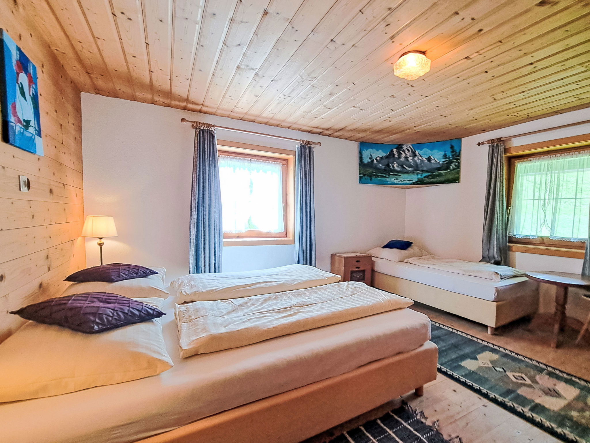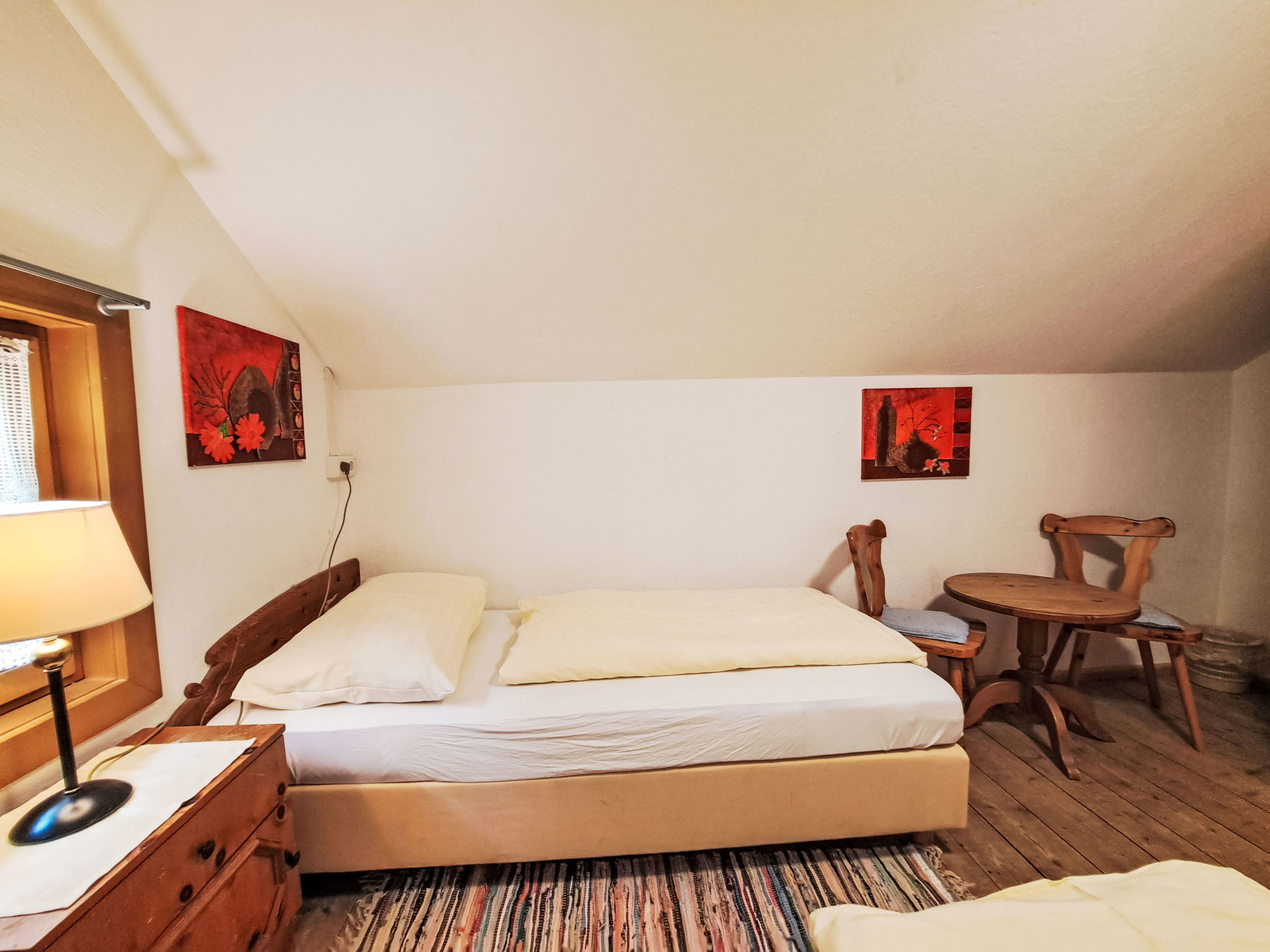 6-room house 170 m2 on 3 levels. Practical and cosy furnishings: living/dining room with dining nook, satellite TV, radio, CD-player, DVD and wood-burning stove. 1 room with 2 beds and 1 double bed. Kitchen (4 hot plates, oven, dishwasher, toaster, kettle, electric coffee machine) with dining nook and wood-burning stove. Shower, sep. WC. Upper floor: 1 room with 1 bed, 1 double bed and electric heater. 1 room with 1 bed and 1 double bed. Exit to the balcony. 1 double bedroom. Shower, sep. WC. 2nd upper floor: 1 room with sloping ceilings with 1 bed and 1 double bed. Shower, sep. WC. Heating not available in all rooms. Wooden floors, carpet. Balcony, terrace. Barbecue, deck chairs (5). Beautiful view of the countryside. Facilities: sauna, children's high chair, baby cot. Please note: non-smoking house. Maximum 2 pets/ dogs allowed.