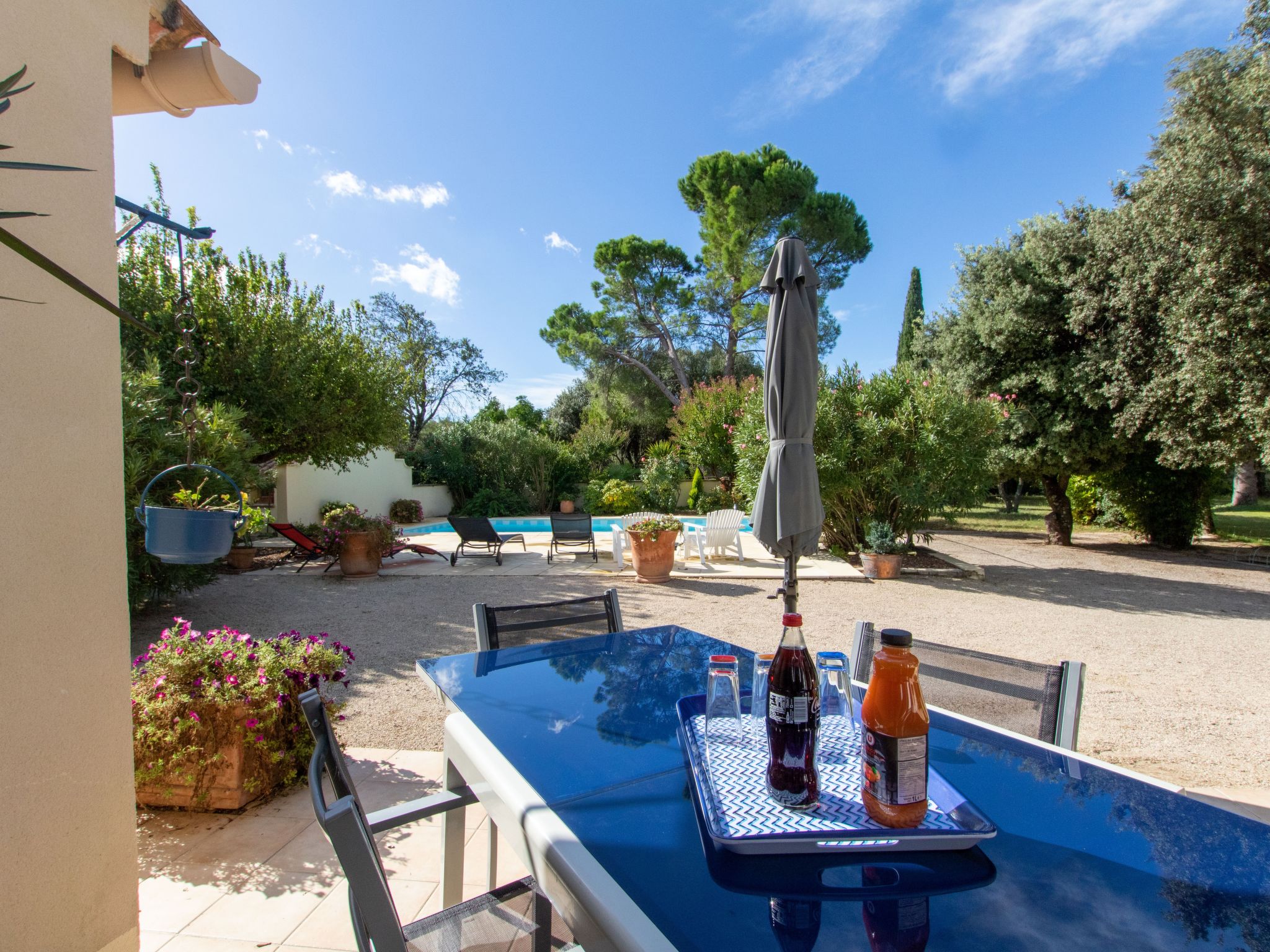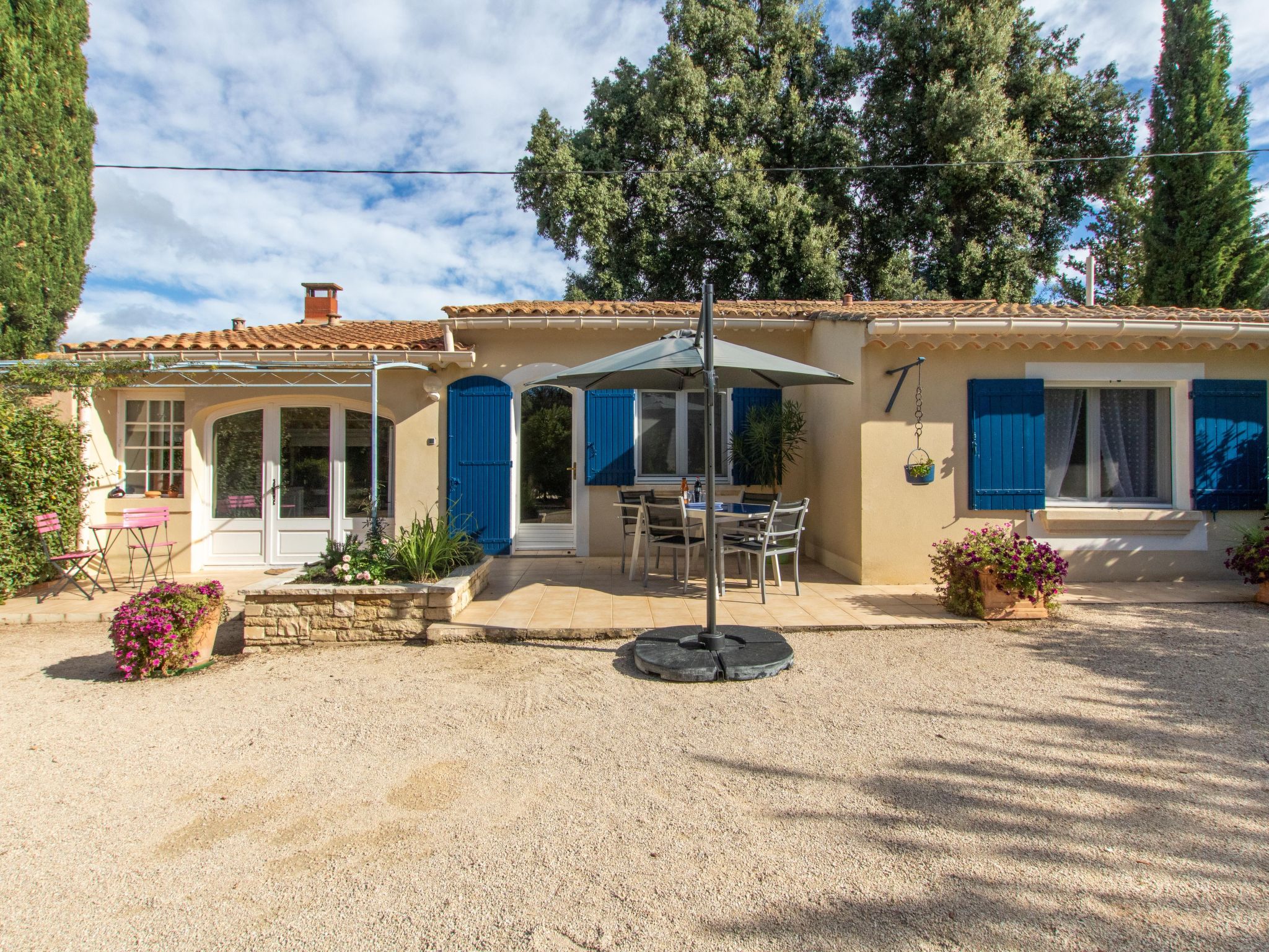 House "Les Amandiers". 3 km from the centre of Mazan, 7 km from the centre of Carpentras, 10 km from the centre of Villes-sur-Auzon. For shared use: property 1'500 m2 with trees. Private: swimming pool (8 x 4 m, depth 140 cm, seasonal availability: 01.Apr. - 30.Sep.) with alarm system. Parking on the premises. Shop 3 km. Please note: the owner lives on the same property.