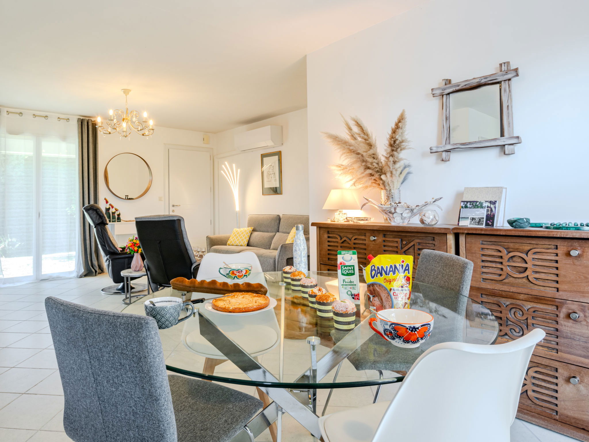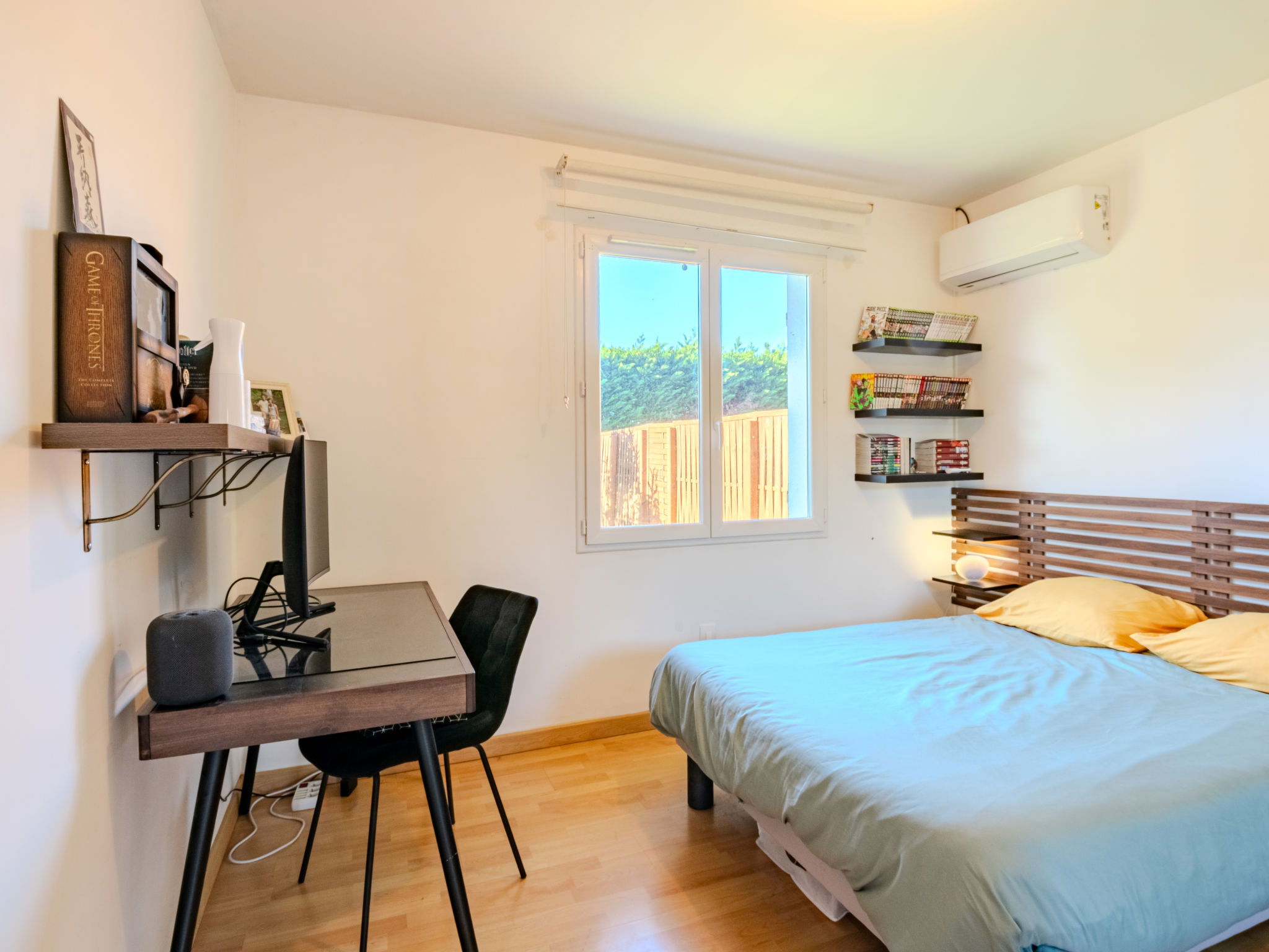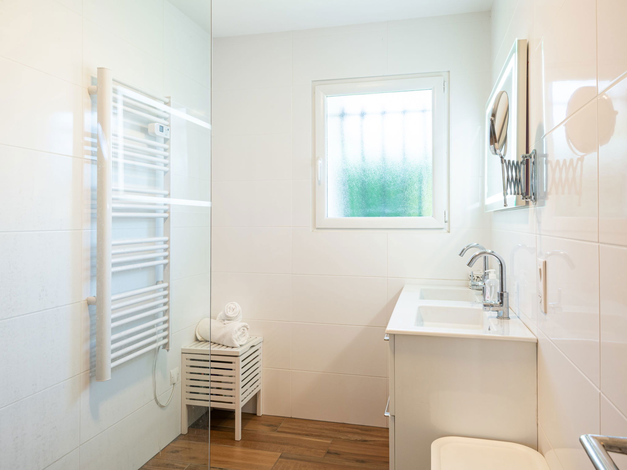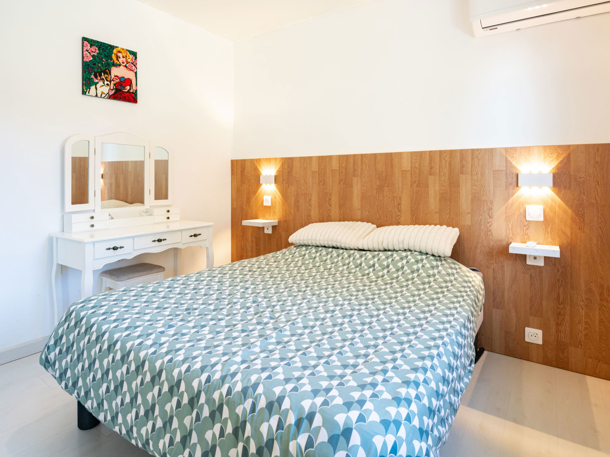 4-room house 90 m2. Beautiful and modern furnishings: living/dining room with TV (flat screen), air conditioning. 1 room with 1 french bed (1 x 140 cm, length 190 cm). 1 room with 1 french bed (1 x 140 cm, length 190 cm). 1 room with 1 french bed (1 x 140 cm, length 190 cm). Open kitchen (oven, dishwasher, 1 induction hot plates, 4 gas rings, toaster, kettle, microwave, freezer, electric coffee machine, Capsules for coffee machine (filtre)). Shower, sep. WC. Air-conditioning, forced-air heating. Large terrace 36 m2, east facing position. Terrace furniture, barbecue. Facilities: washing machine, dryer, iron, hair dryer. Internet (WiFi, free). Parking (fenced). Please note: non-smokers only. 1 small pet/ dog allowed. Smoke alarm. Offer by a private individual according to Art. 155, IV of CGI.
