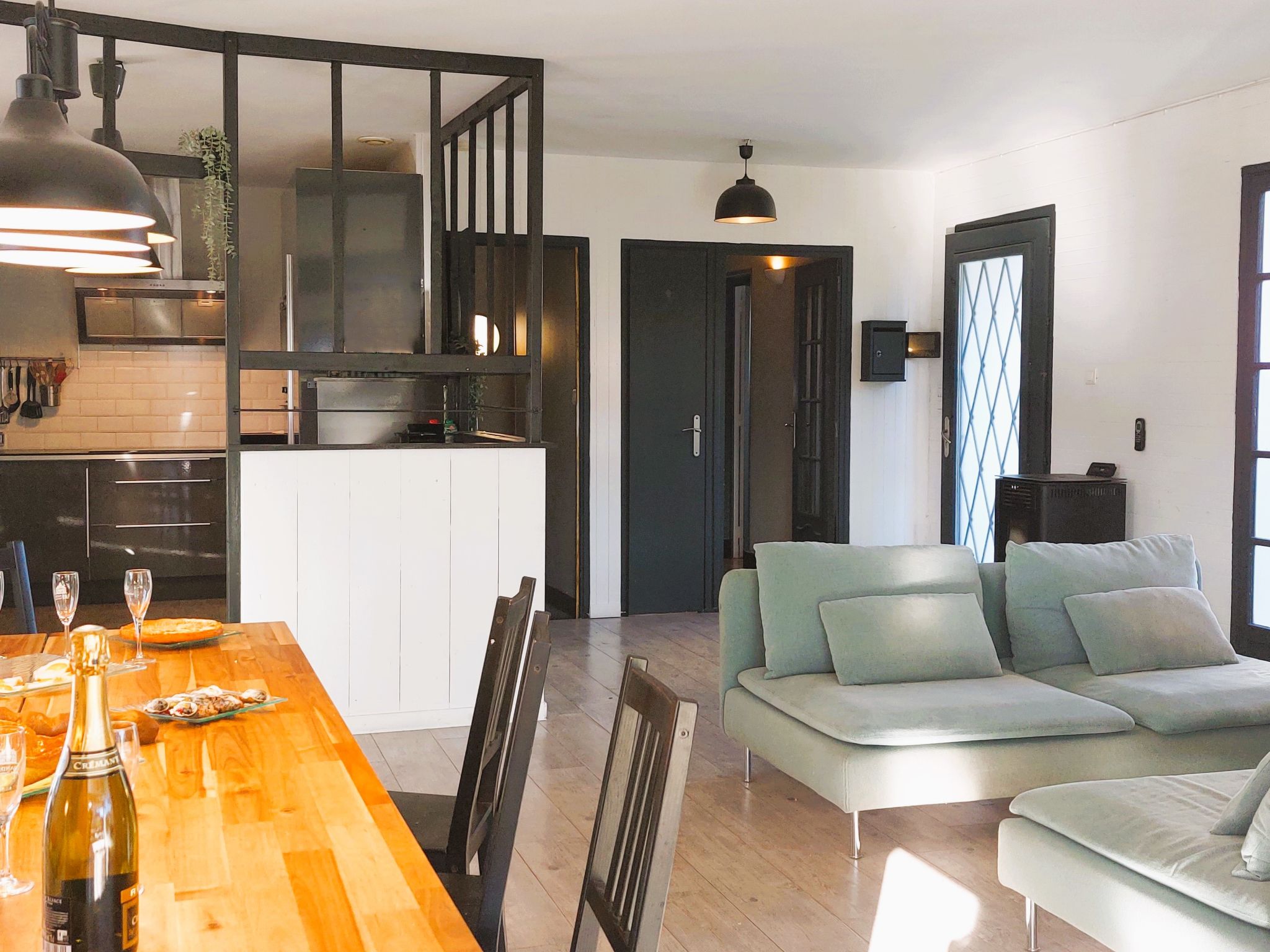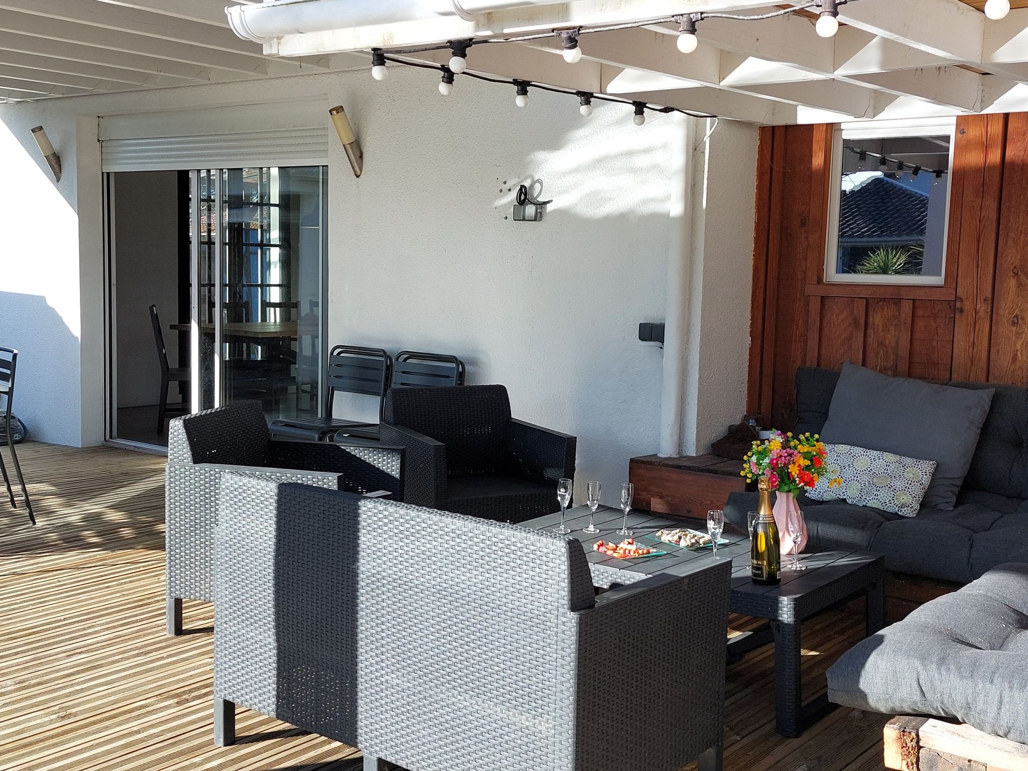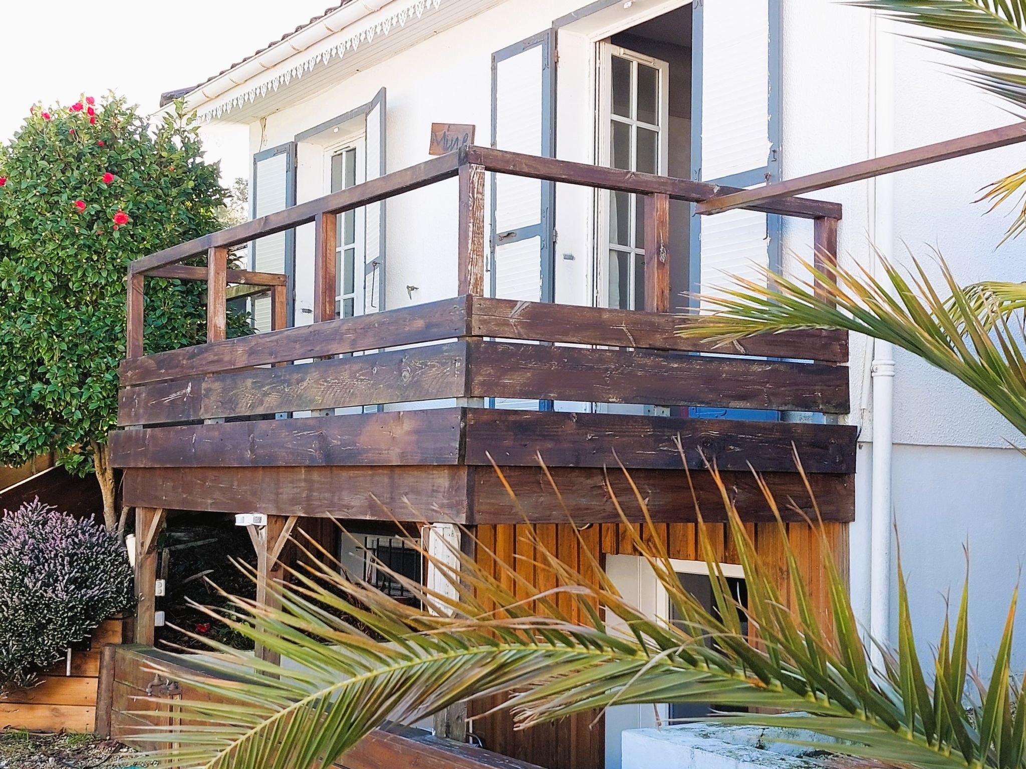 "Mine", 5-room house 120 m2 on 1st floor, south-east facing position. Comfortable furnishings: living/dining room with TV (flat screen). Exit to the terrace. 1 room with 1 french bed (1 x 140 cm, length 190 cm). 1 room with 1 french bed (1 x 140 cm, length 190 cm). 1 room with 1 french bed (1 x 140 cm, length 190 cm). 1 room with 2 beds (90 cm, length 190 cm). Open kitchen (1 hot plate, dishwasher, 4 gas rings, toaster, kettle, microwave, electric coffee machine, Capsules for coffee machine (filtre)). Shower, sep. WC. Electric heating, forced-air heating. Wooden floors. Large terrace 25 m2, south facing position and, east facing position. Terrace furniture, barbecue. Facilities: washing machine. Internet (WiFi, free). Parking (fenced 3 cars). Please note: non-smokers only. 1 pet/ dog allowed. Smoke alarm. Offer by a private individual according to Art. 155, IV of CGI.
