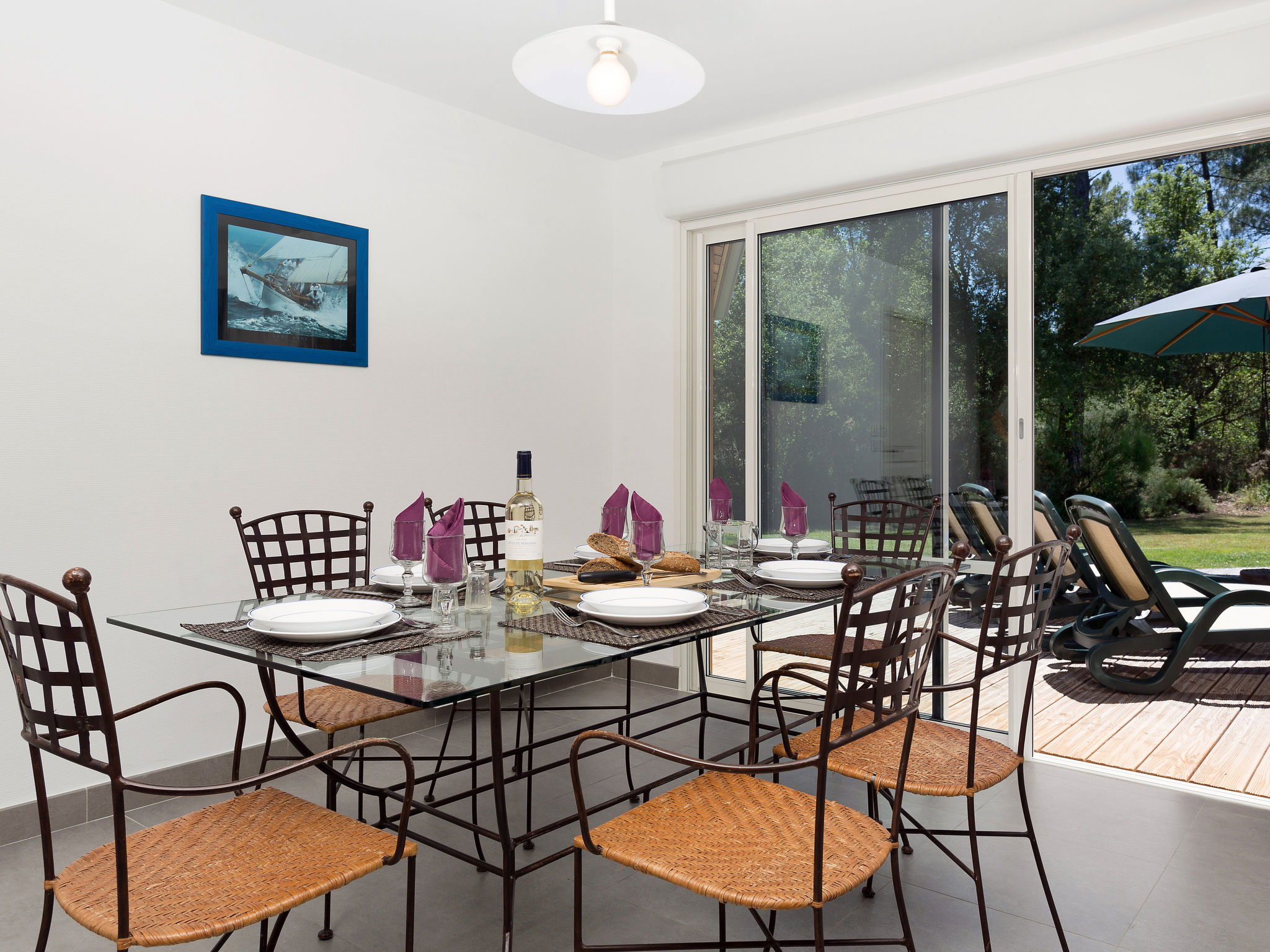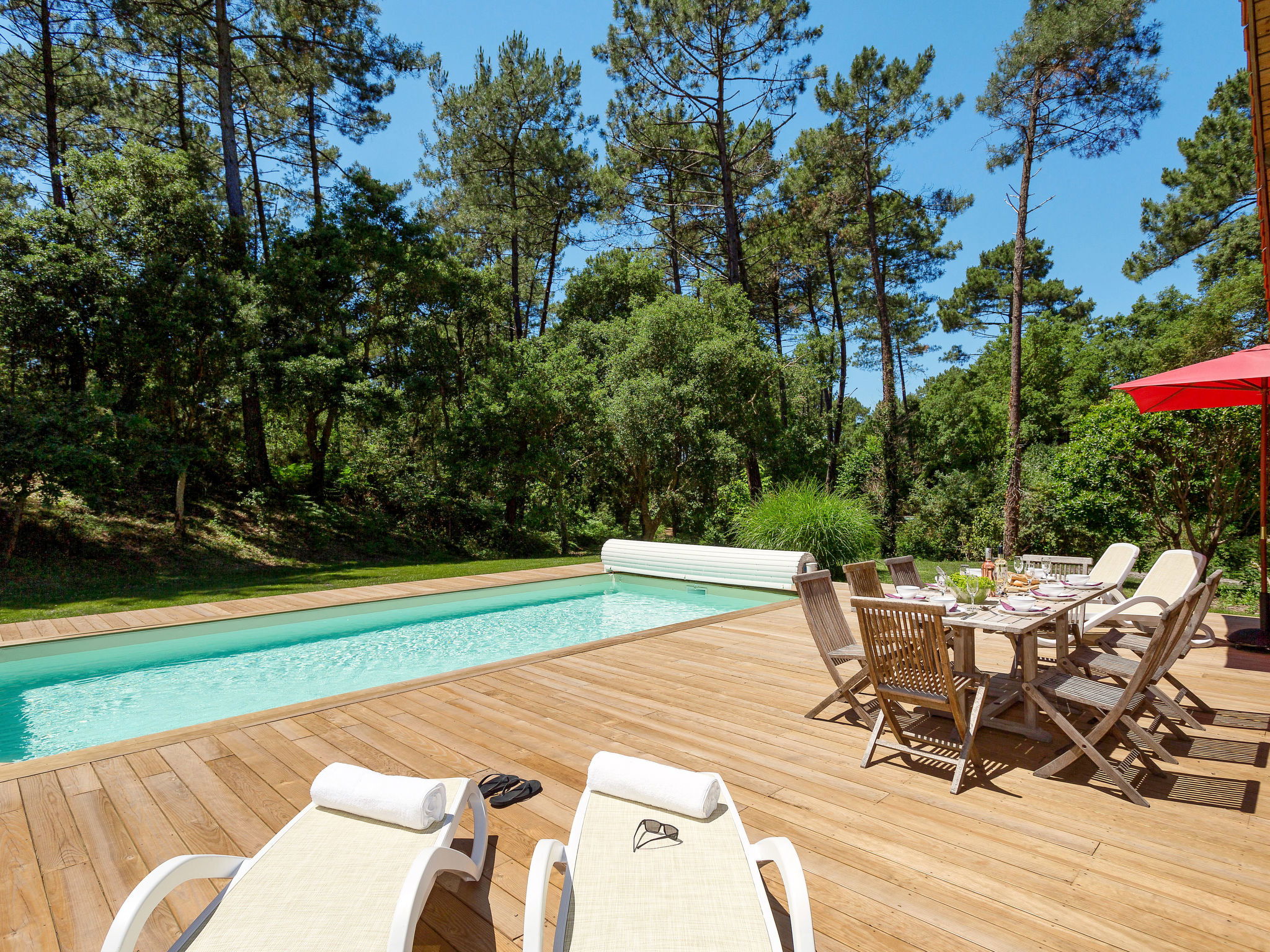 Beautiful, comfortable resort "Clairière aux Chevreuils". 29 houses in the resort. 2 km from the centre of Moliets-Bourg, 8 km from the centre of Vieux Boucau, 35 km from the centre of Dax, 1.8 km from the sea. Private: property 600 m2 with lawn and trees, swimming pool (seasonal availability: 23.May. - 03.Oct.). In the complex: reception, WiFi. Bread roll service. Parking on the premises. Shop 2 km, supermarket 6 km, railway station "Dax" 35 km, sandy beach 2.5 km. Marina 30 km, golf course (18 hole) 1.5 km. Please note: the photograph shows a typical example. The holiday properties may differ in living space, floorplan, equipment and furnishing. A bathrobe is provided per person. A welcome basket with drinks is also provided per house.