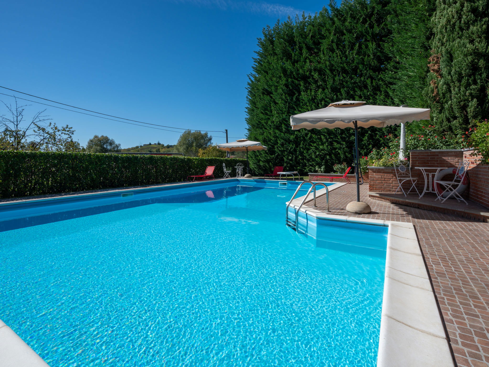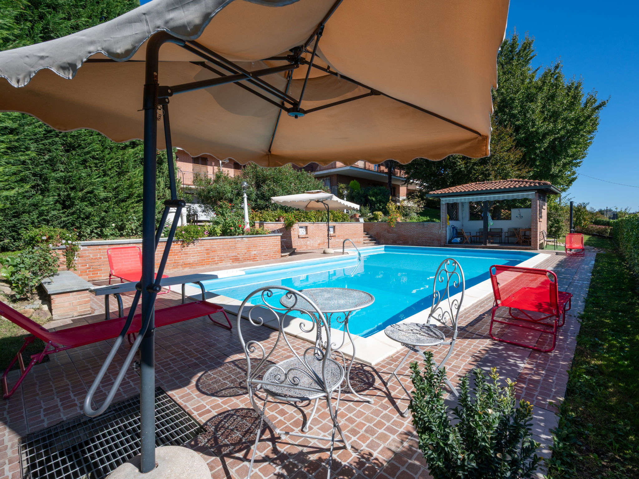 Cosy, comfortable single-family house. In the centre of Montegrosso D'Asti. For shared use: courtyard. Private: garden 150 m2 (fenced), swimming pool (7 x 13 m, depth 130 - 245 cm, seasonal availability: 15.May. - 06.Oct.). Pool house with fridge, garden furniture, barbecue. In the house: washing machine (extra). Parking at the house. E-charging station. Shop 400 m, restaurant 450 m, bar 400 m, bus stop 750 m, railway station 450 m. Nearby attractions: Asti 13 km, Alba 30 km. Please note: the owner lives on the same property. Main road 30 m from the property.