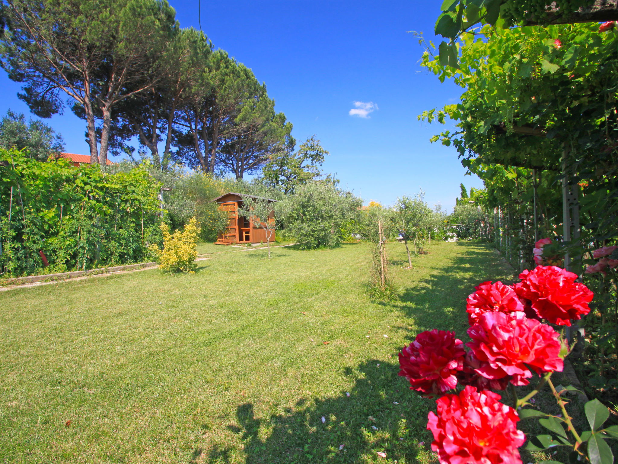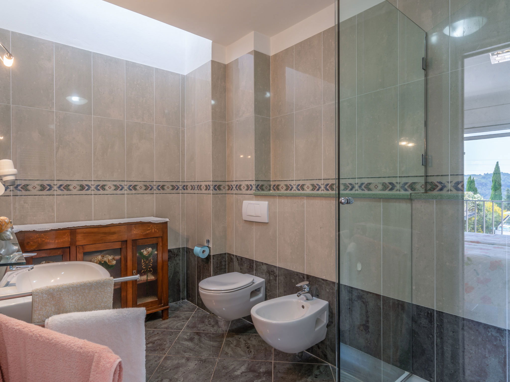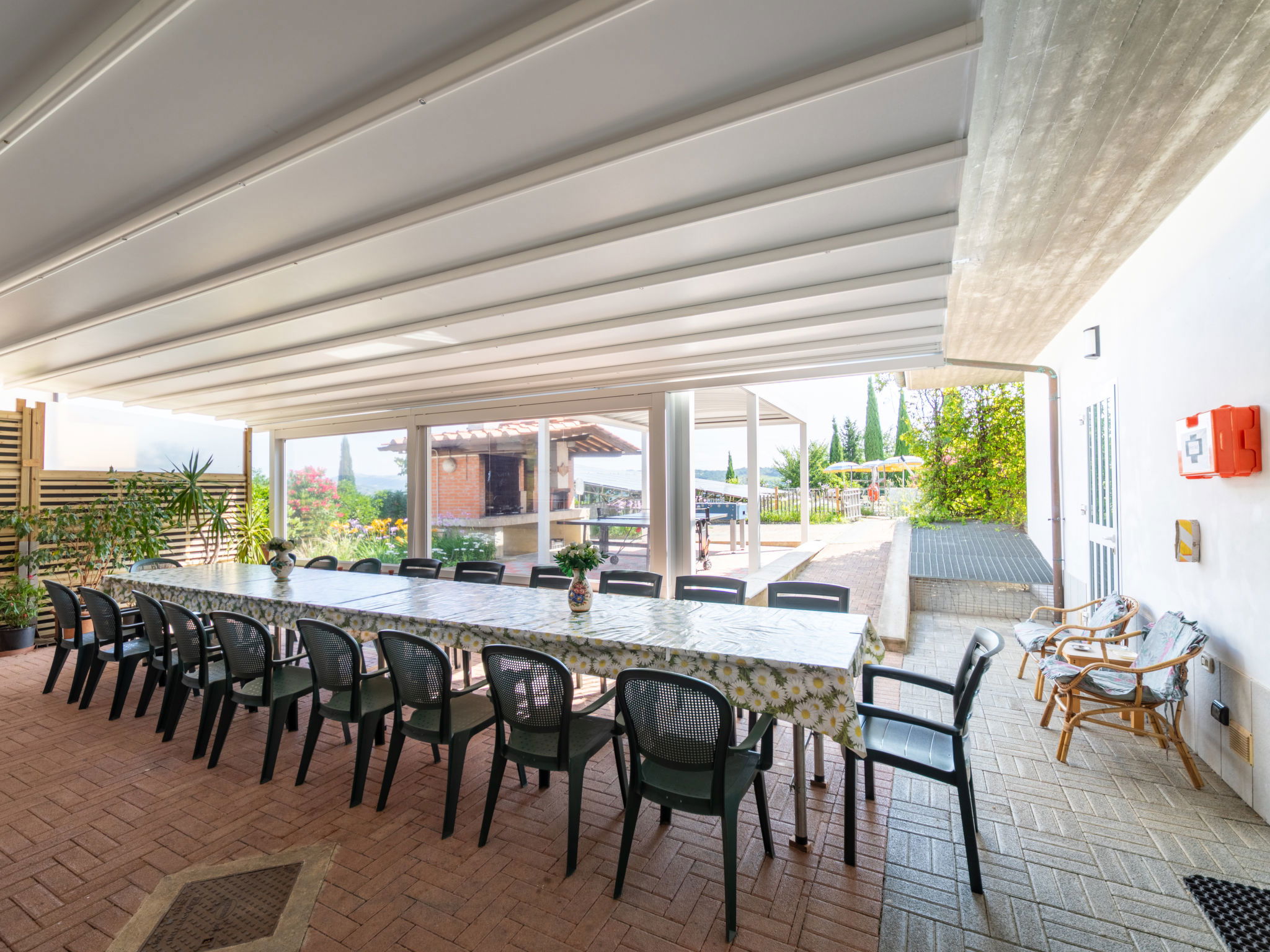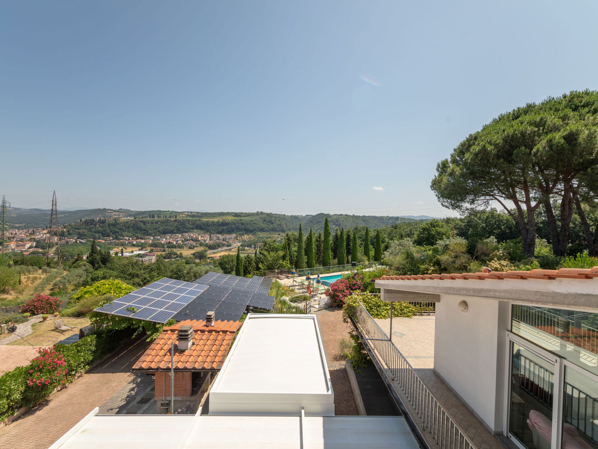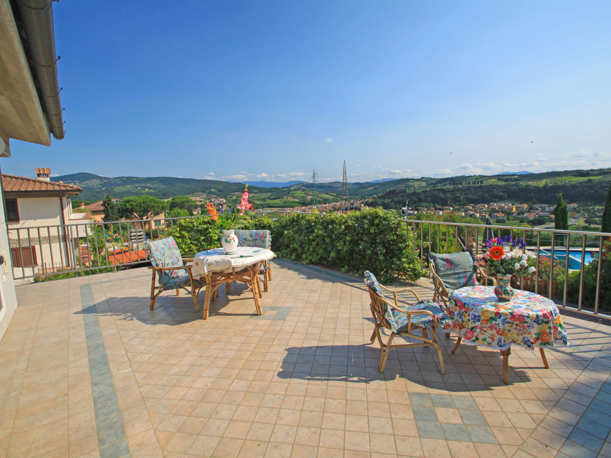 Villa "La Rosa", 250 m a.s.l., semi-detached, built in 2005, surrounded by trees, meadows and vineyards. 2 km from the centre of Montelupo Fiorentino, 22 km from the centre of Firenze, 60 km from the centre of Pisa, in a sunny position on a slope, 70 km from the sea. Private: terraced garden, 2'000 m2 (fenced), swimming pool (12 x 6 m, depth 150 cm, seasonal availability: 03.May. - 20.Sep. pool opening hours: 10:00-19:00). Outdoor shower, table tennis, basketball, garden furniture, barbecue. In the house: central heating system, heating available only from 01.Nov. - 15.Apr.. Parking on the premises. E-charging station. Shop 1 km, grocery 1 km, supermarket 1.8 km, railway station "Montelupo Fiorentino" 2 km, thermal baths "Gambassi Terme" 30 km. Golf course (10 hole) 4 km. Nearby attractions: San Miniato 18 km, San Casciano in Val di Pesa 20 km, Certaldo 26 km, San Gimignano 38 km. 1 pool towel per person provided free of charge. At guests' disposal there is a machine for filtered drinking water at room temperature or filtered cold and sparkling. Electric car battery charger 20 kw type 2.