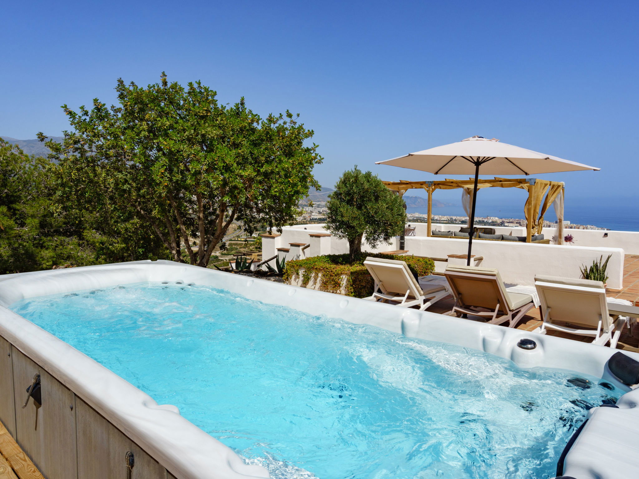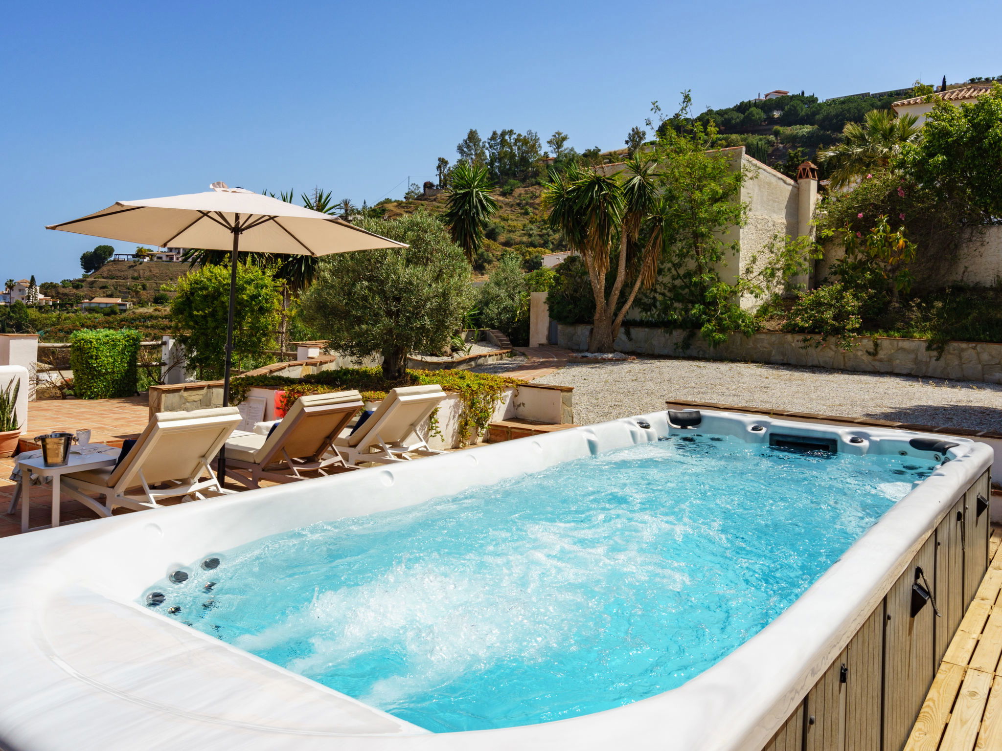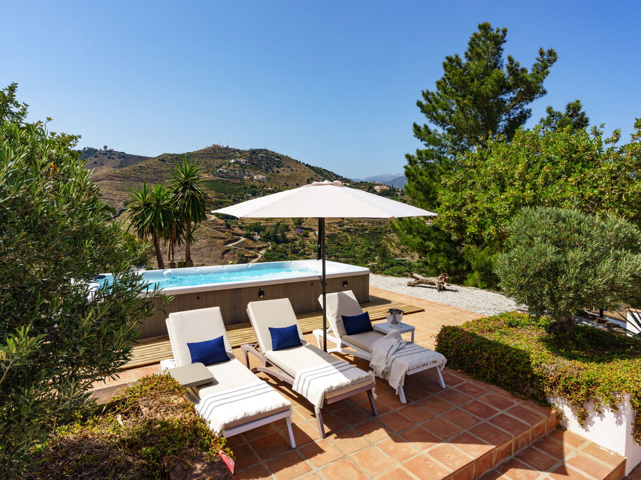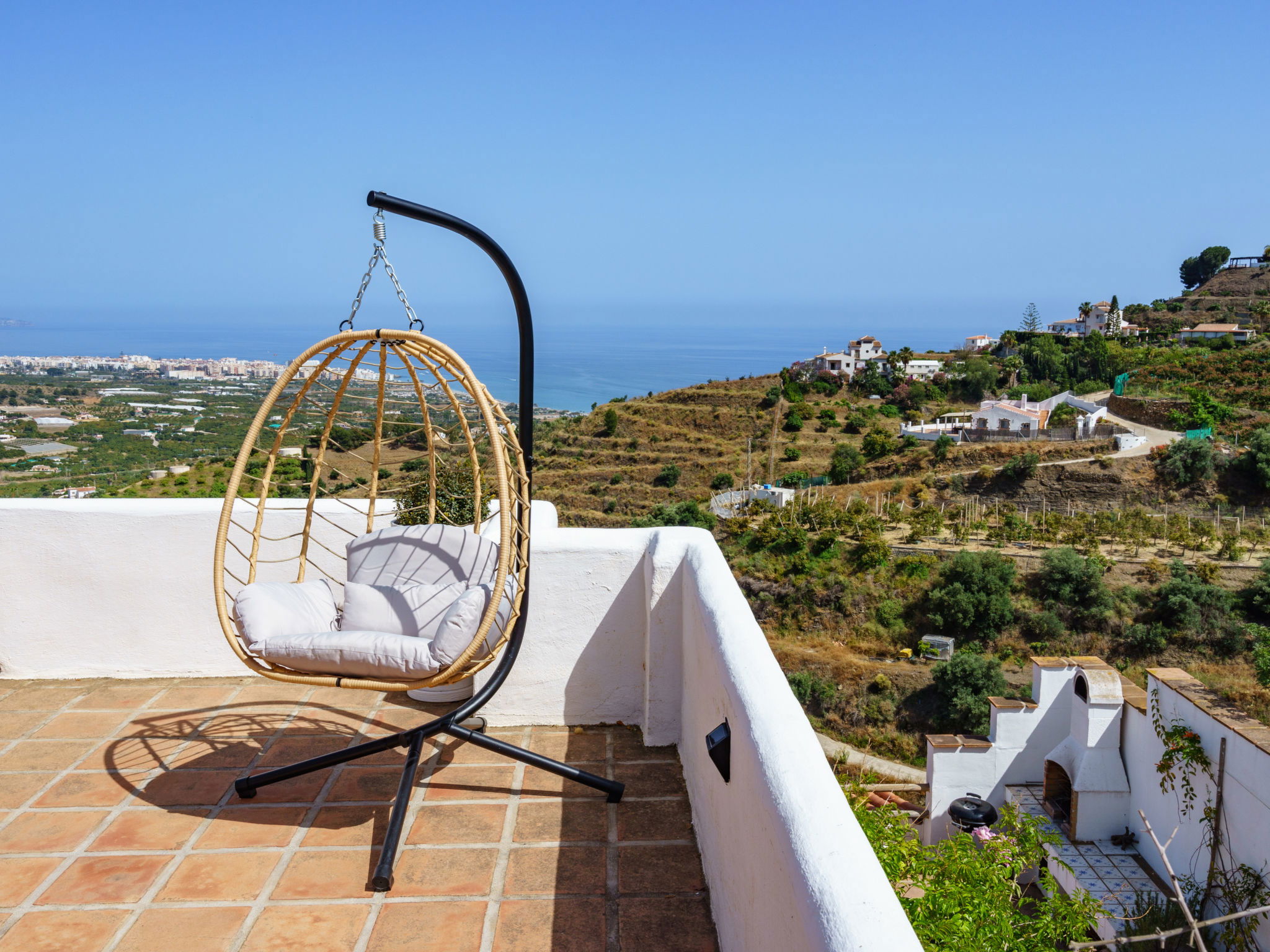 Beautiful, comfortable cottage "Camelia Blanca", surrounded by trees and fields. Outside the resort, 4 km from the centre of Nerja, 4 km from the sea, 4 km from the beach. Private: large terraced garden, orchard 2'000 m2. Outdoor shower, hot tub, pool house with WC, arbour, pergola, barbecue, parking (for 3 cars). Shop 4 km, grocery 4 km, shopping centre 23 km, restaurant 40 km, bakery 4 km, bus stop "Torrox" 4 km, railway station "Malaga" 55 km, ferry "Malaga" 50 km, pebble beach "Playazo" 3.5 km, diving center 4 km. Sports harbour 17 km, golf course (17 hole) 23 km. Nearby attractions: Frigiliana, Competa, Maro, Cuevas de Nerja, Torre del Mar, Almuñecar. Well-known ski regions can easily be reached: Sierra Nevada. Hiking paths: Sierra Almijara, Sierra Tejeda. Please note: car recommended. The owner does not accept any youth groups. Loading and unloading of baggage is possible at the holiday house.