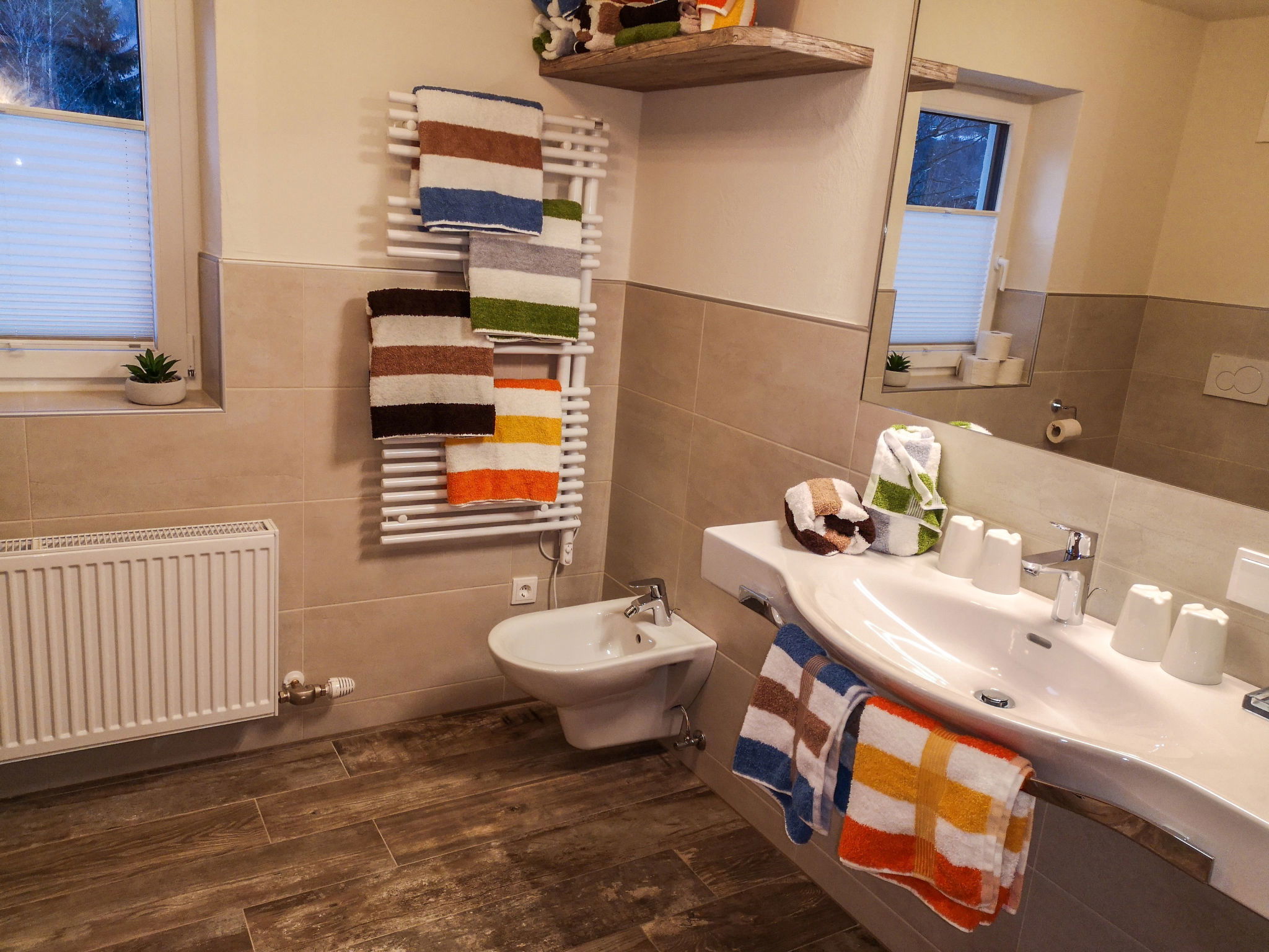7-room house 200 m2 on 2 levels. Comfortable and cosy furnishings: entrance hall. Living room with panoramic window with 1 double sofabed and cable TV. Exit to the terrace. 1 double bedroom with hand-basin and cable TV. Kitchen (oven, dishwasher, 4 induction hot plates, toaster, kettle, microwave, freezer, electric coffee machine, Capsules for coffee machine (Nespresso) extra) with dining table. Shower/bidet/WC, sep. WC. Upper floor: 1 double bedroom with hand-basin and cable TV. Exit to the balcony. 1 room with 1 bed, 1 double bed and cable TV. Exit to the balcony. 1 room with 2 beds. Kitchen (oven, 4 ceramic glass hob hotplates, toaster, kettle, microwave, electric coffee machine). Exit to the balcony. Shower, shower/WC, sep. WC, double hand-basin. Wooden floors, natural stone floors. Terrace. Terrace furniture. Maximum 1 pet/ dog allowed. If 6 persons booked, one bedroom will be closed. When there are less than the maximum number of guests staying at the property, not all of the housing units will be available for use. 50641-001237-2020