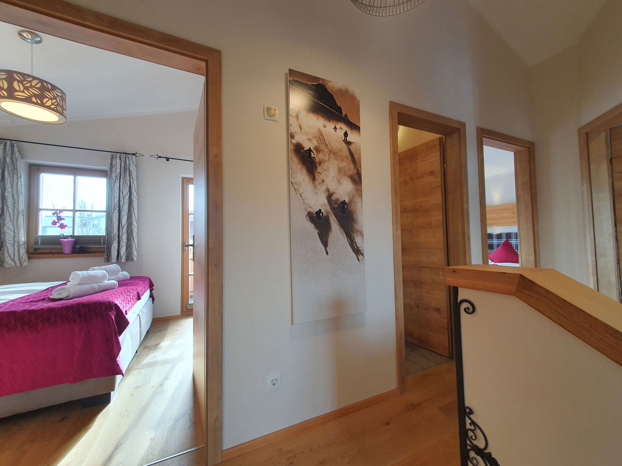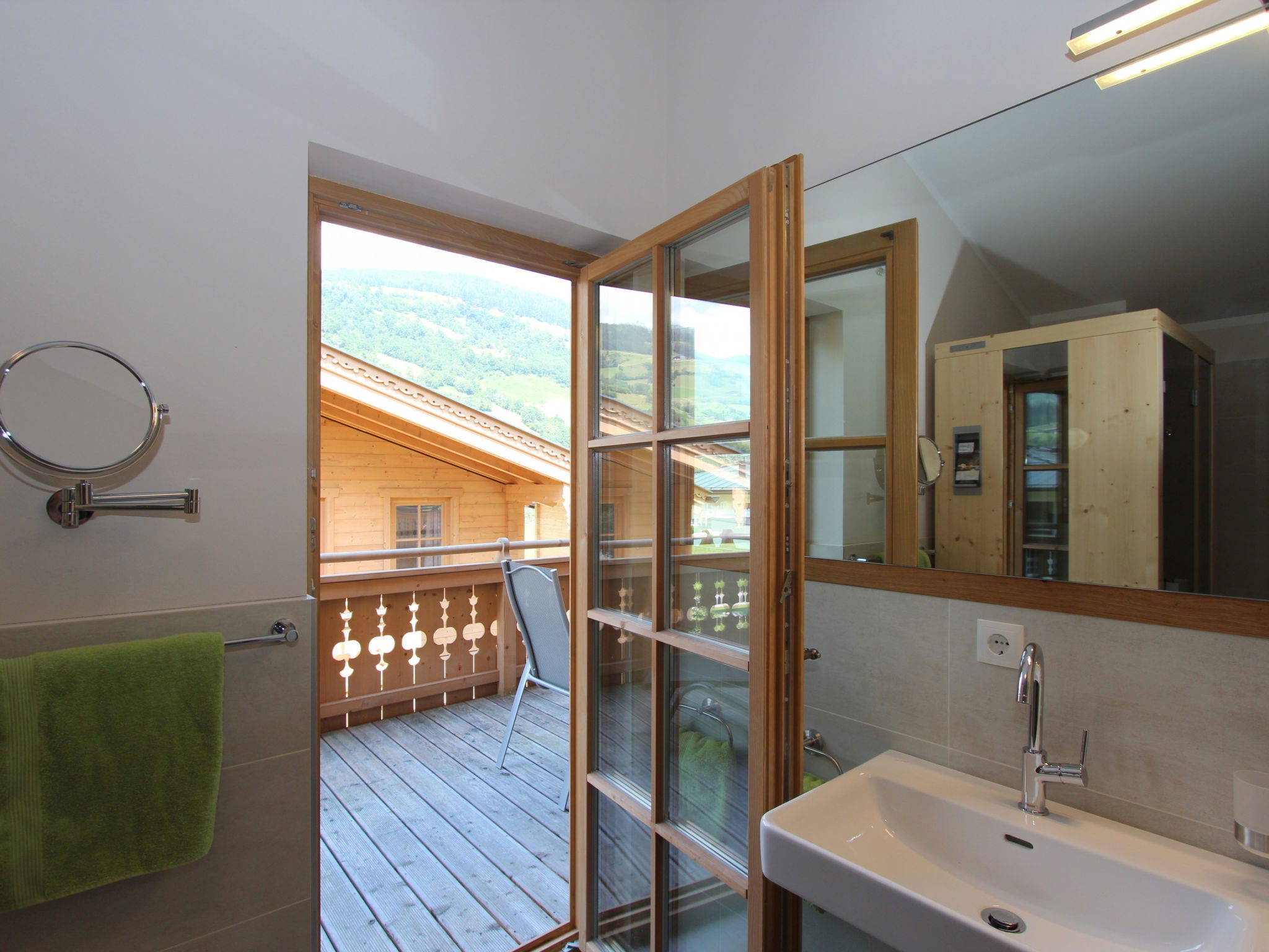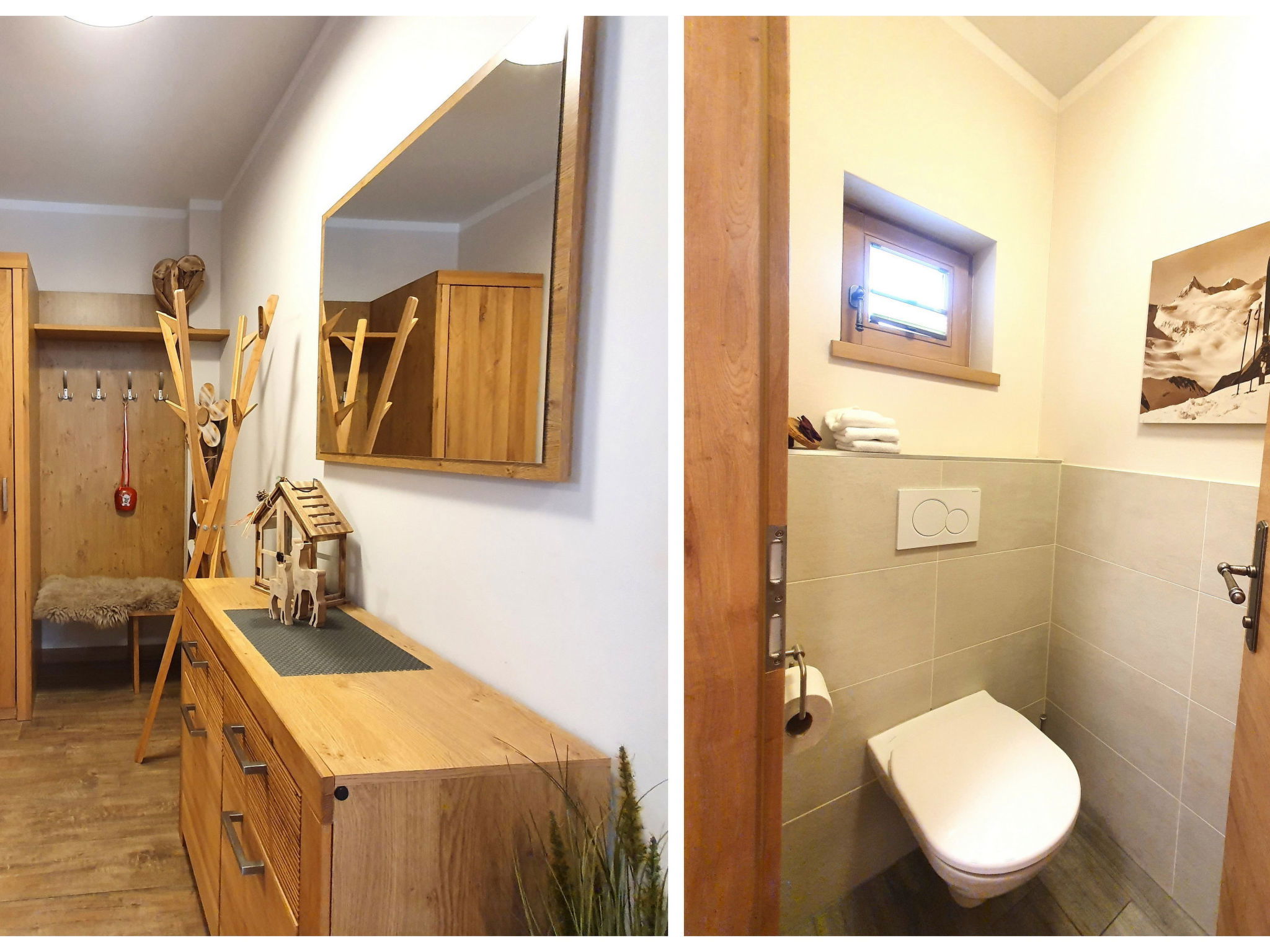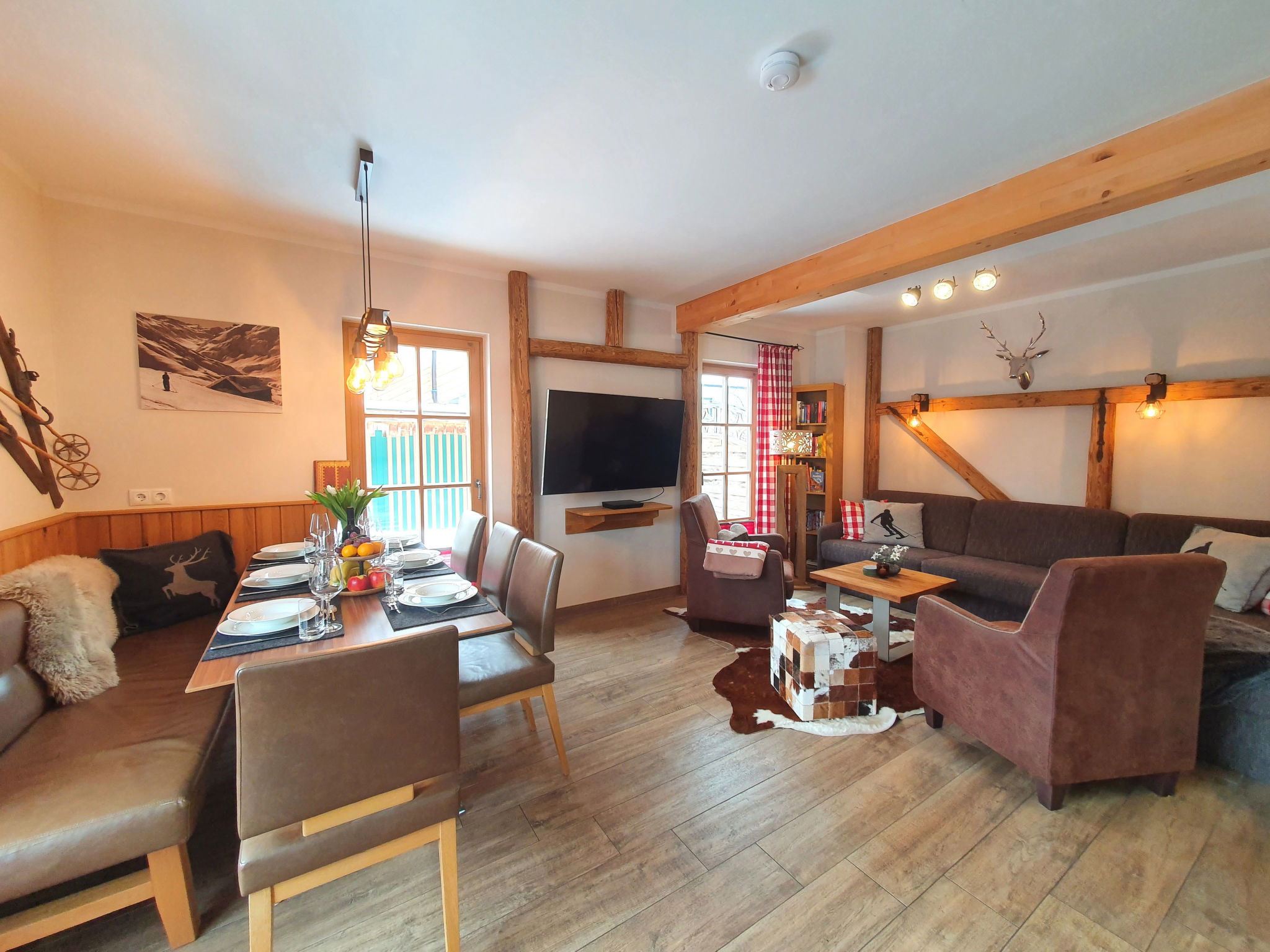 "5_Nid - Chalet Salzburg", 4-room house 110 m2. Object suitable for 8 adults. Living room with 1 sofabed, 1 pull-out bed and TV. 1 room with 1 french bed and TV. 1 room with 1 french bed. 1 room with 1 x 2 bunk beds. Open kitchen (oven, dishwasher, 4 induction hot plates, toaster, kettle, microwave, freezer, electric coffee machine). 2 showers/WC. Balcony, terrace. Barbecue. View of the mountains and the garden. Facilities: washing machine, dryer, iron, hair dryer. Internet (WiFi, free). Parking (2 cars). Please note: non-smokers only. Maximum 3 pets/ dogs allowed. Smoke alarm.