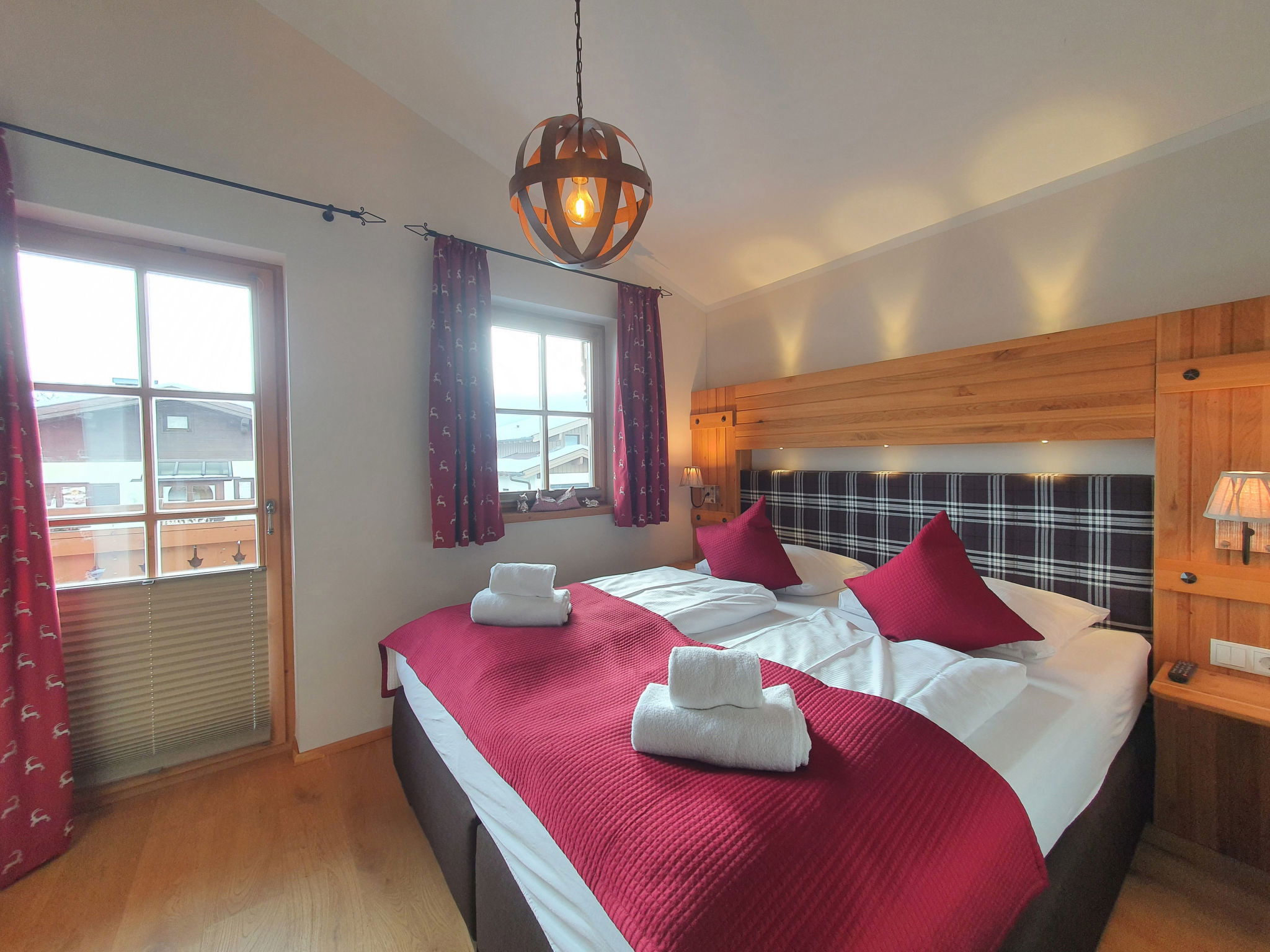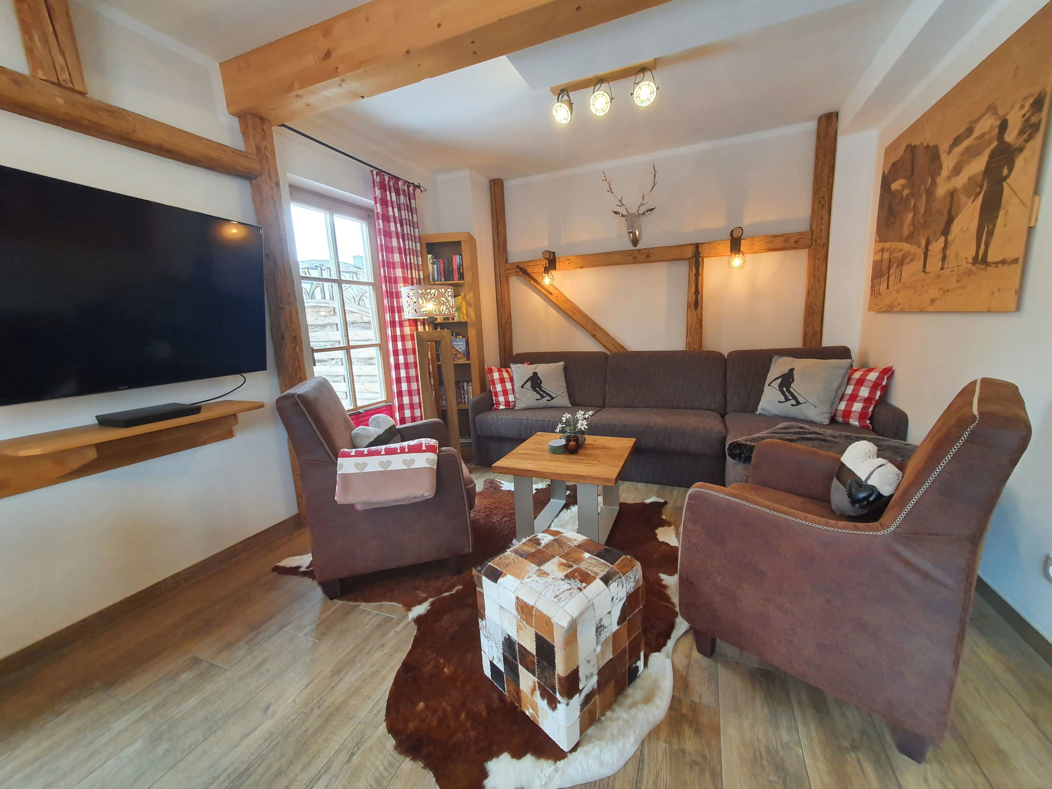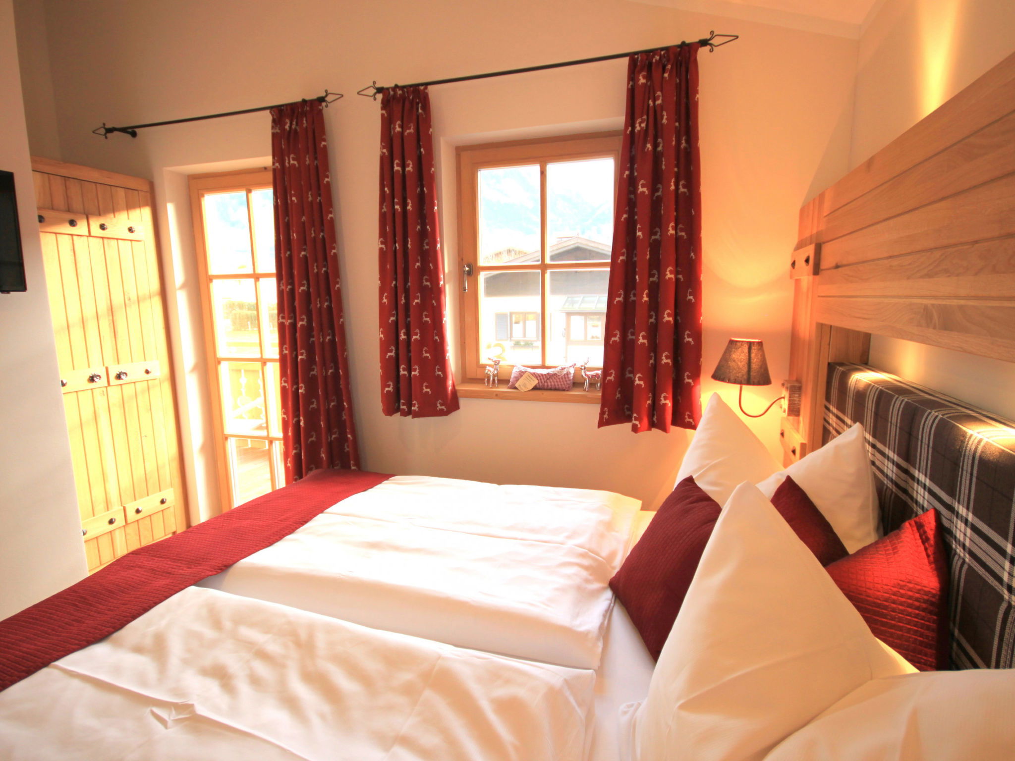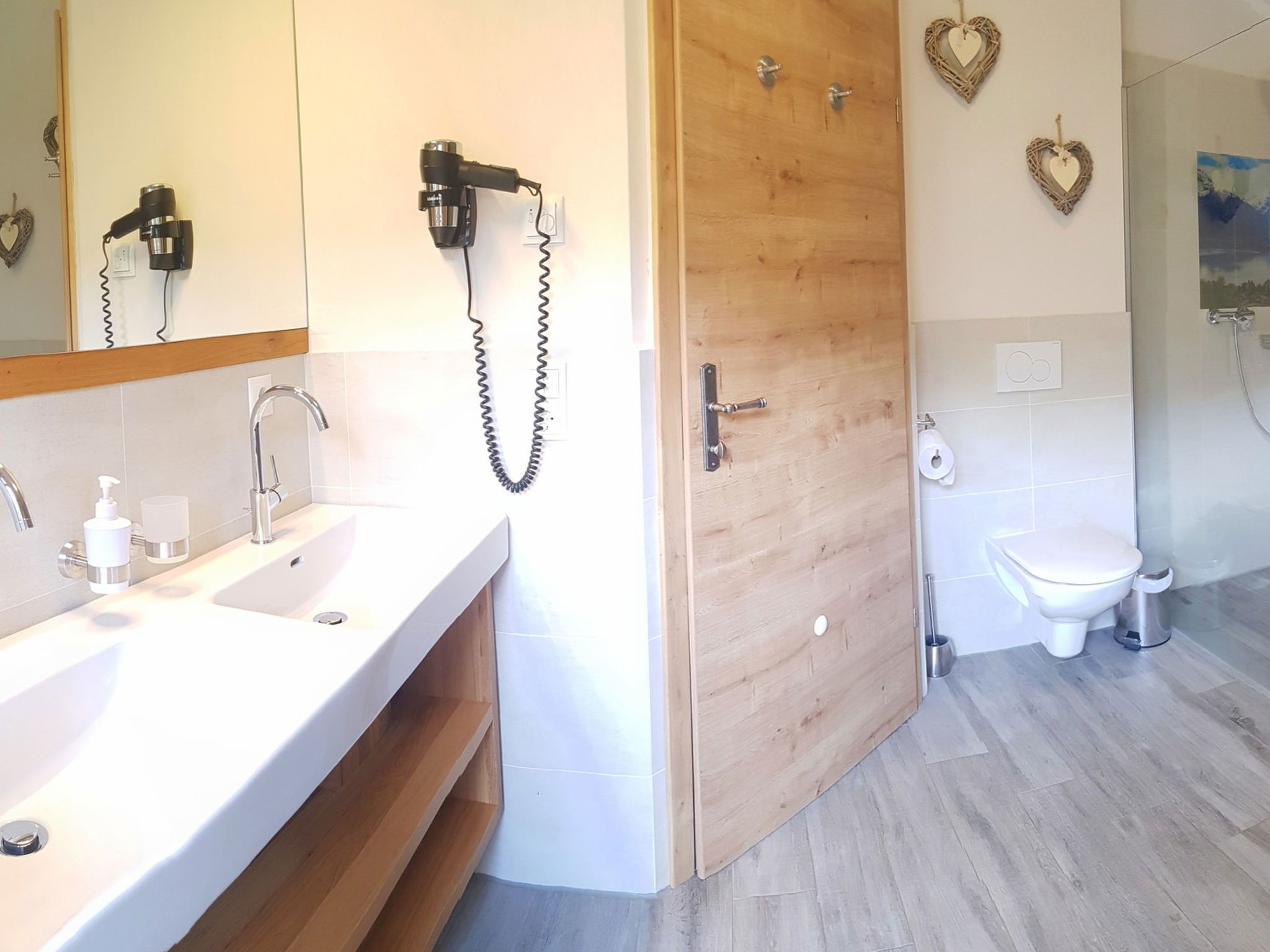 "5_Nid - Chalet Salzburg", 4-room house 110 m2. Object suitable for 8 adults. Living room with 1 sofabed, 1 pull-out bed and TV. 1 room with 1 french bed and TV. 1 room with 1 french bed. 1 room with 1 x 2 bunk beds. Open kitchen (oven, dishwasher, 4 induction hot plates, toaster, kettle, microwave, freezer, electric coffee machine). 2 showers/WC. Balcony, terrace. Barbecue. View of the mountains and the garden. Facilities: washing machine, dryer, iron, hair dryer. Internet (WiFi, free). Parking (2 cars). Please note: non-smokers only. Maximum 3 pets/ dogs allowed. Smoke alarm.