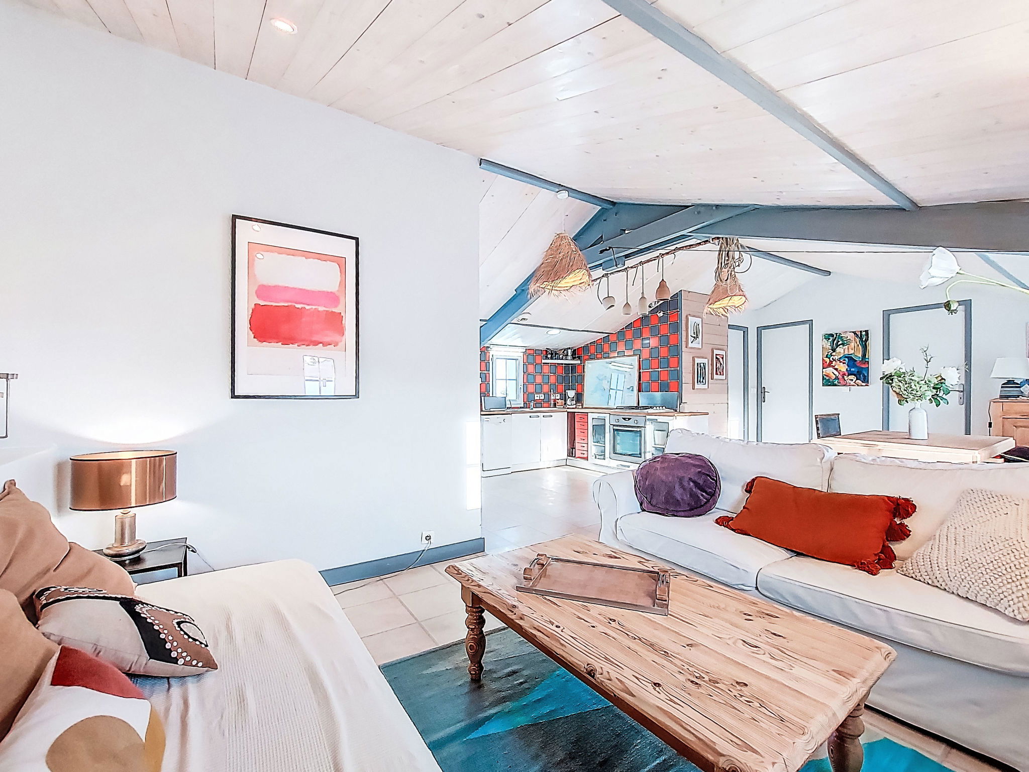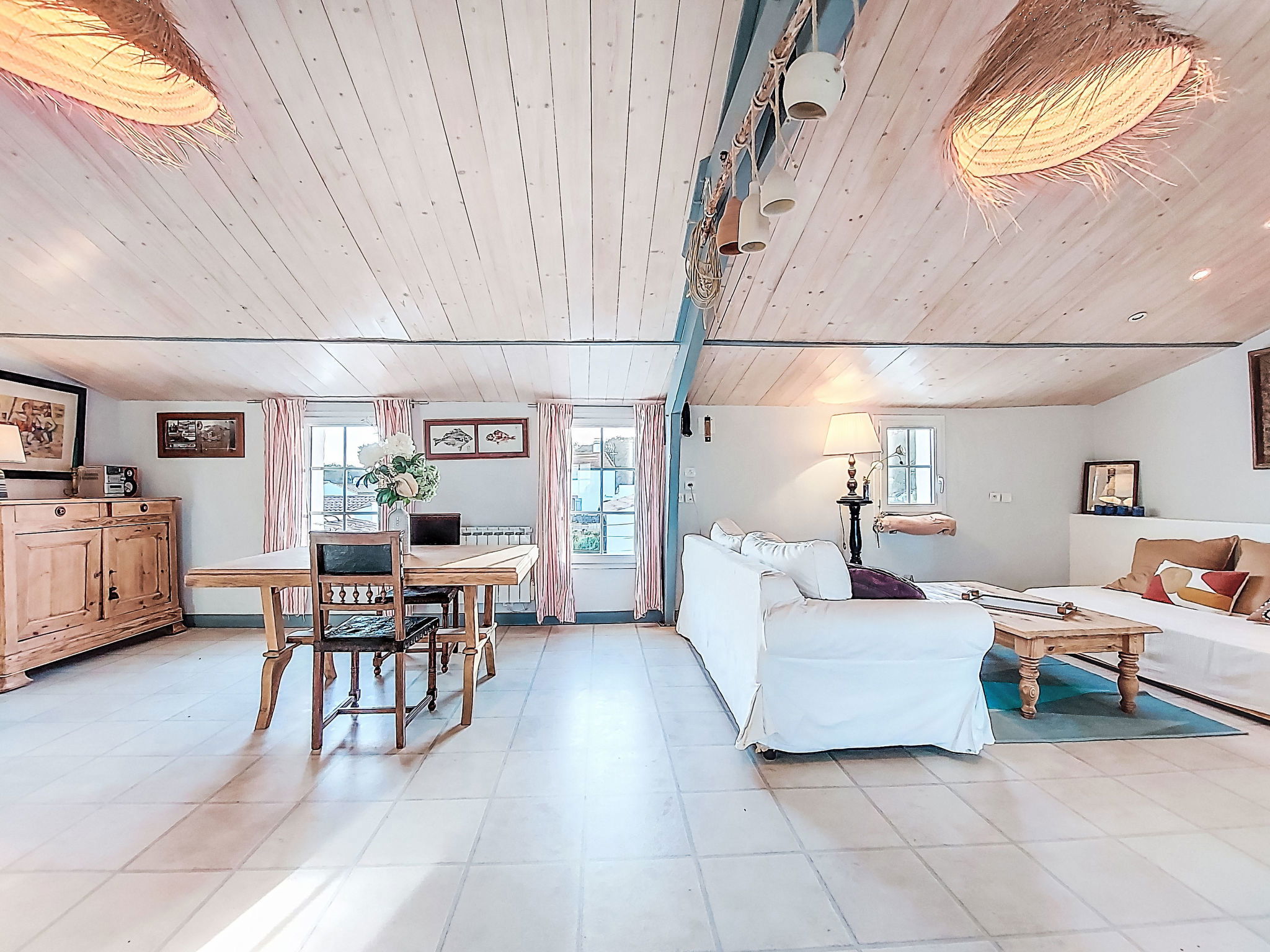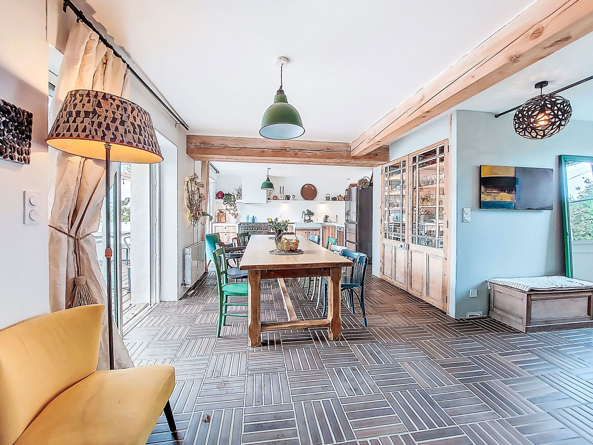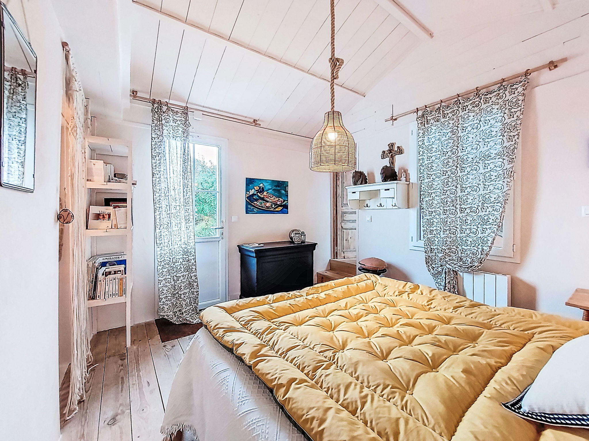 6-room house 165 m2. Renovated, very beautiful furnishings: large living/dining room with Scandinavian wood stove (only for decoration), TV (flat screen). Exit to the terrace. 1 room with 1 french bed (160 cm, length 200 cm), shower/WC. 1 room with 1 french bed (160 cm, length 200 cm), shower. Office. Open kitchen (oven, dishwasher, 5 gas rings, toaster, kettle, microwave, freezer, electric coffee machine). 2 sep. WC's. Upper floor: (exterior staircase) living/sleeping room with 2 beds (90 cm, length 190 cm), kitchen corner. 1 room with sloping ceilings with 1 french bed (140 cm, length 190 cm). 1 room with sloping ceilings with 2 beds (90 cm, length 190 cm). Shower, sep. WC. Electric heating. Large terrace, south facing position. Terrace furniture, barbecue, deck chairs (4). Facilities: washing machine, dryer, iron, baby cot for up to 2 year olds, hair dryer. Internet (WiFi, free). Parking (2 cars). Please note: non-smoking house. Maximum 2 pets/ dogs allowed. Smoke alarm. No internal connecting door between the floors. Offer by a private individual according to Art. 155, IV of CGI.