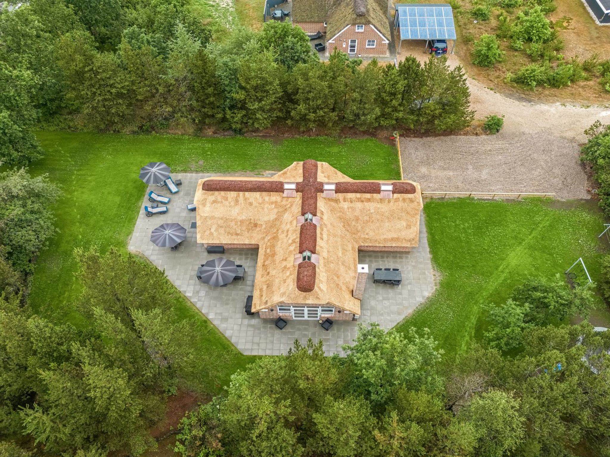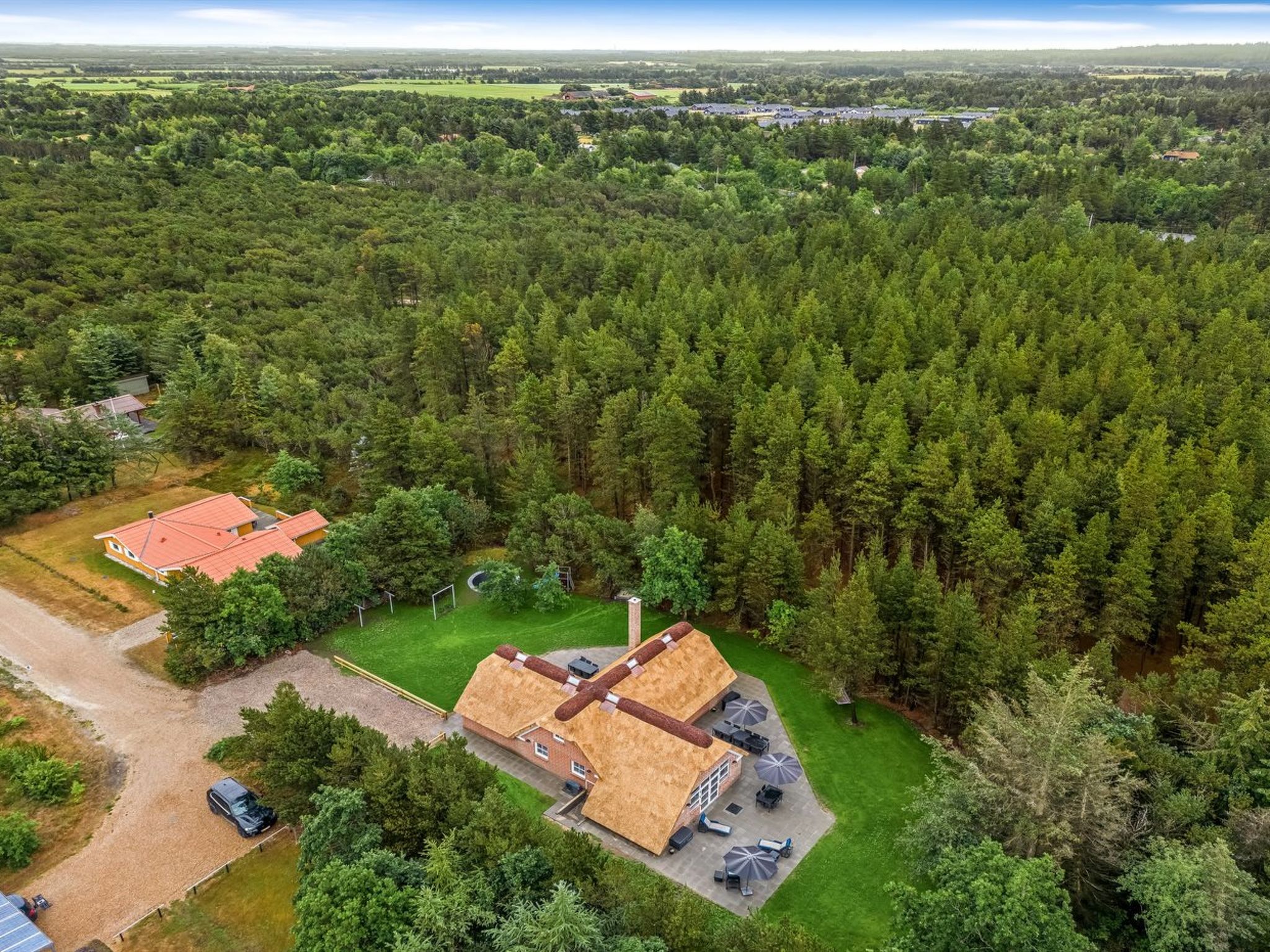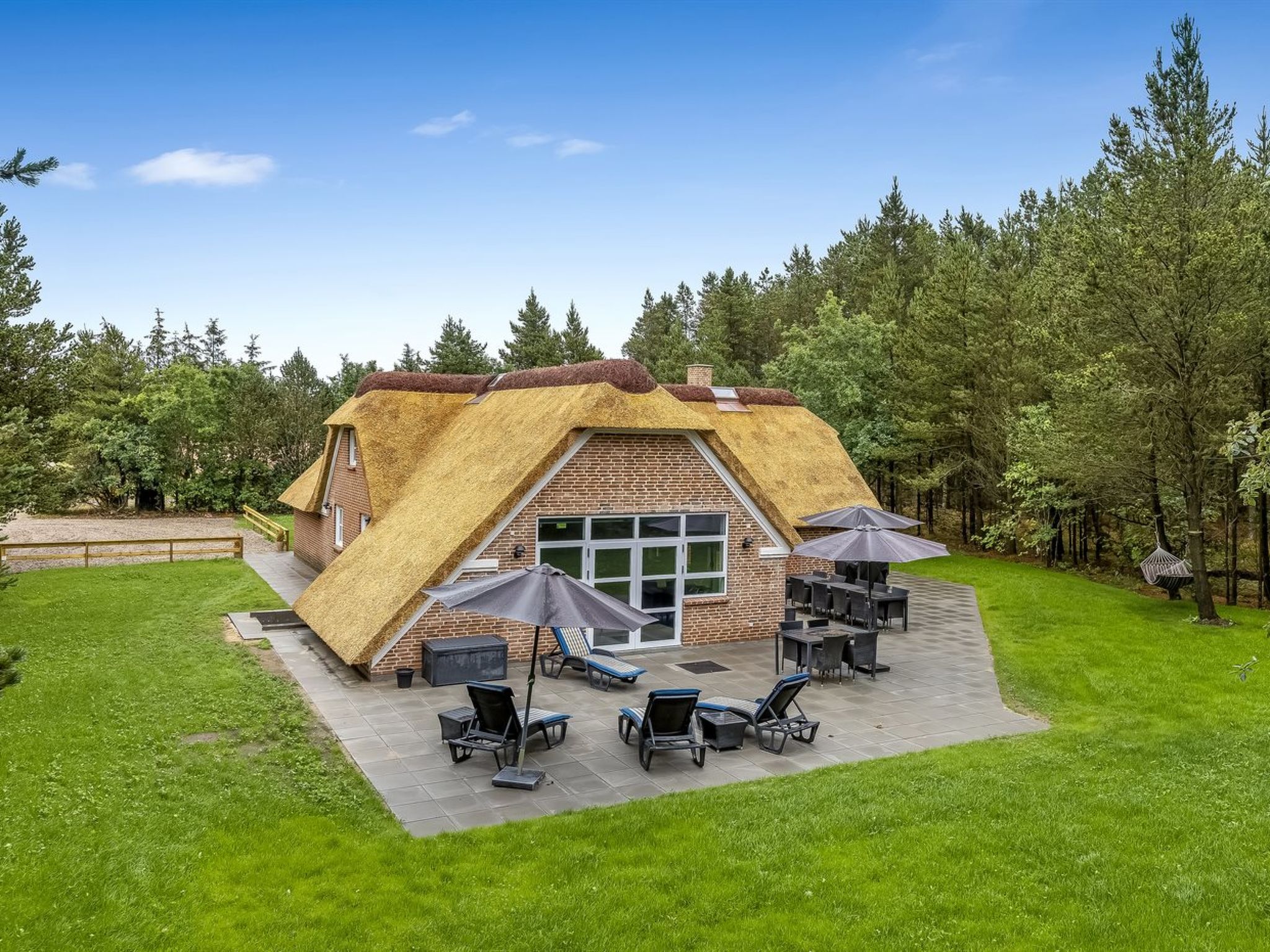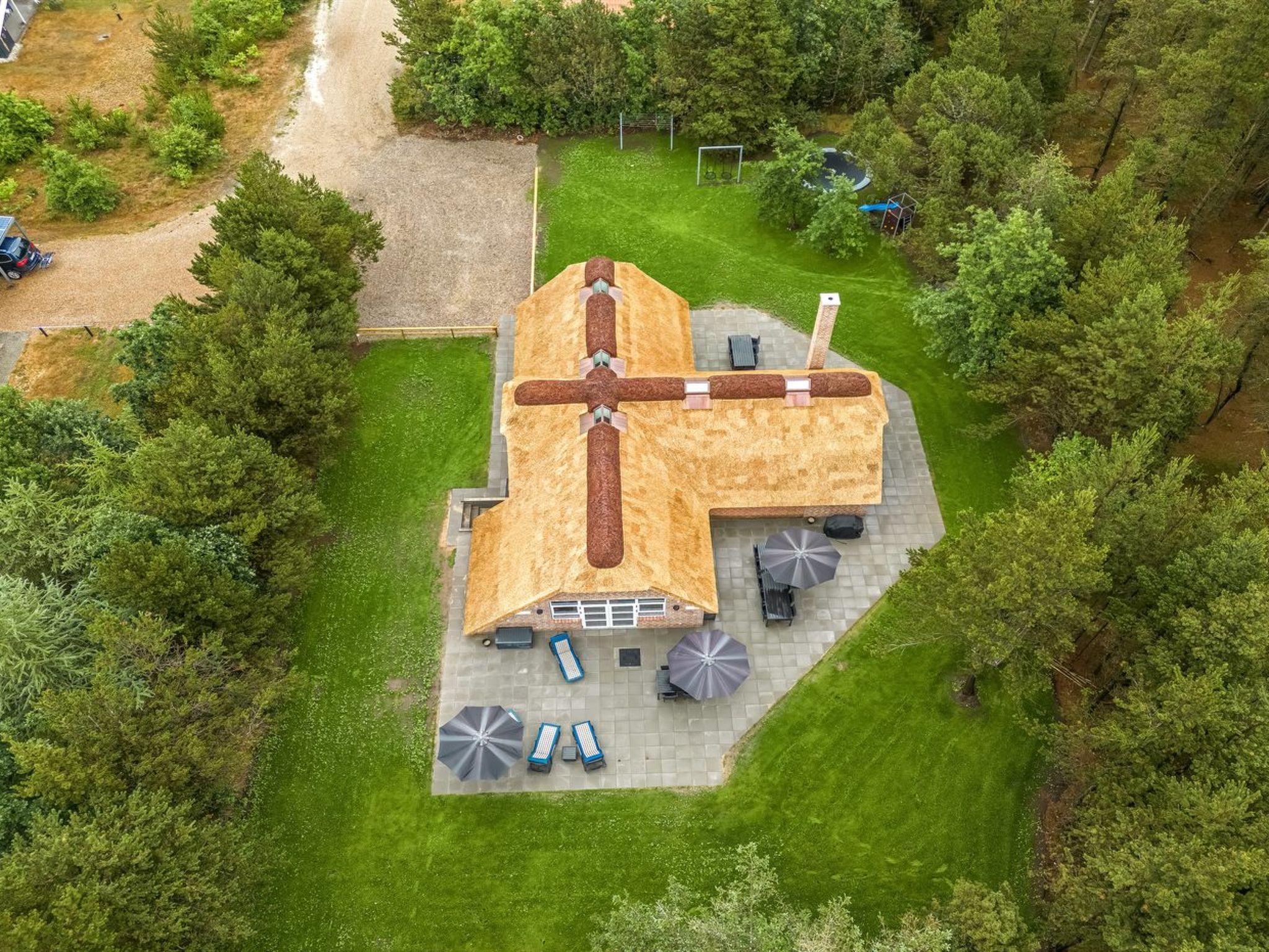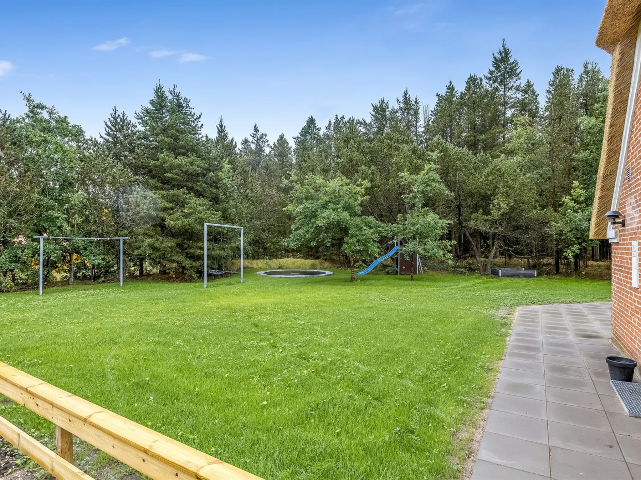 Single-family house, built in 1994. 2.5 km from the sea. Private: natural state property 2'286 m2, indoor pool (3 x 6 m, 18 m2, depth 140 - 140 cm). Terrace (220 m2), children's playground (slide, swing). In the house: sauna, trampoline, washing machine, tumble dryer. Parking at the house. E-charging station. Grocery 1 km. The owner does not accept any youth groups.