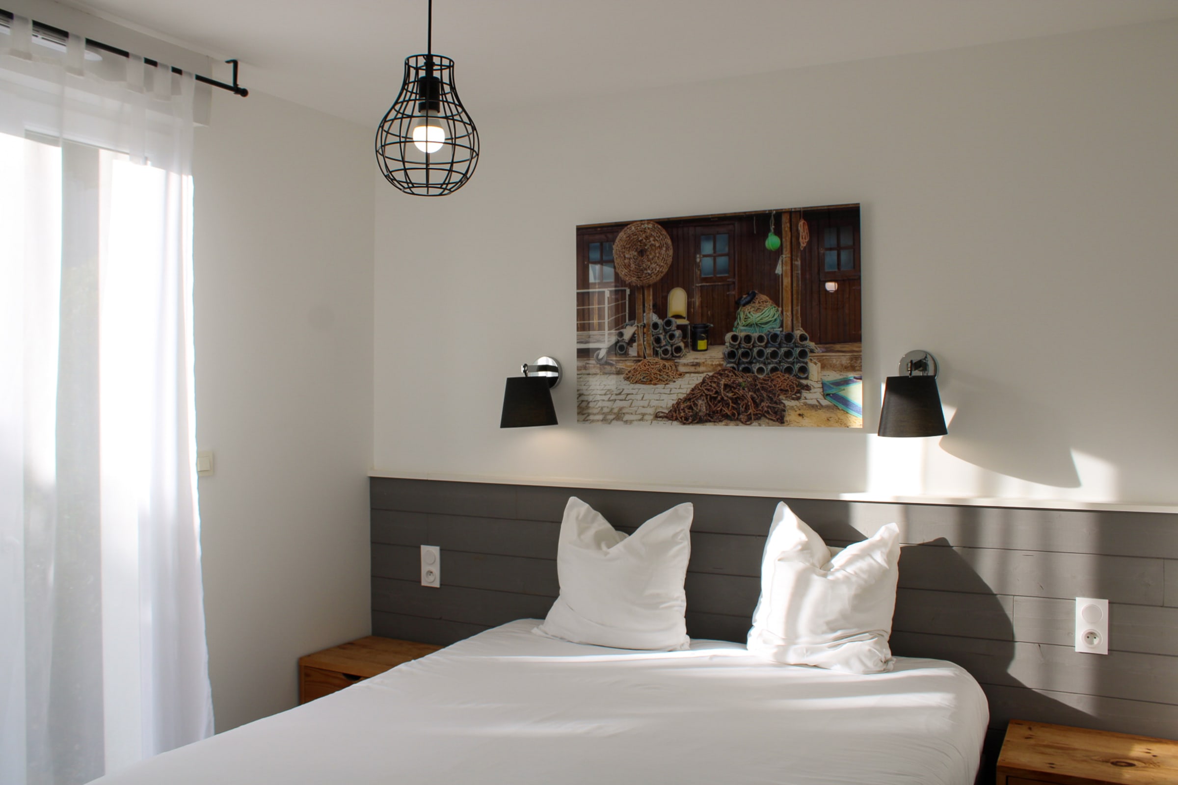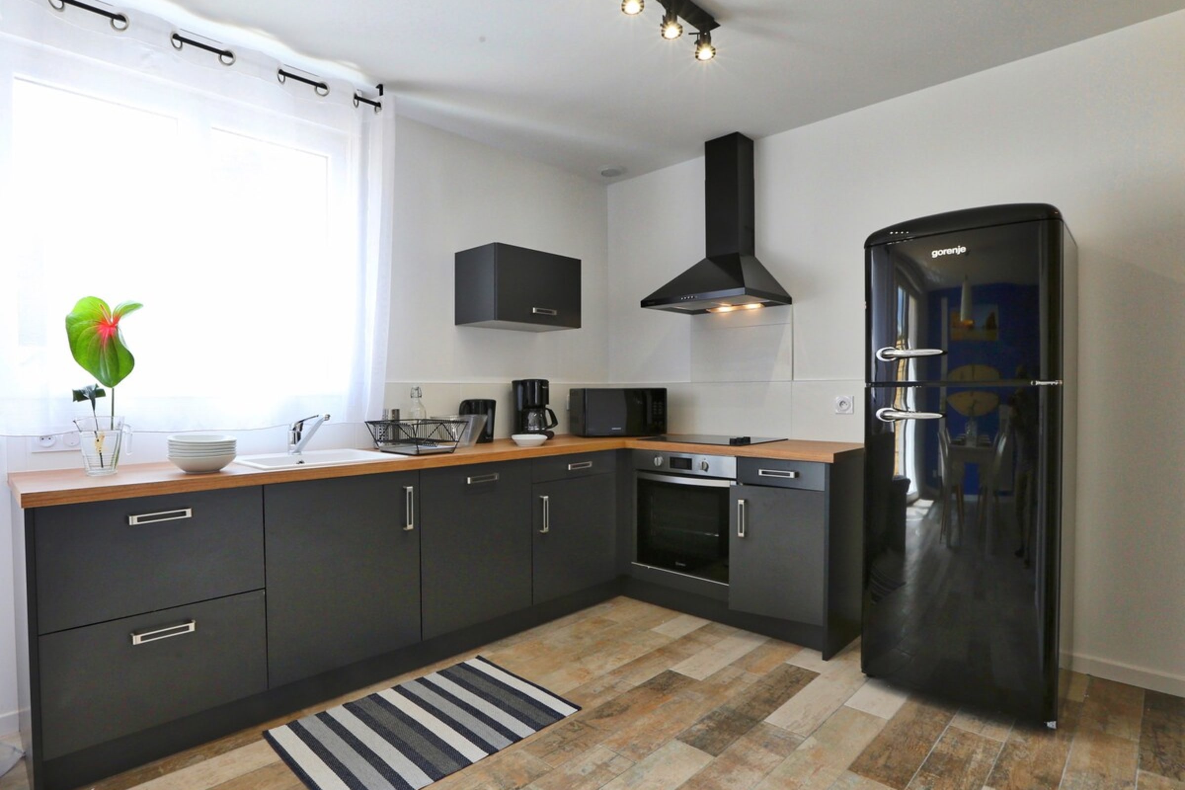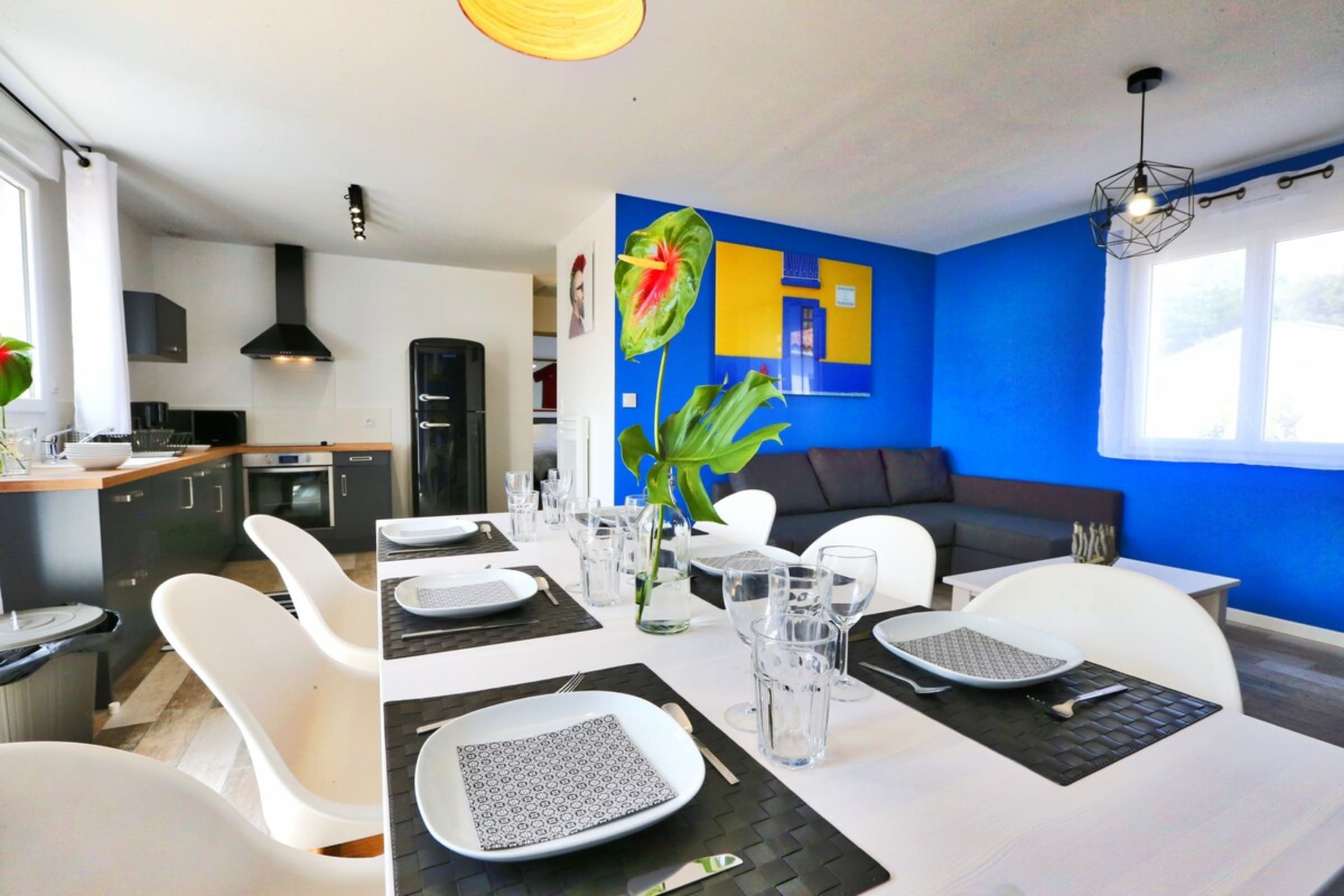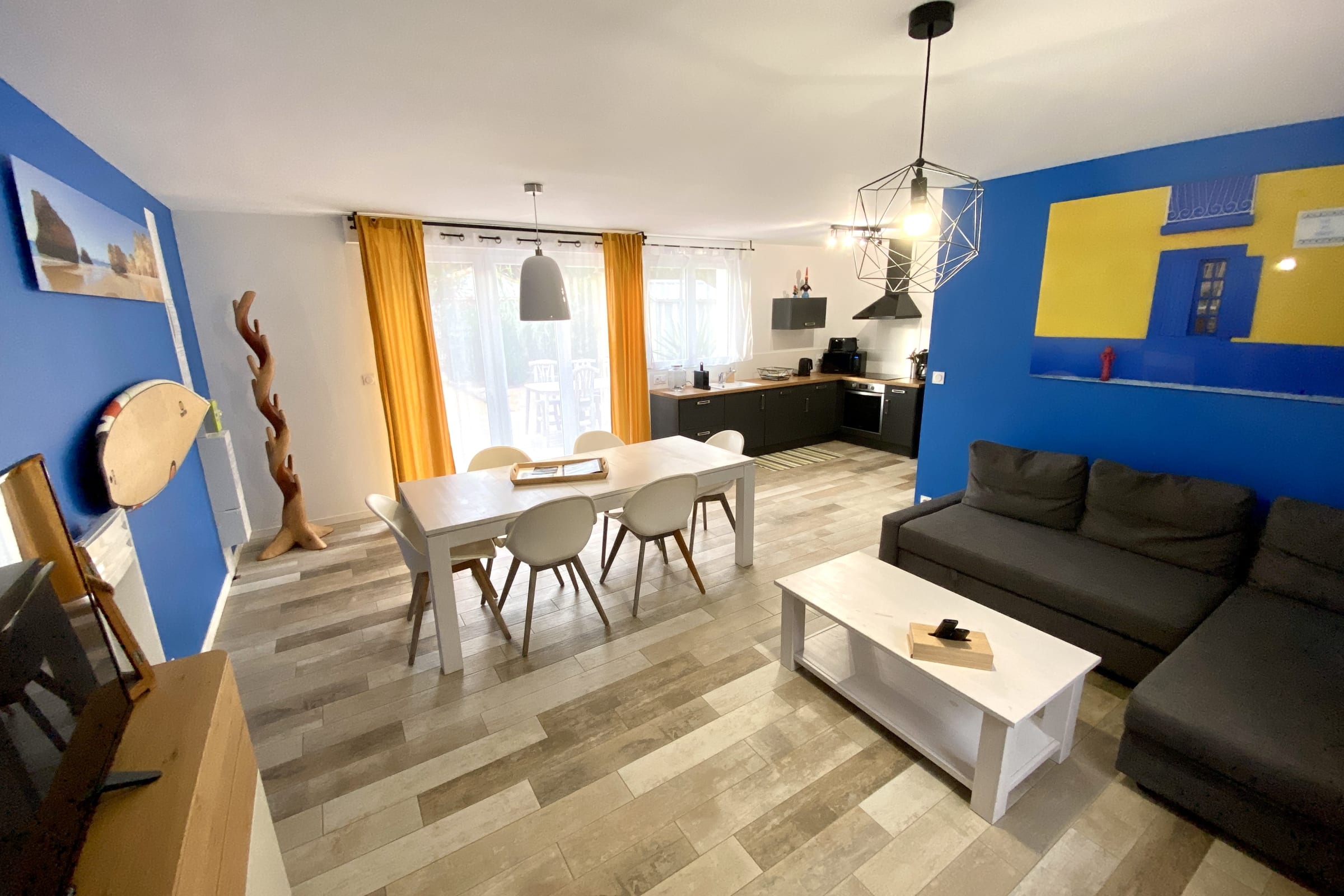Decorated on the theme of Portugal, this 60m² house can accommodate up to 6 people. It has a living room and a fitted and fully equipped kitchen (oven, fridge-freezer, dishwasher, microwave, oven, filter coffee maker, toaster, Nespresso, kettle, microwave, ceramic hob, all necessary crockery, television (TNT channels), hair dryer, washing machine, iron and ironing board).