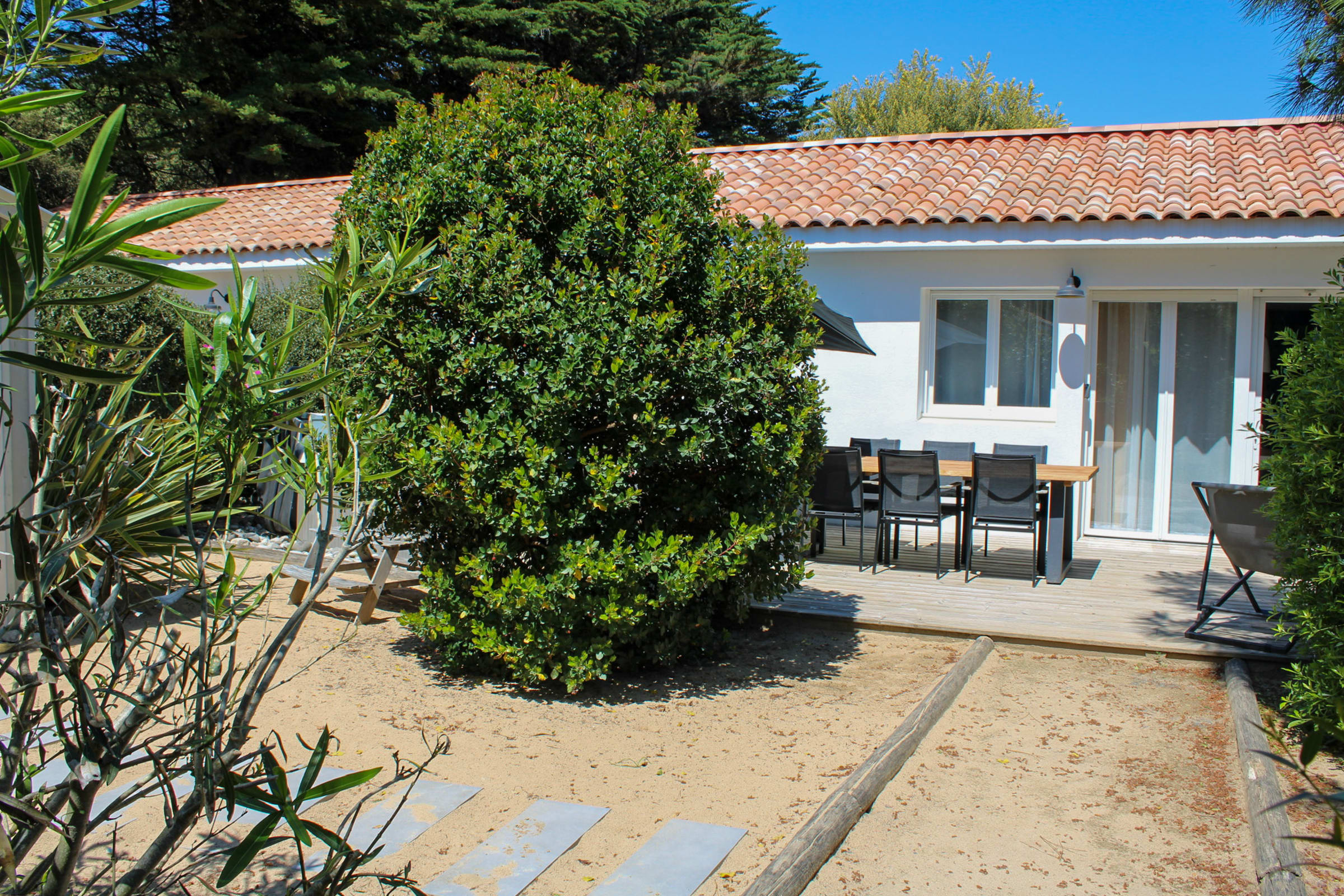The sleeping area has two bedrooms with double beds and the convertible double sofa bed in the living room offers an additional bed for 2 people. Outside, you can enjoy a beautiful wooden terrace with all the garden furniture for a successful holiday (outdoor table and chairs, parasol, barbecue or electric plancha ...).