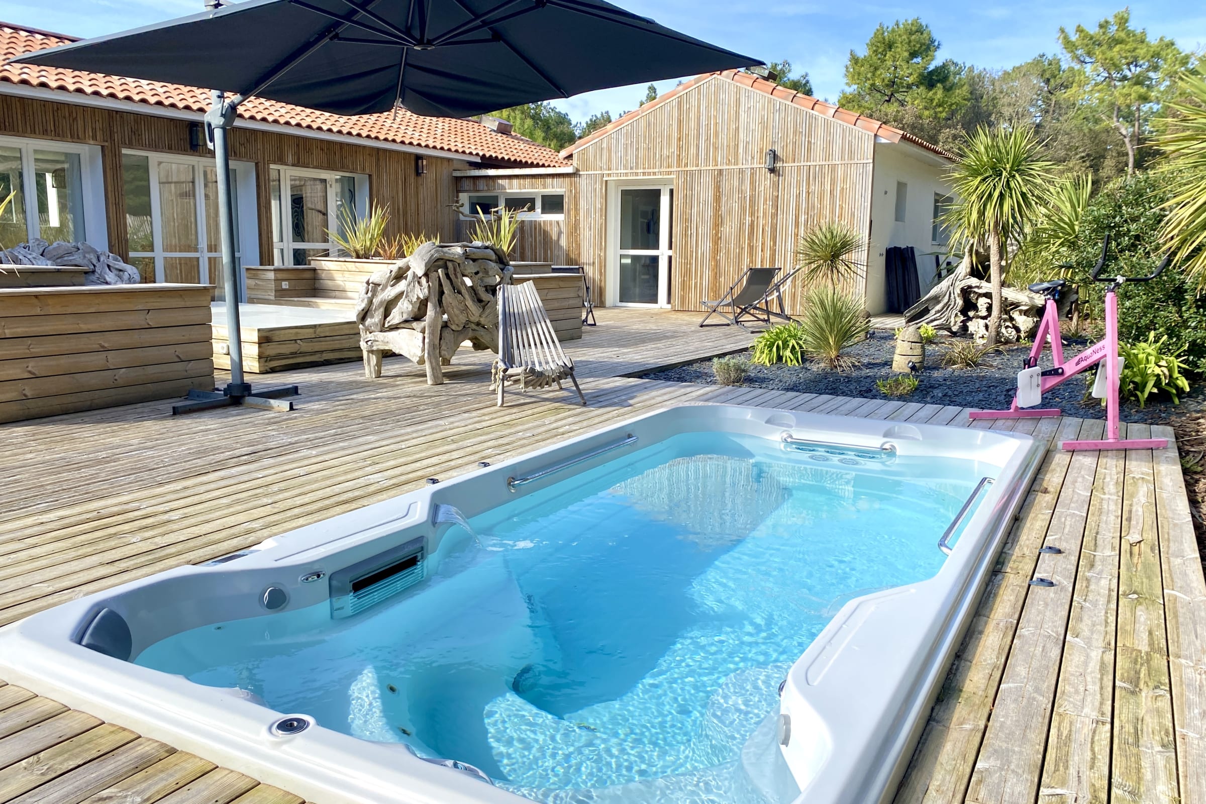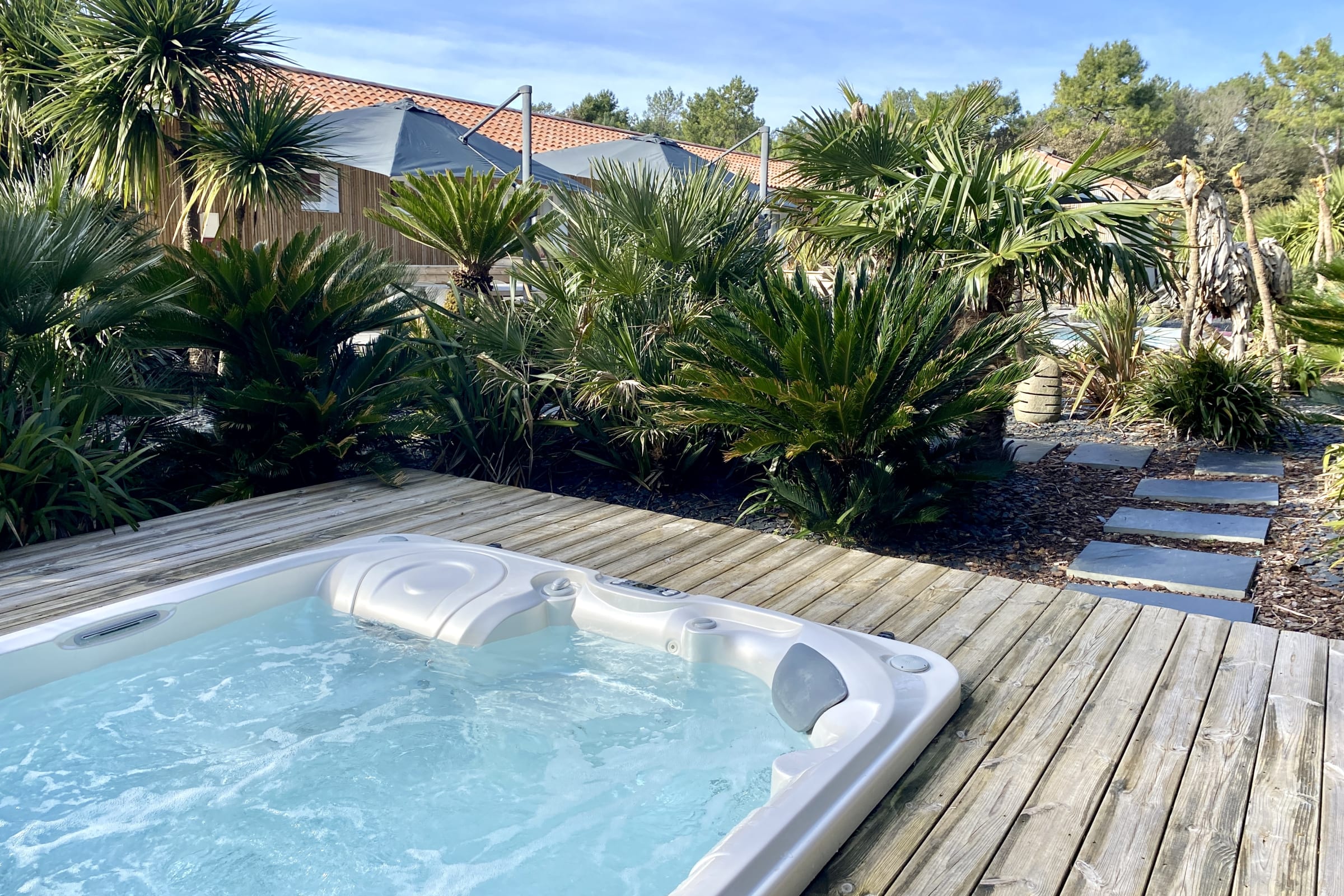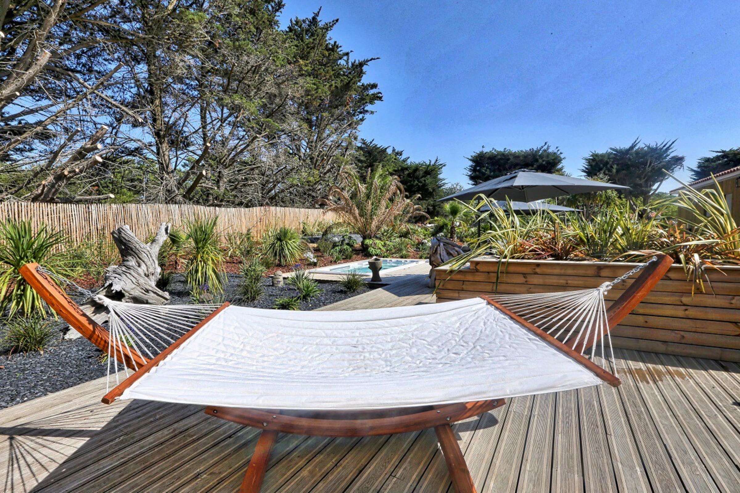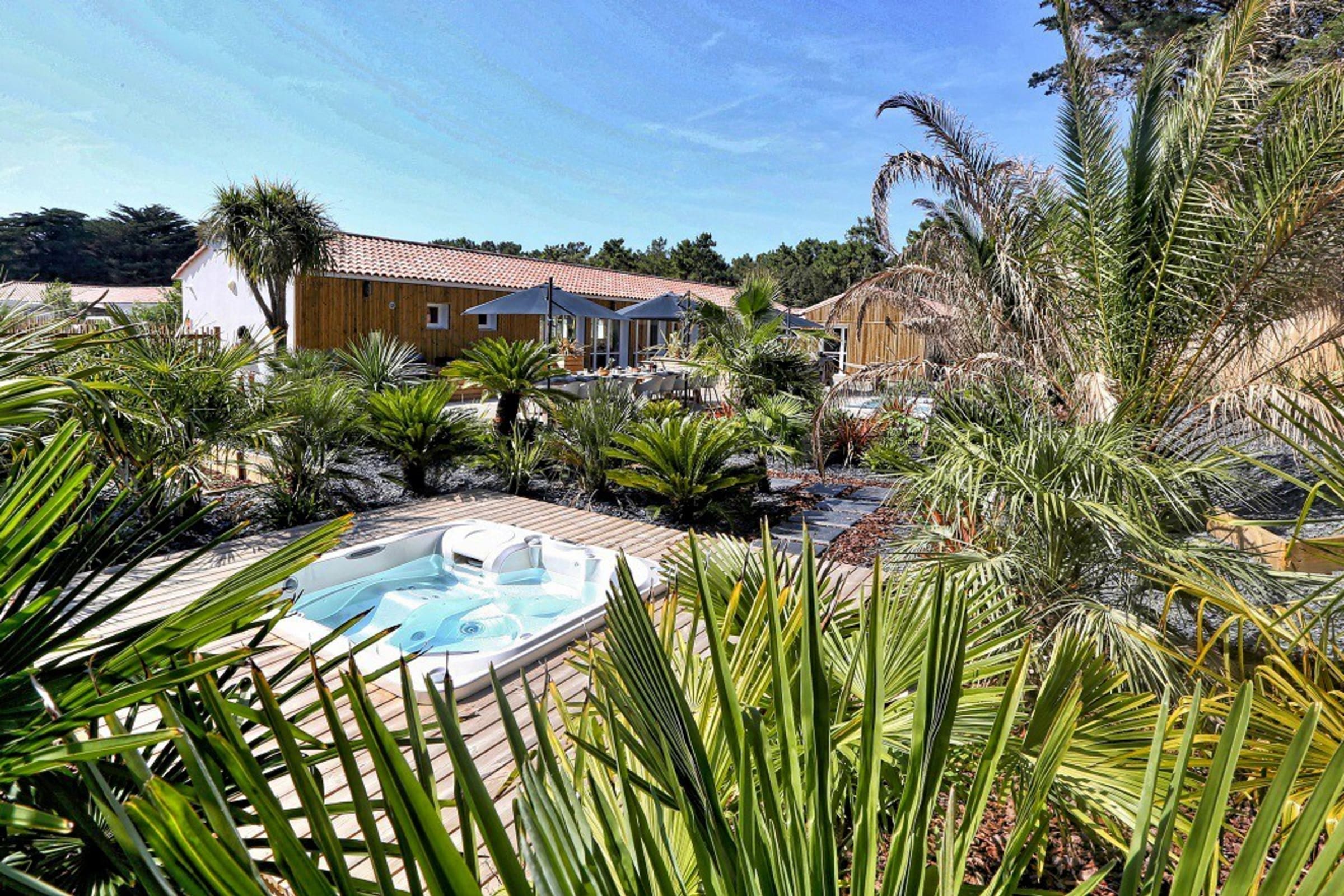 You can enjoy its large private wooden terrace, without any vis-à-vis, it has beautiful garden furniture as well as two optional spas (swimming and jacuzzi).