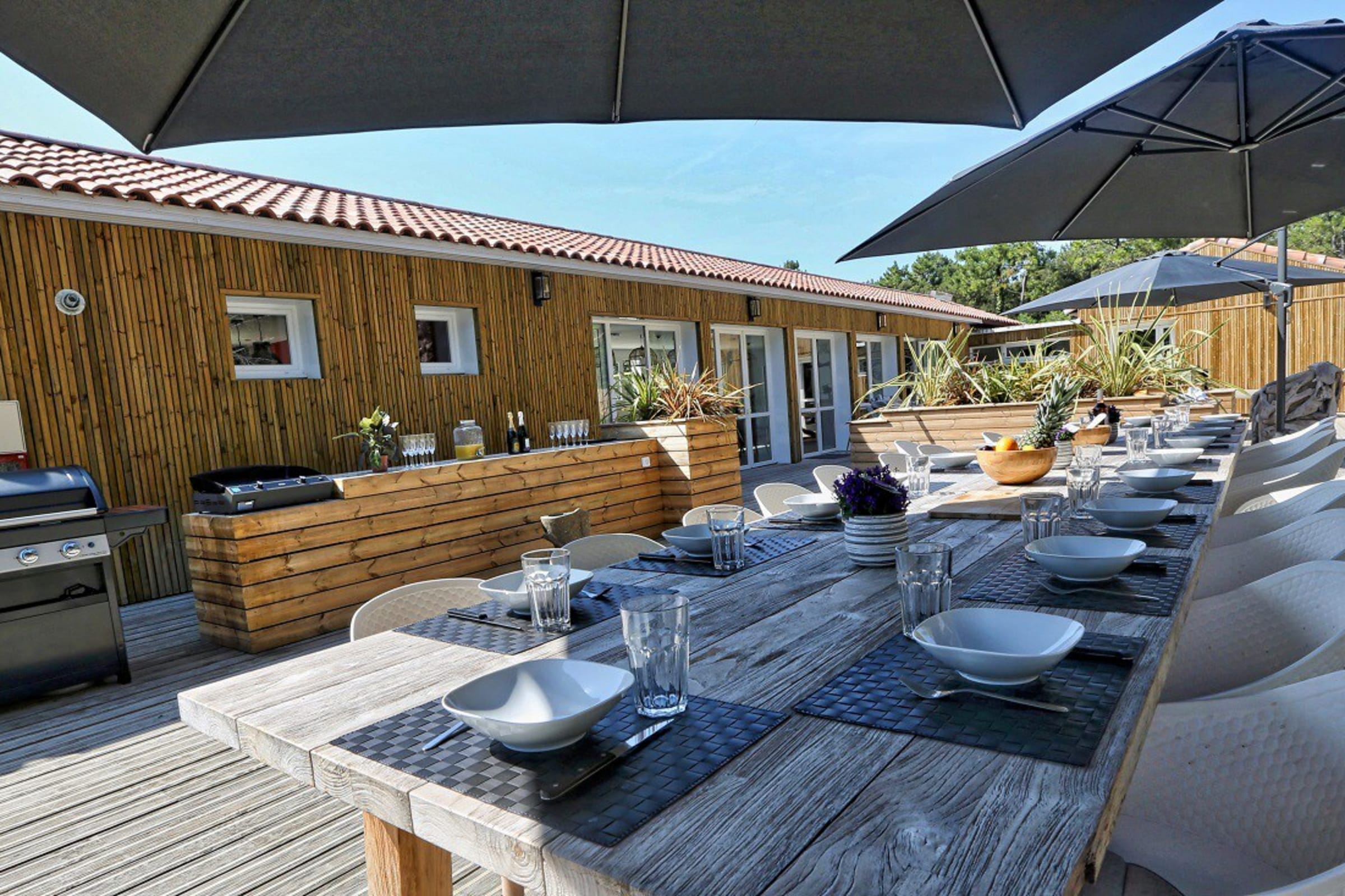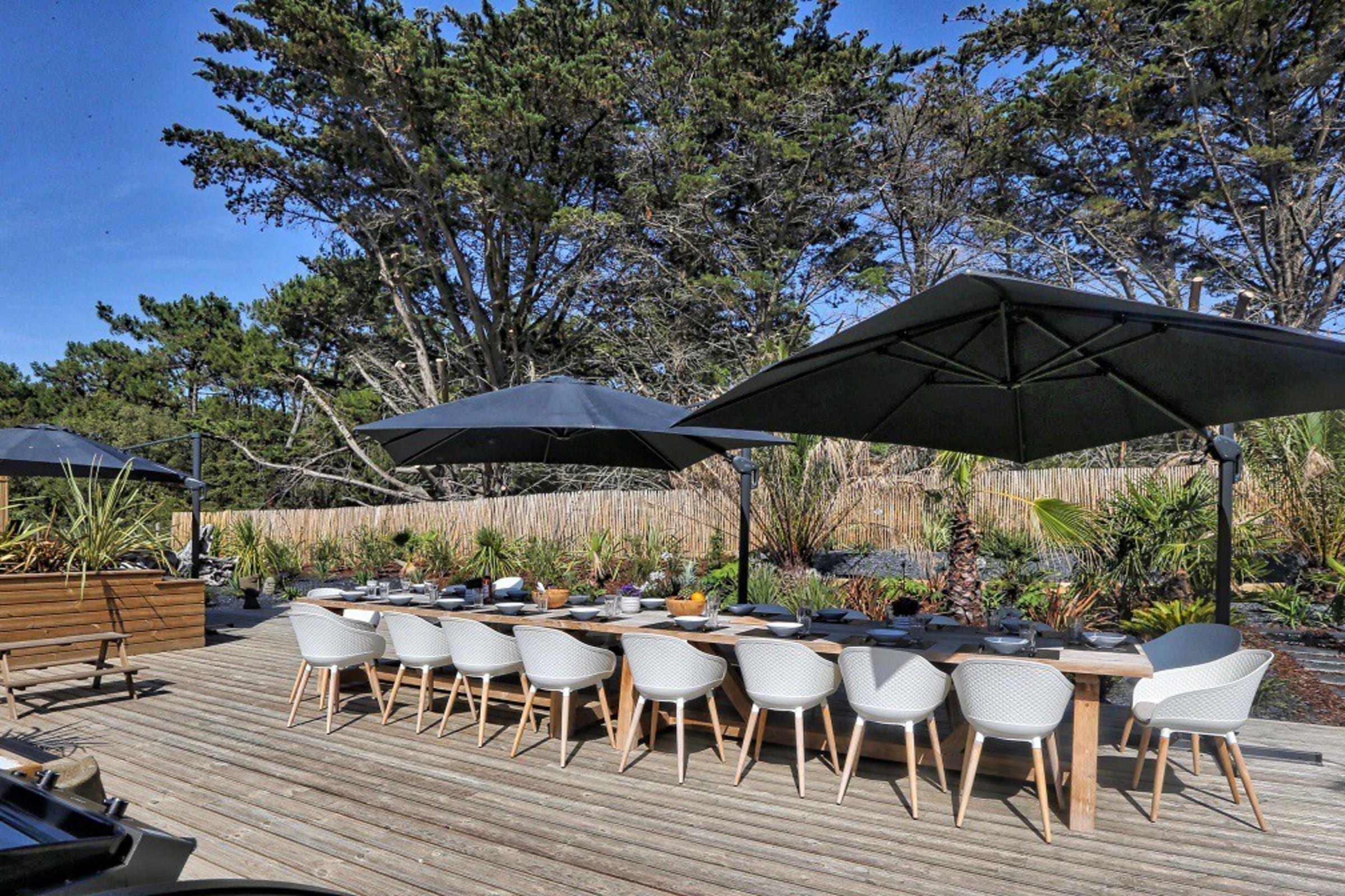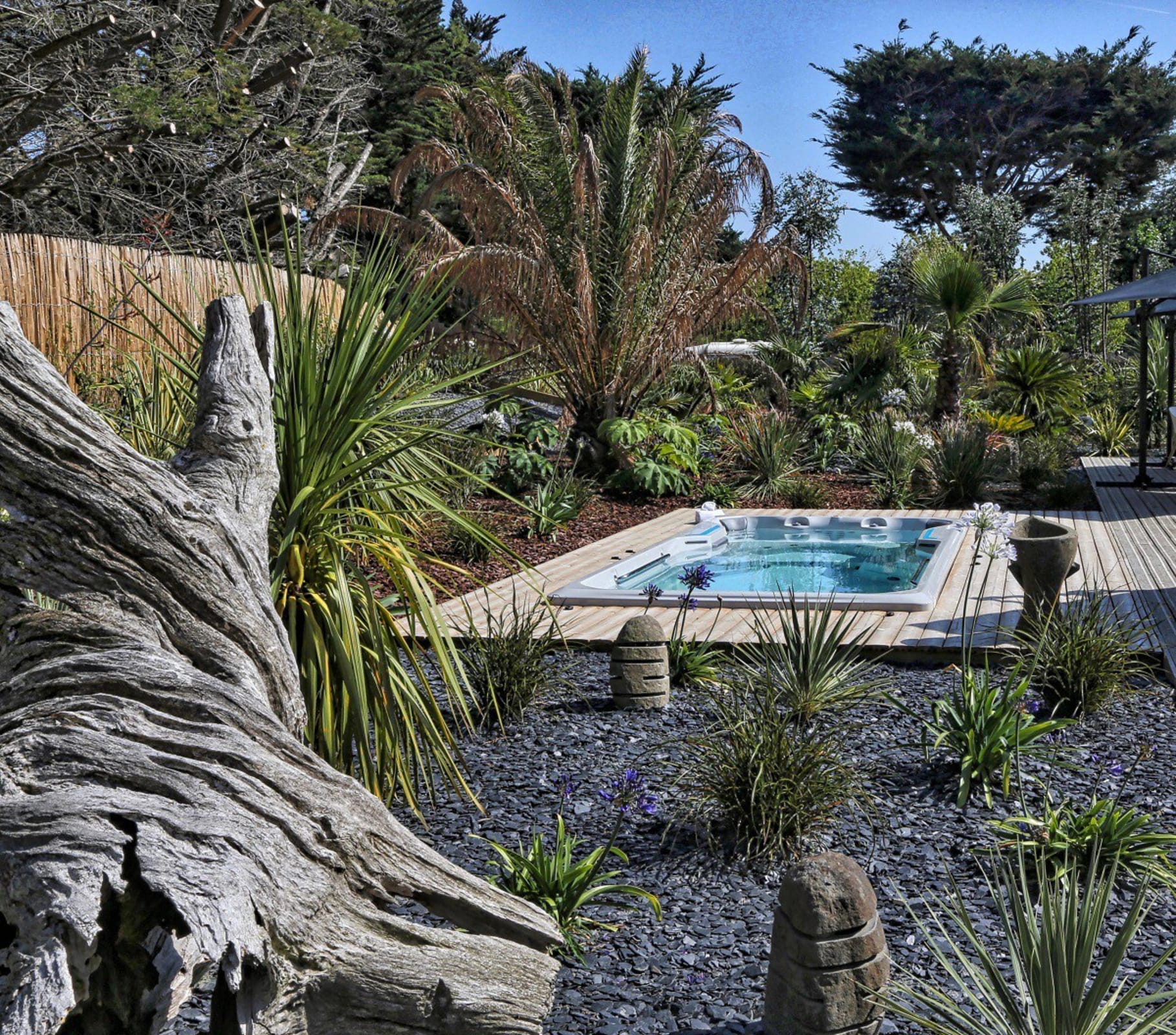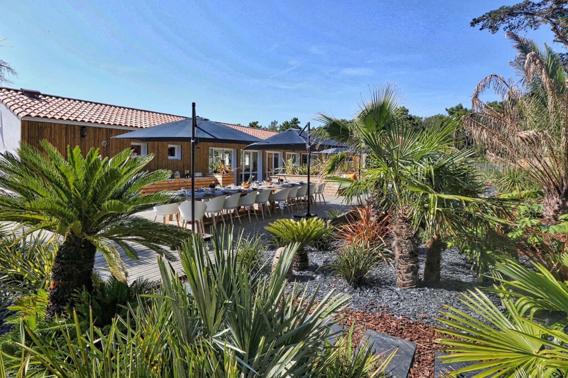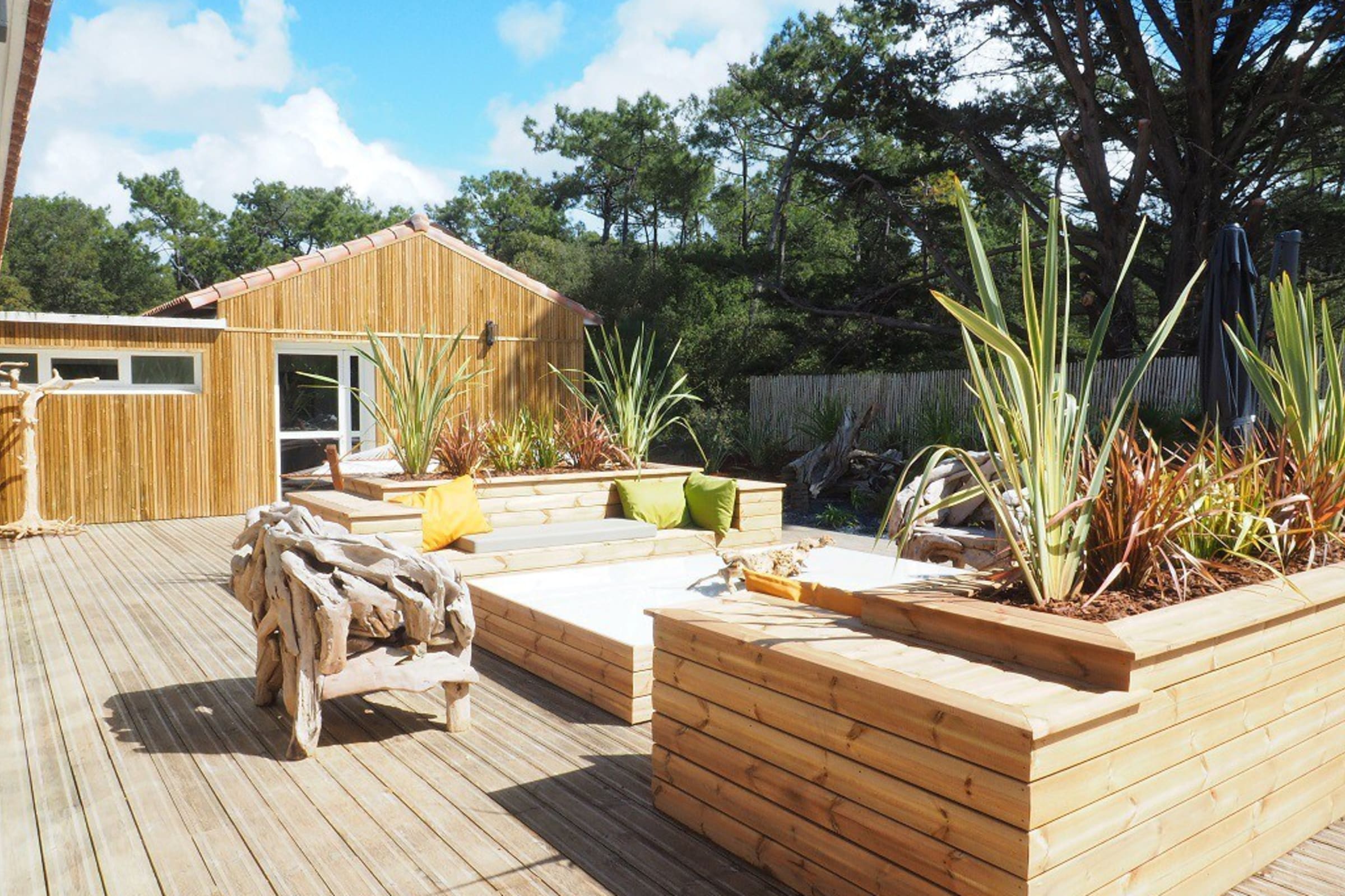 You can enjoy its large private wooden terrace, without any vis-à-vis, it has beautiful garden furniture as well as two optional spas (swimming and jacuzzi).