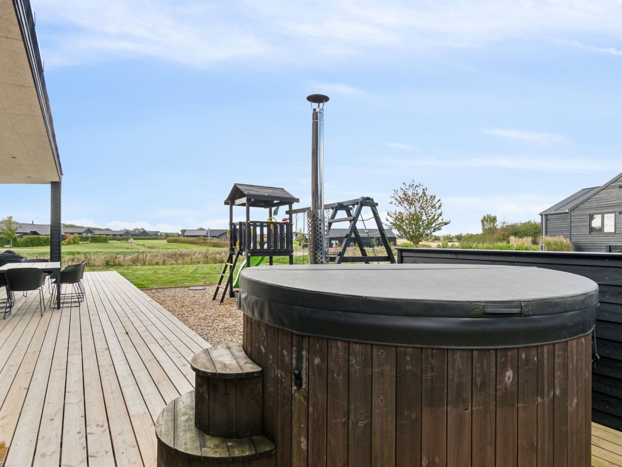 Single-family house, built in 2023. 300 m from the sea. Private: natural state property 800 m2. Barbecue, children's playground (slide, swing). In the house: sauna, washing machine, tumble dryer. Parking at the house. E-charging station. Grocery 1 km. The owner does not accept any youth groups.