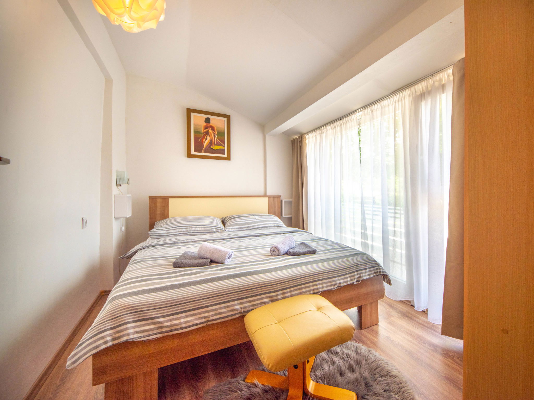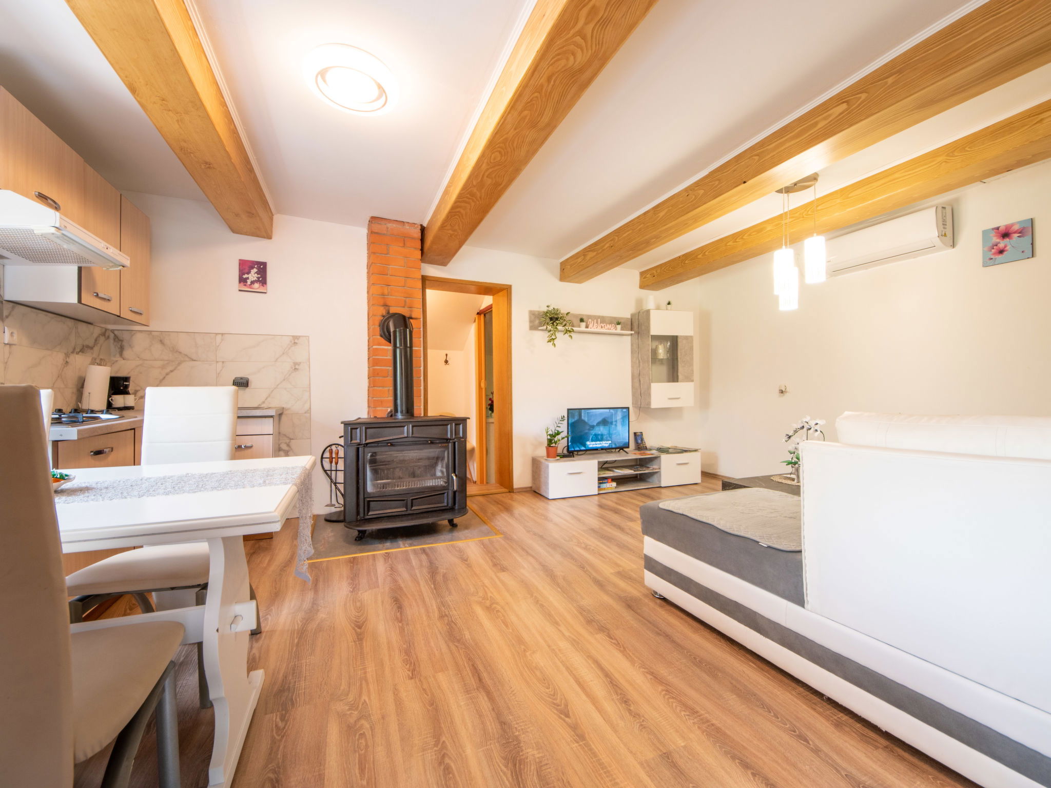 3-room house 46 m2. Living/dining room with 1 sofabed (140 cm, length 210 cm), cable TV and air conditioning. 1 room with 1 double bed (2 x 80 cm, length 200 cm). Exit to the terrace. 1 small room with 1 bed (80 cm, length 200 cm). Open kitchen (4 hot plates, microwave) with wood-burning stove. Shower/WC. Wood heating (extra). Deck chairs. Facilities: children's high chair, baby cot, hair dryer, logs (extra). Internet (WiFi, free). Maximum 1 pet/ dog allowed. Small, highly placed window in the bedroom with 1 bed. Wood heating available only in the period 01.09.-01.05. (extra).