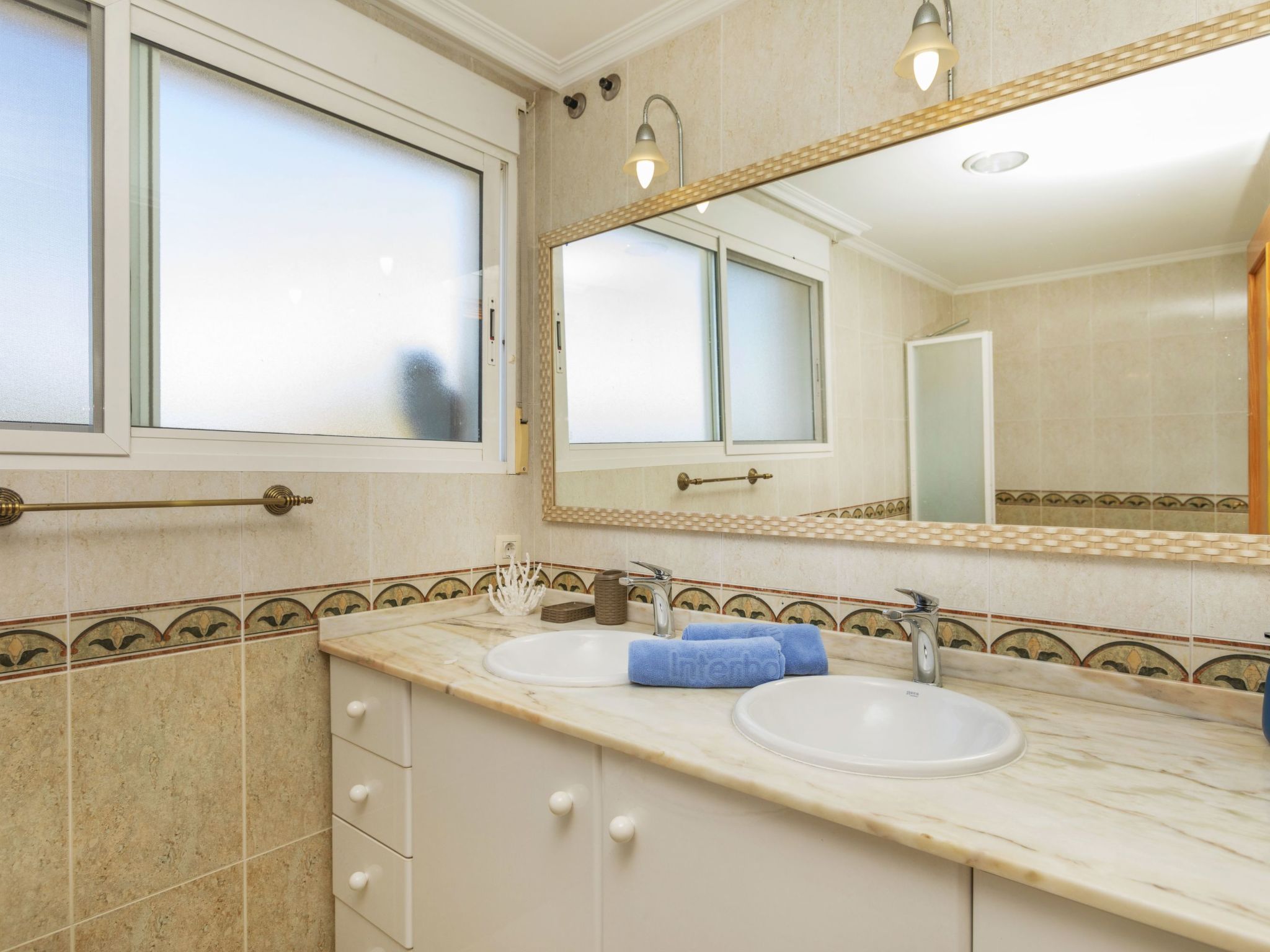 "La Rambleta", 4-room terraced house 158 m2 on 2 levels. Spacious, practical furnishings: living/dining room with open-hearth fireplace, dining table, digital TV, flat screen, wood-burning stove, air conditioning and forced-air heating. Exit to the garden. Kitchen in the entrance (oven, dishwasher, 4 ceramic glass hob hotplates, toaster, kettle, freezer, grill, electric coffee machine, combination microwave) with dining table. Shower/bidet/WC. Upper floor: 1 room with 2 beds (90 cm, length 190 cm), fan. 1 room with 2 beds (90 cm, length 190 cm), fan. 1 room with 1 french bed (135 cm, length 190 cm), fan. Exit to the terrace. Shower/bidet/WC. Large patio 80 m2. Facilities: washing machine, iron, mosquito net, hair dryer. Internet (WiFi, free). Garage (1 car). Suitable for families. Maximum 1 pet/ dog allowed. R0000000001