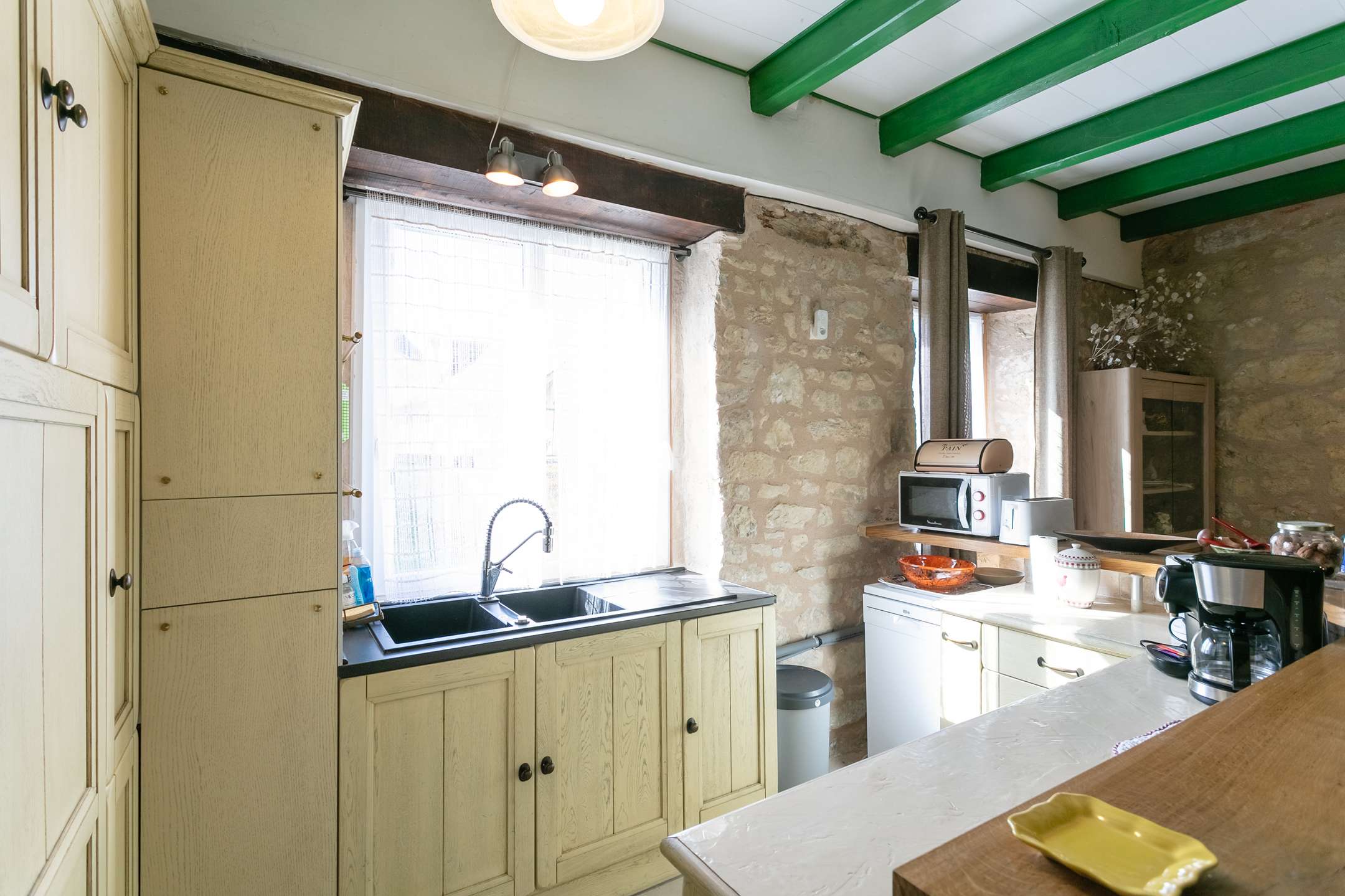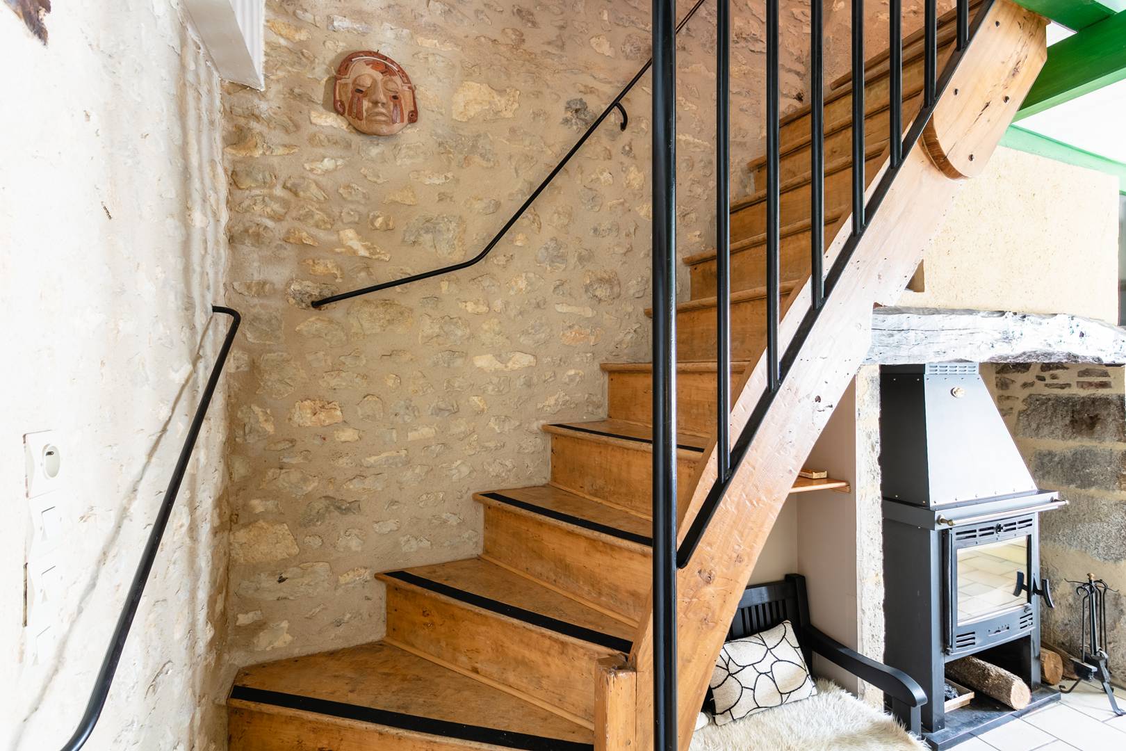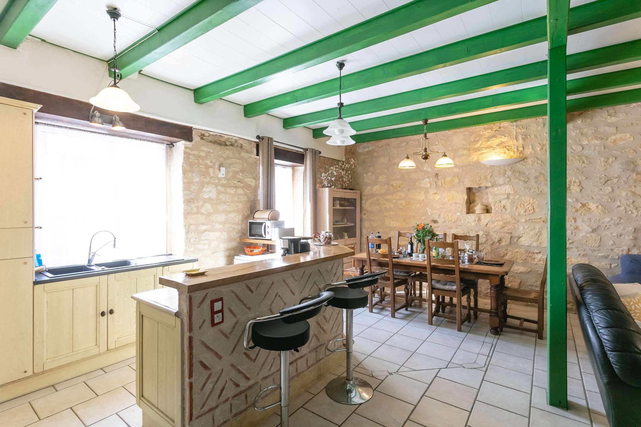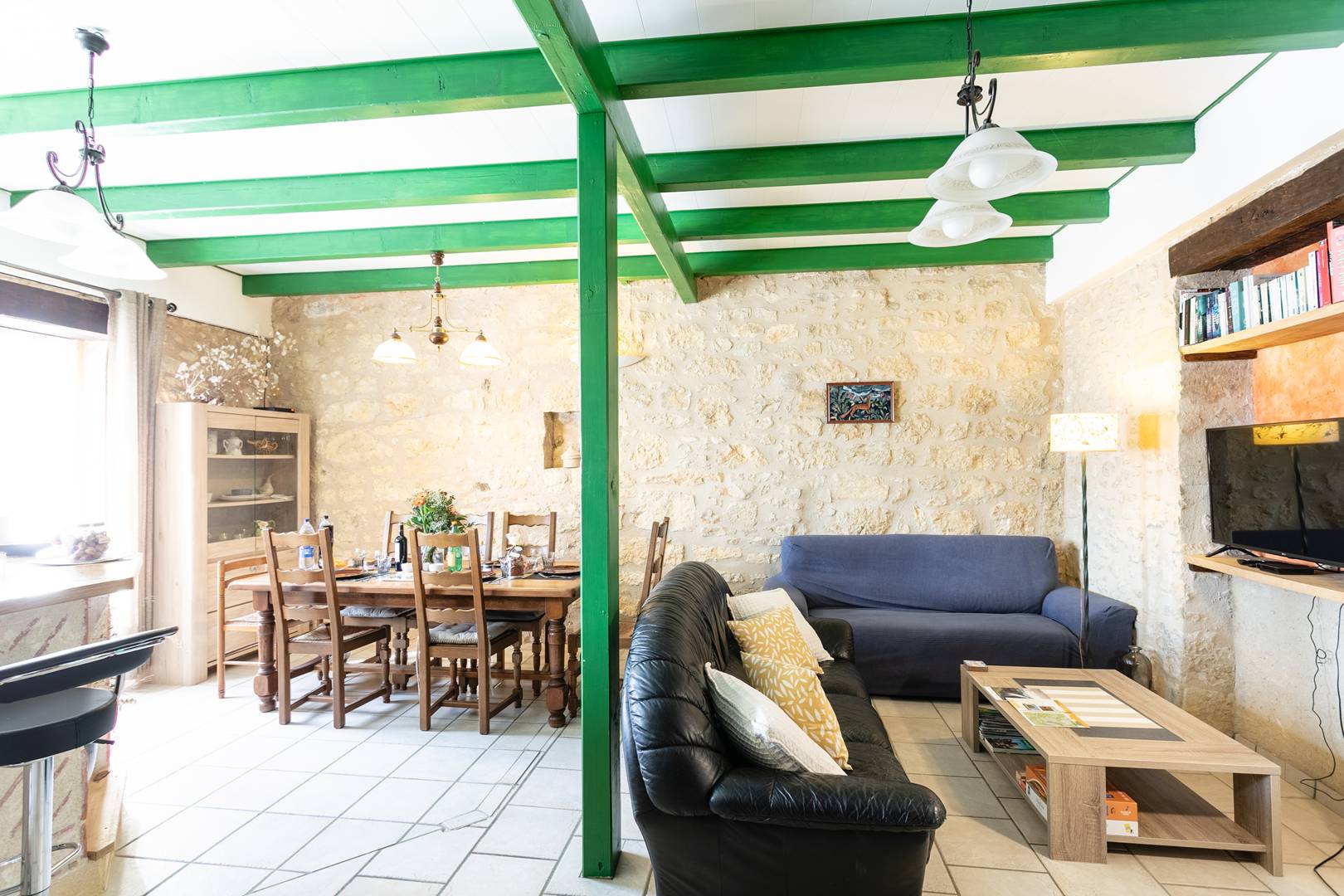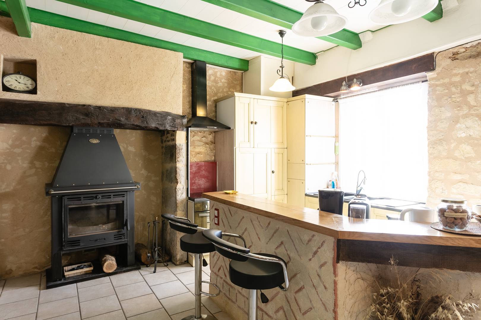 - bright living area open to the kitchen and dining room, equipped with two 3-seater sofas, TV, and wood stove – perfect for convivial moments