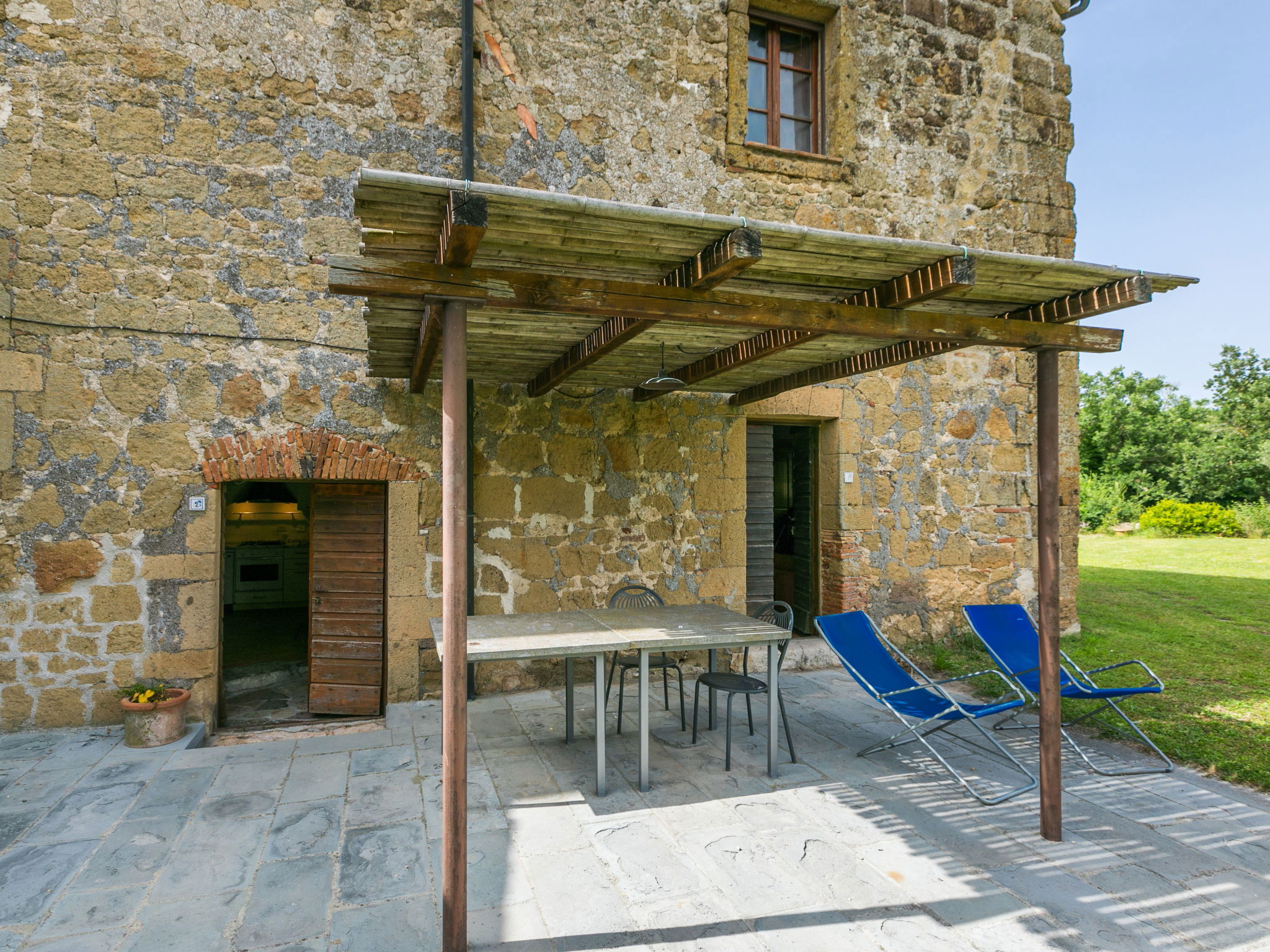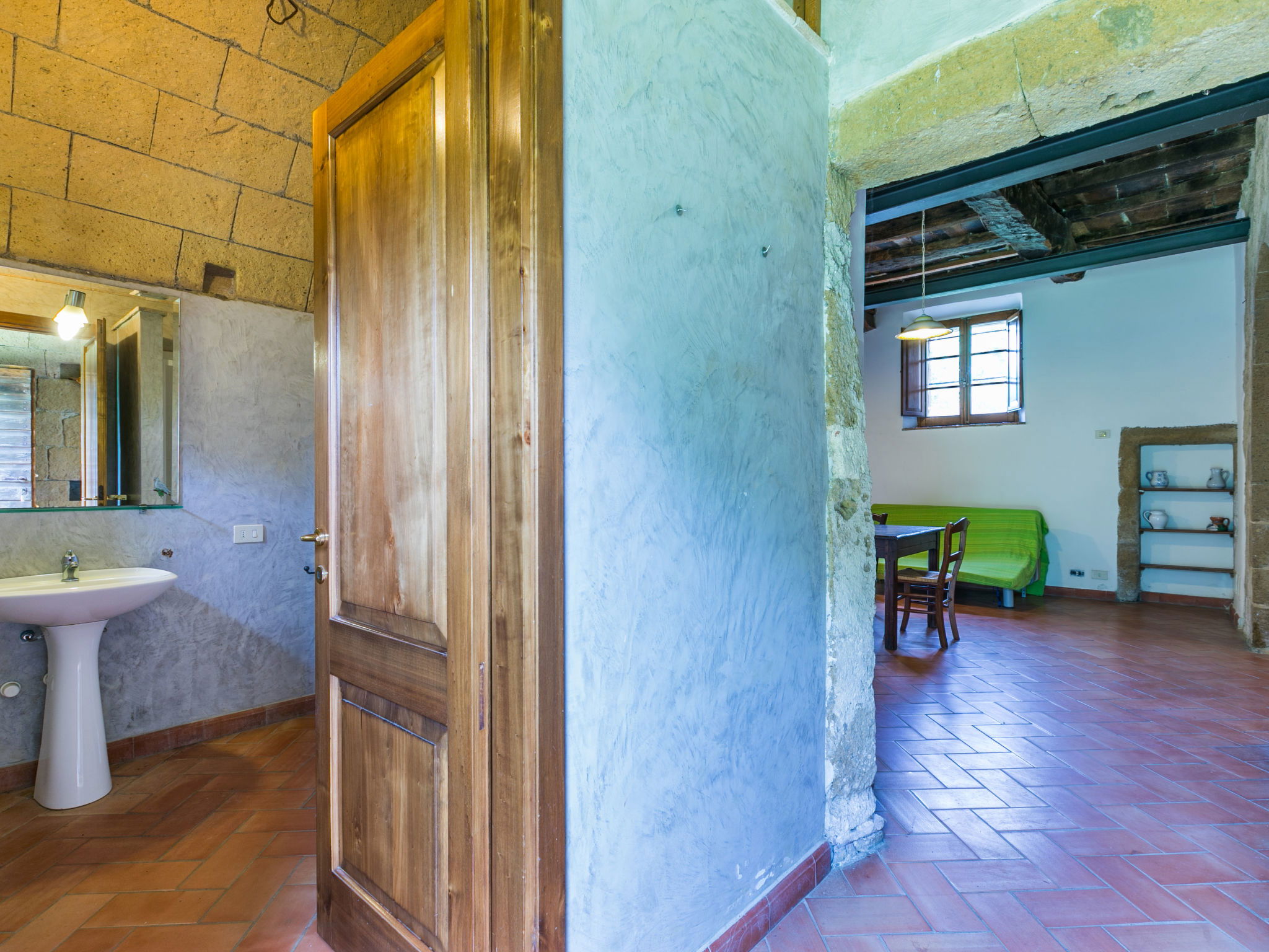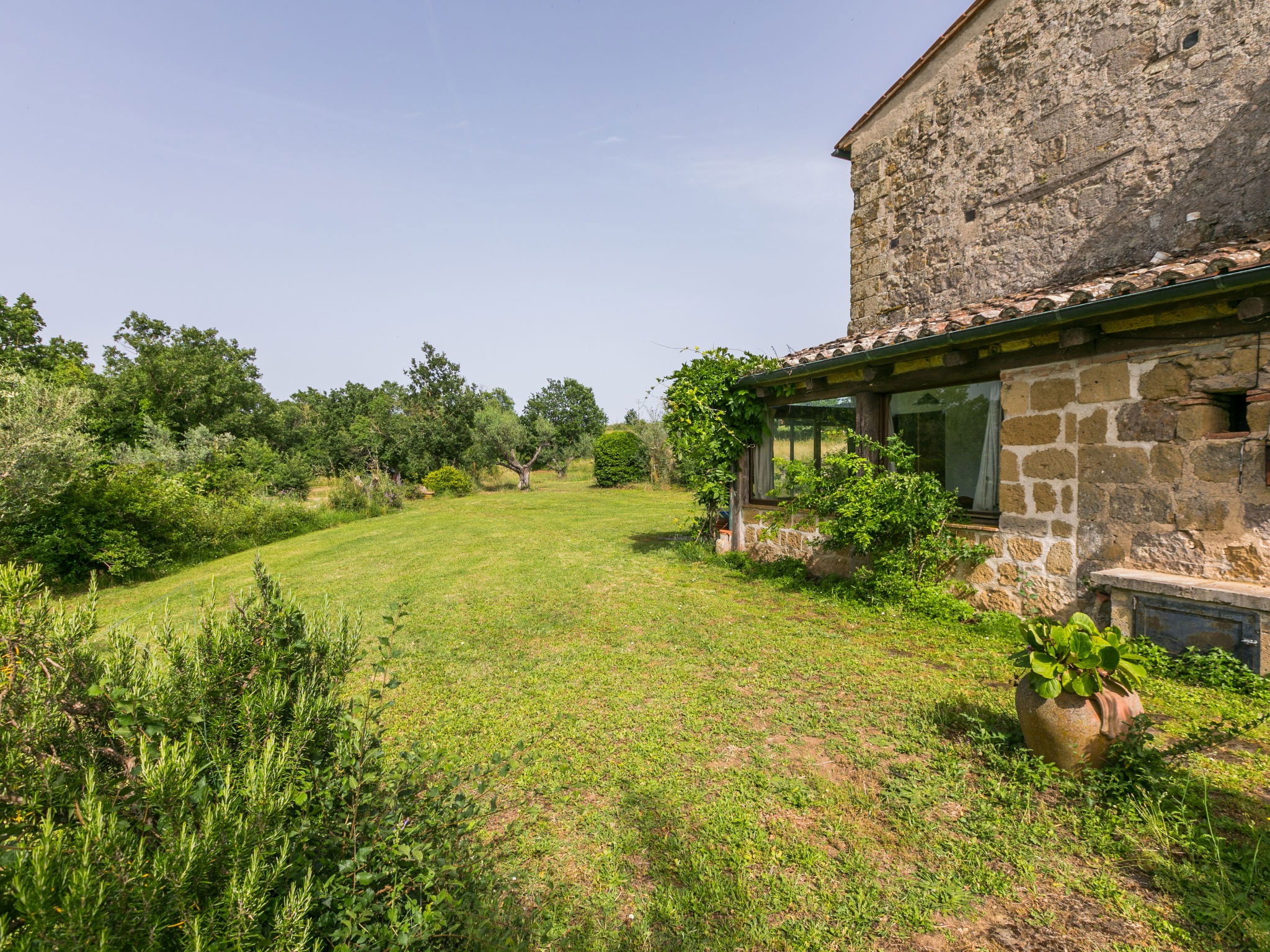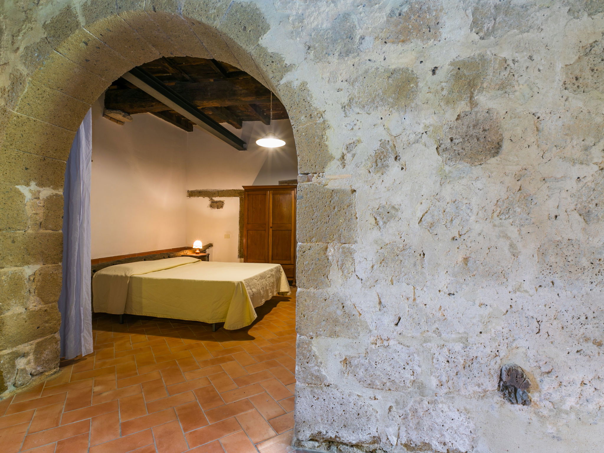 Large, rustic house "Il Piccione", 3 storeys, detached from the 14th century, surrounded by trees and meadows. 1.5 km from the centre of Sorano, 9 km from the centre of Pitigliano, in a secluded, quiet position, 50 m from the edge of the forest, 60 km from the sea, in the countryside. Private: property 12'000 m2 with lawn and trees, beautiful garden to relax, swimming pool (18 x 8 m, depth 120 cm, seasonal availability: 01.Jun. - 15.Oct.). Outdoor shower, pergola, garden furniture, barbecue. In the house: washing machine (extra). 200 m long motor access (via unmade road). Parking on the premises. Shop 1.5 km, grocery 1.5 km, supermarket 9 km, restaurant 1.9 km, bar 1.7 km, sandy beach "Albinia" 65 km, thermal baths "Terme di Sorano" 440 m, bathing lake "Bolsena" 25 km. Golf course (18 hole) 30 km, riding stable 6 km, walking paths from the house 1 km. Nearby attractions: Sovana 11 km, Saturnia 34 km, Orvieto 49 km, Viterbo 54 km, Val d´Orcia 40 km. Well-known lakes can easily be reached: Bolsena 25 km. Hiking paths: Mountain-bike 1.5 km. Please note: car recommended.
