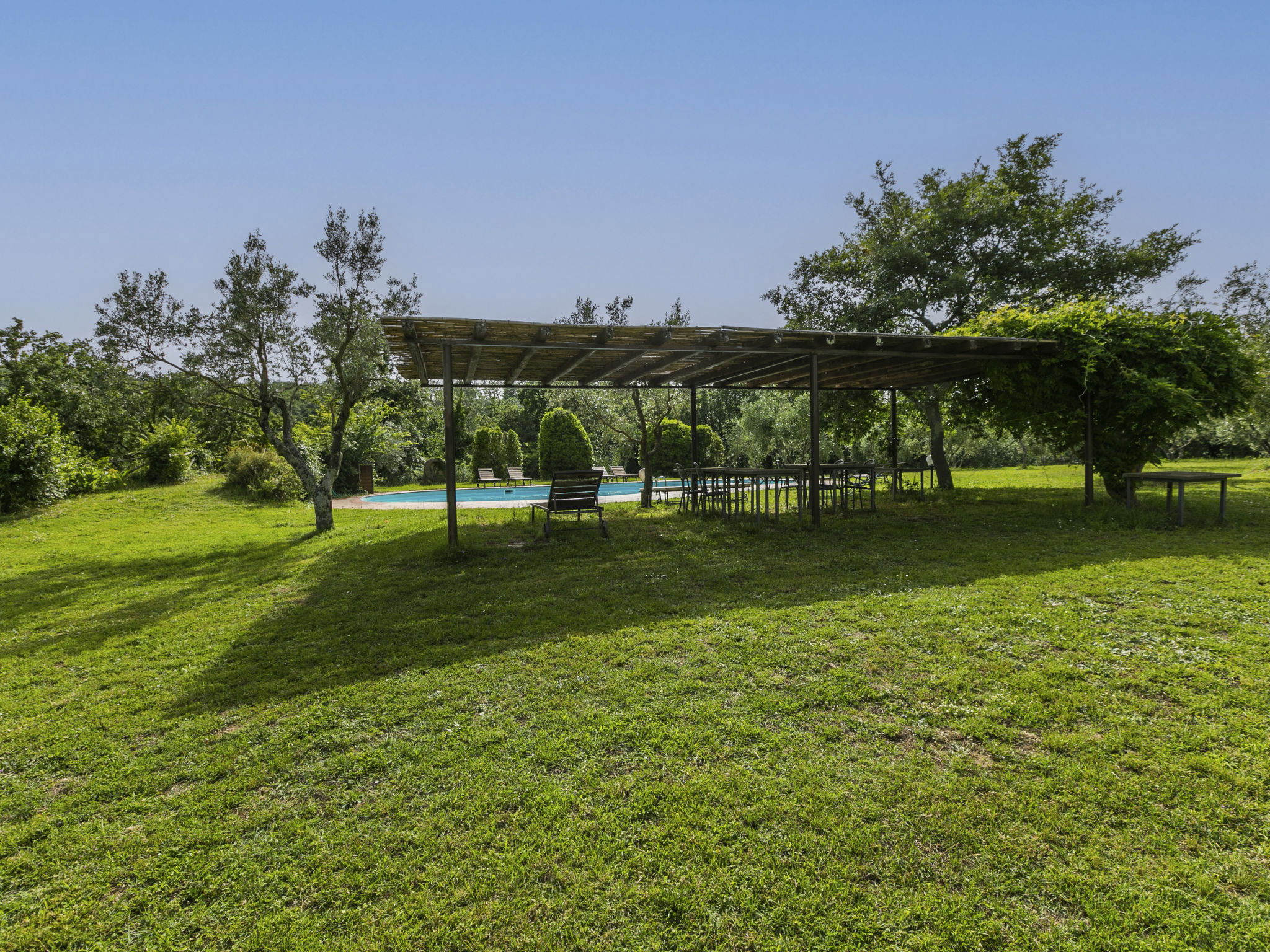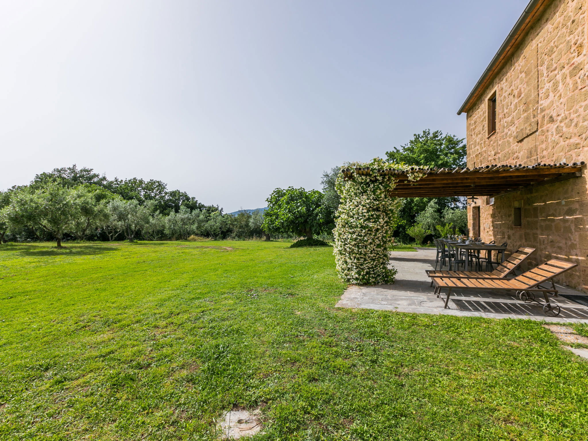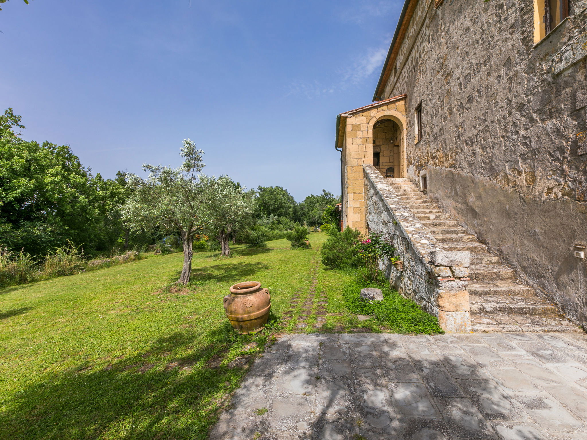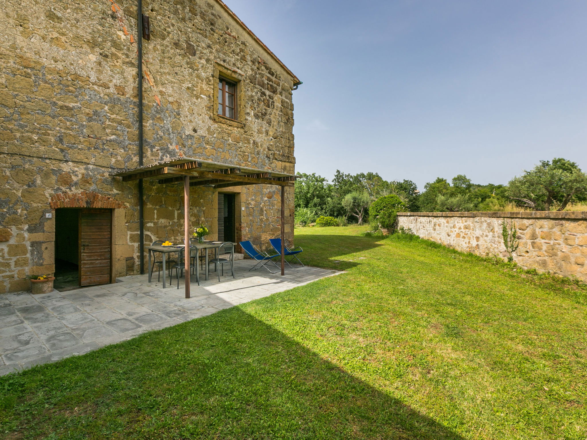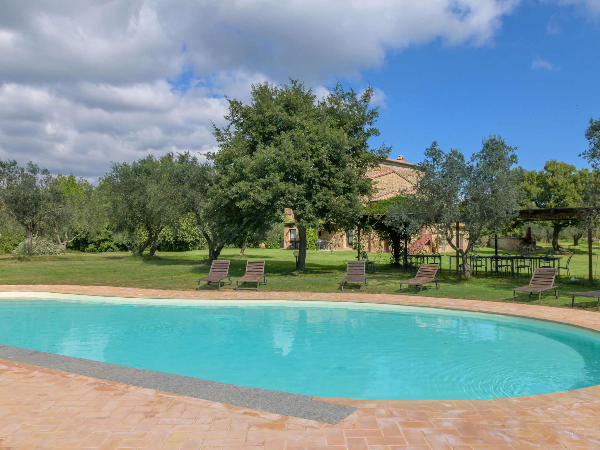 Large, rustic house "Il Piccione", 3 storeys, detached from the 14th century, surrounded by trees and meadows. 1.5 km from the centre of Sorano, 9 km from the centre of Pitigliano, in a secluded, quiet position, 50 m from the edge of the forest, 60 km from the sea, in the countryside. Private: property 12'000 m2 with lawn and trees, beautiful garden to relax, swimming pool (18 x 8 m, depth 120 cm, seasonal availability: 01.Jun. - 15.Oct.). Outdoor shower, pergola, garden furniture, barbecue. In the house: washing machine (extra). 200 m long motor access (via unmade road). Parking on the premises. Shop 1.5 km, grocery 1.5 km, supermarket 9 km, restaurant 1.9 km, bar 1.7 km, sandy beach "Albinia" 65 km, thermal baths "Terme di Sorano" 440 m, bathing lake "Bolsena" 25 km. Golf course (18 hole) 30 km, riding stable 6 km, walking paths from the house 1 km. Nearby attractions: Sovana 11 km, Saturnia 34 km, Orvieto 49 km, Viterbo 54 km, Val d´Orcia 40 km. Well-known lakes can easily be reached: Bolsena 25 km. Hiking paths: Mountain-bike 1.5 km. Please note: car recommended.