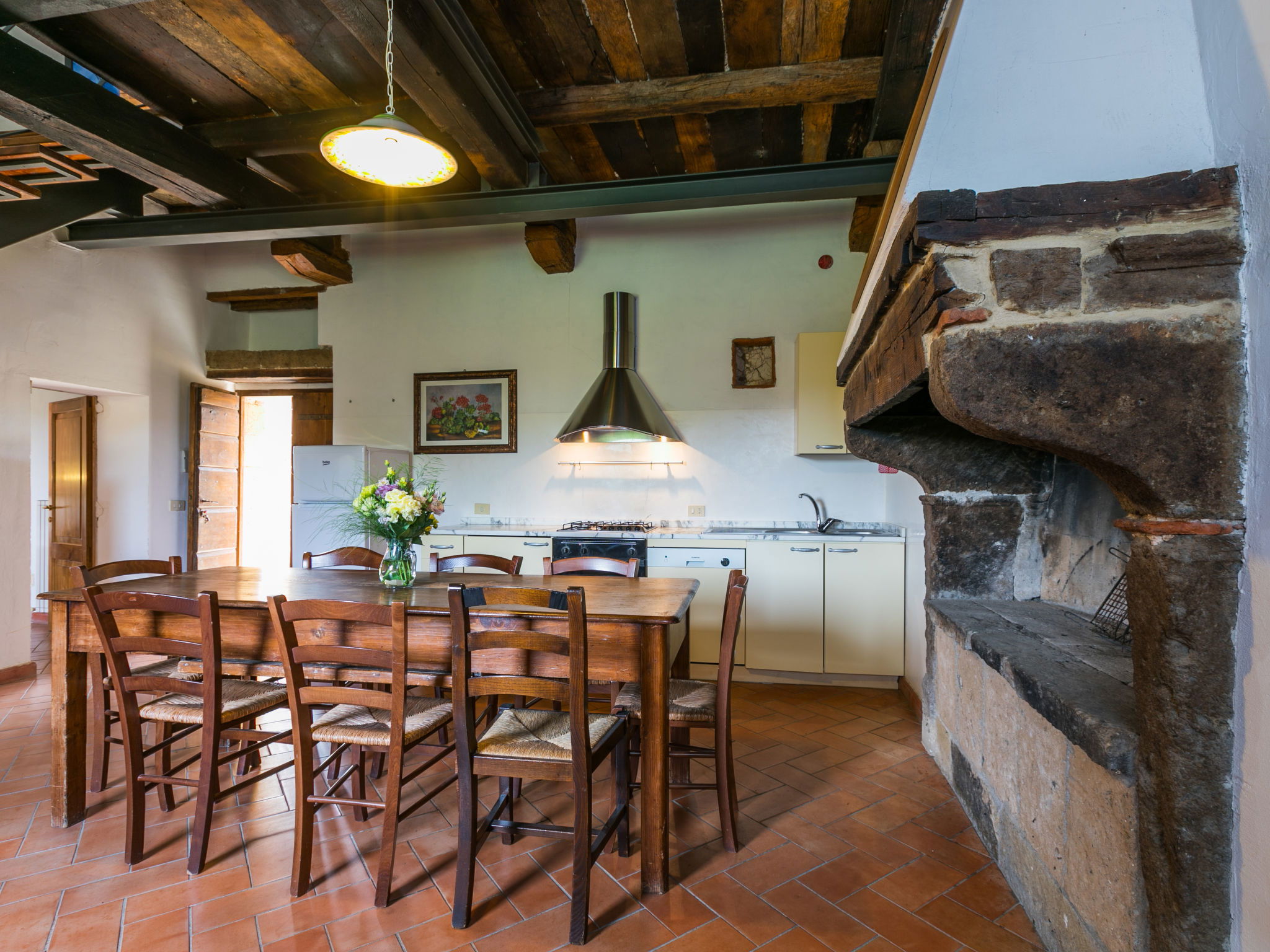 "Il Piccione", 20-room house 240 m2 on 3 levels. Spacious, simple and rustic furnishings: living/dining room with separate WC. Exit to the terrace. 1 open double bedroom with dining table, kitchen corner and shower/bidet/WC. Exit to the terrace. Open kitchen (oven, dishwasher, 5 gas rings) with open-hearth fireplace and dining table. Exit to the terrace. Upper floor: 2 rooms, each room with 1 sofabed, 1 double bed and shower/bidet/WC. (exterior staircase), 1 double bedroom with shower/bidet/WC. (exterior staircase) living/dining room with kitchen corner. 1 double bedroom with shower/bidet/WC. 1 room, on 2 levels with 2 beds, 1 double bed and shower/bidet/WC. Open kitchen (oven, dishwasher, 4 gas rings). 2nd upper floor: 2 double bedrooms, each room with shower/bidet/WC. Gas heating. Natural stone floors. Large terrace roofed, 2 small terraces roofed, patio, porch. Terrace furniture, barbecue, deck chairs. Facilities: washing machine (extra). Safe. Internet (WiFi, free). Please note: one double bedroom is outside the apartment. Maximum 3 pets/ dogs allowed. No internal connecting door between the separated properties. IT053026B45JNWUDOS