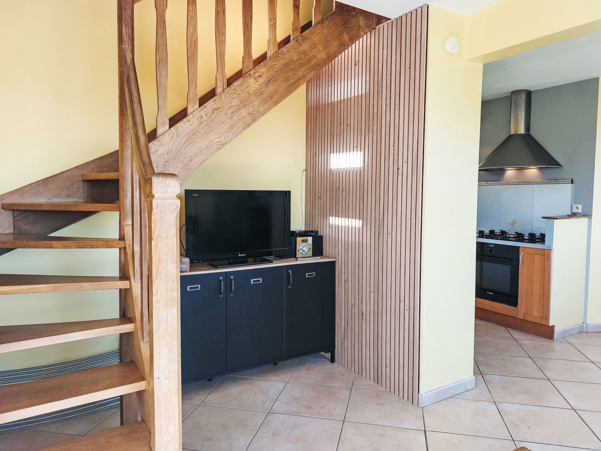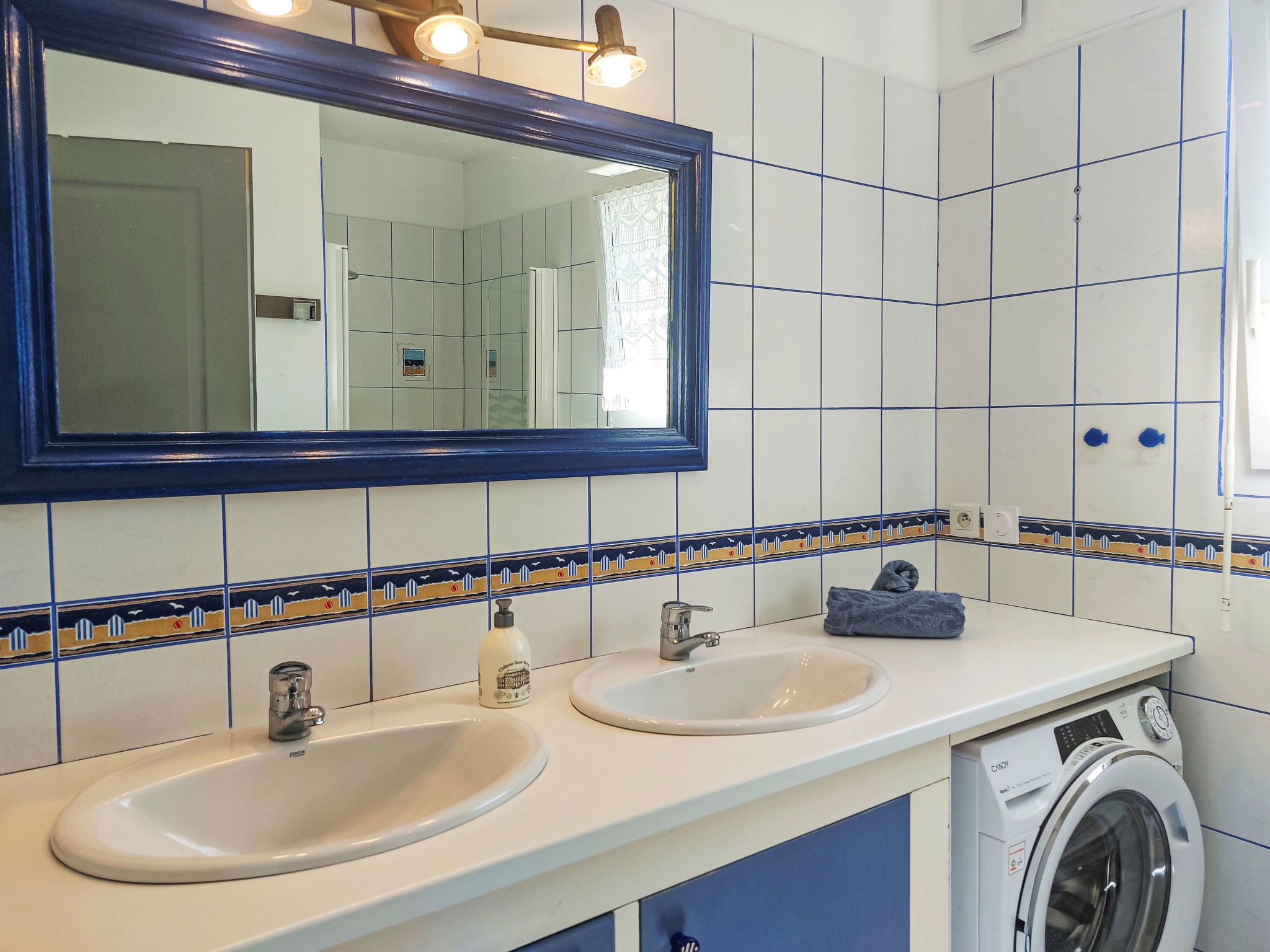"de la Plage", 4-room house 80 m2 on 2 levels. Beautiful and cosy furnishings: living/dining room with Scandinavian wood stove, dining table and satellite TV (flat screen), hi-fi system and DVD. Open kitchen (oven, dishwasher, 5 gas rings, toaster, kettle, microwave, freezer, electric coffee machine). Exit to the patio. Shower, sep. WC, double hand-basin. Upper floor: 1 room with sloping ceilings with 1 french bed (140 cm, length 190 cm). 2 rooms with sloping ceilings, each room with 2 beds (90 cm, length 190 cm). Electric heating. Terrace furniture, barbecue, deck chairs (2). Facilities: washing machine, iron, children's high chair, baby cot. Please note: non-smoking house. Maximum 1 pet/ dog allowed. Smoke alarm.