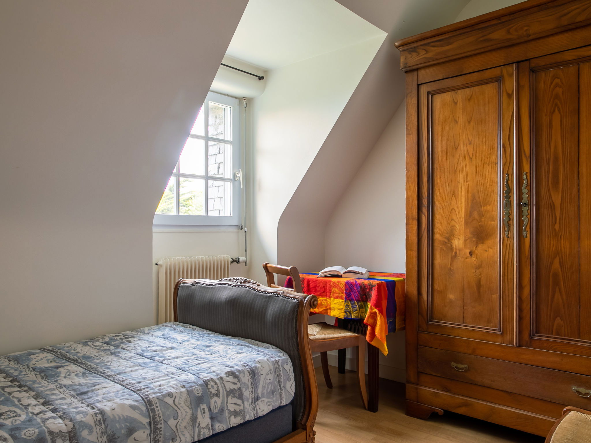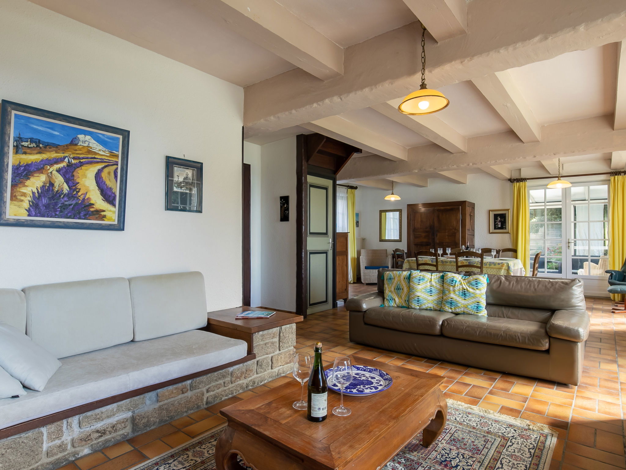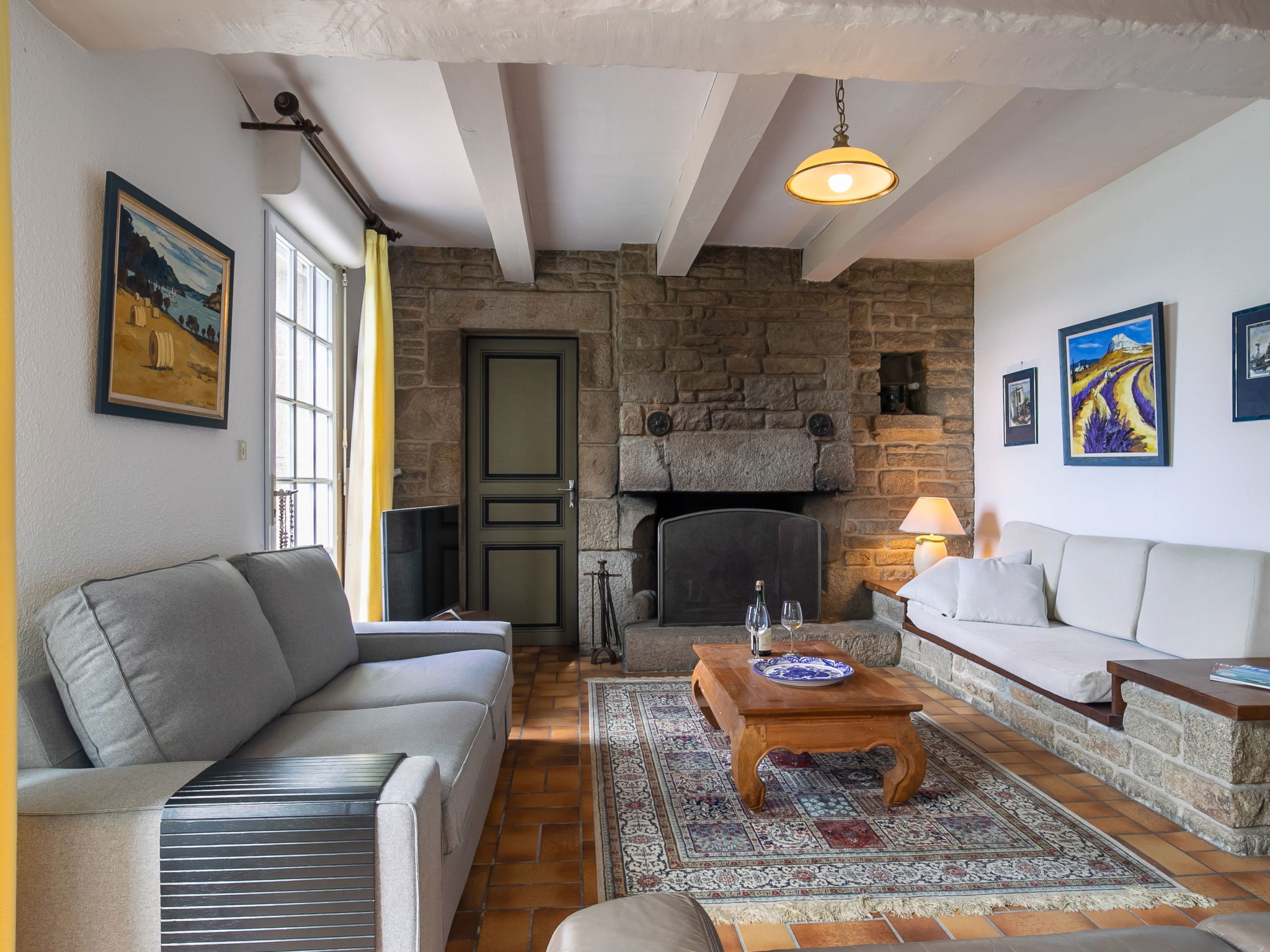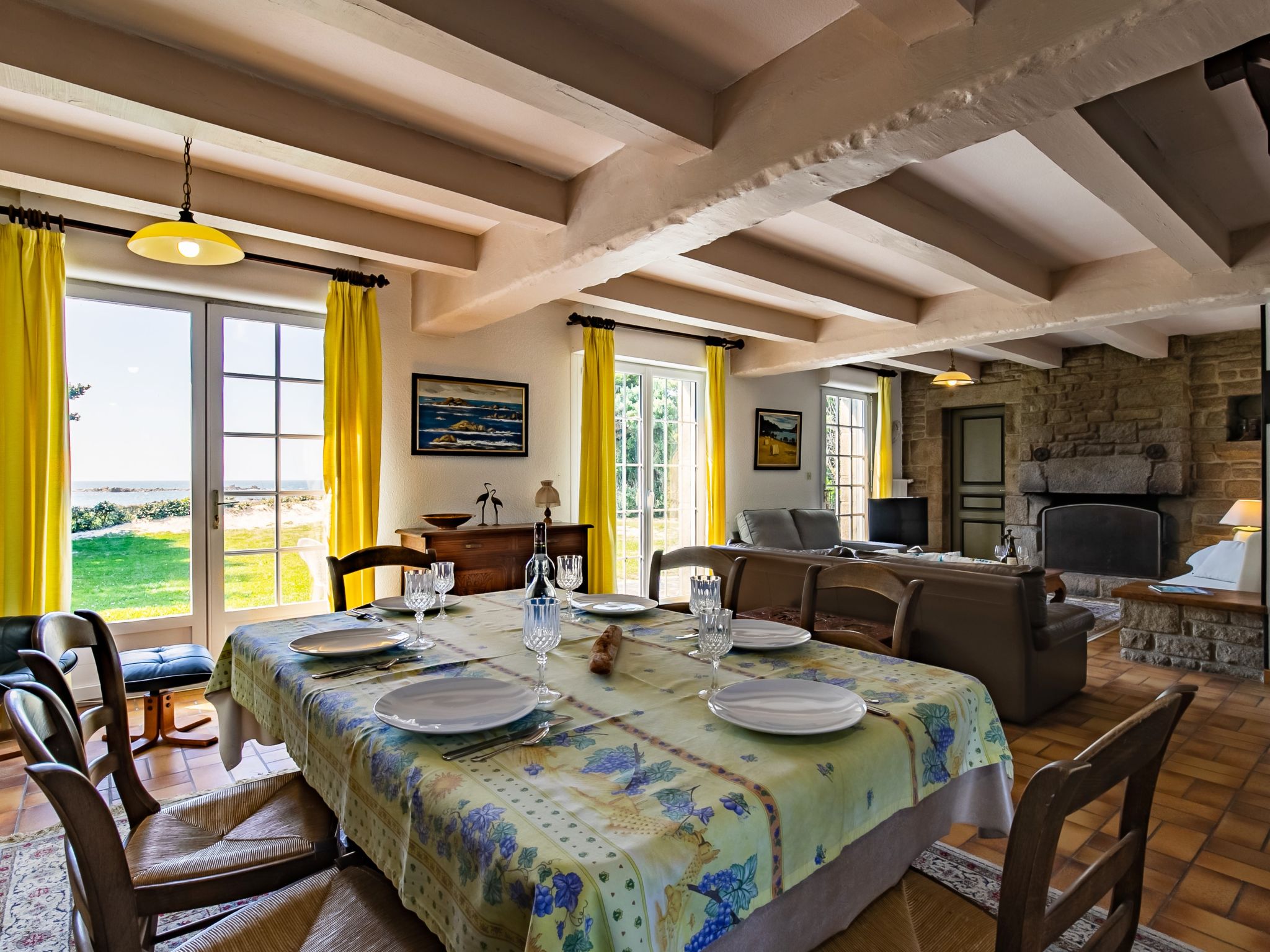 "La Rejeane", 5-room house 140 m2 on 2 levels. Cosy furnishings: living/dining room with panoramic window with open-hearth fireplace, dining table and satellite TV. Exit to the garden, to the veranda. Small living room with veranda with dining table. Exit to the terrace. 1 room with 1 french bed (140 cm, length 190 cm), shower. Exit to the garden. Kitchen (oven, dishwasher, 3 induction hot plates, toaster, microwave, electric coffee machine). Sep. WC. Upper floor: 2 rooms with sloping ceilings, each room with 1 french bed (1 x 160 cm, length 200 cm). 1 room with sloping ceilings with 1 bed (90 cm, length 190 cm). Bath/shower, sep. WC, double hand-basin. Oil heating. Wooden floors, natural stone floors, carpet. Terrace partly roofed. Terrace furniture, sitting area, box-room. Marvellous view of the sea. Facilities: washing machine, dryer, children's high chair, baby cot. Internet (WiFi, free). Please note: non-smoking house. Maximum 1 pet/ dog allowed. Smoke alarm. Offer by a private individual according to Art. 155, IV of CGI.
