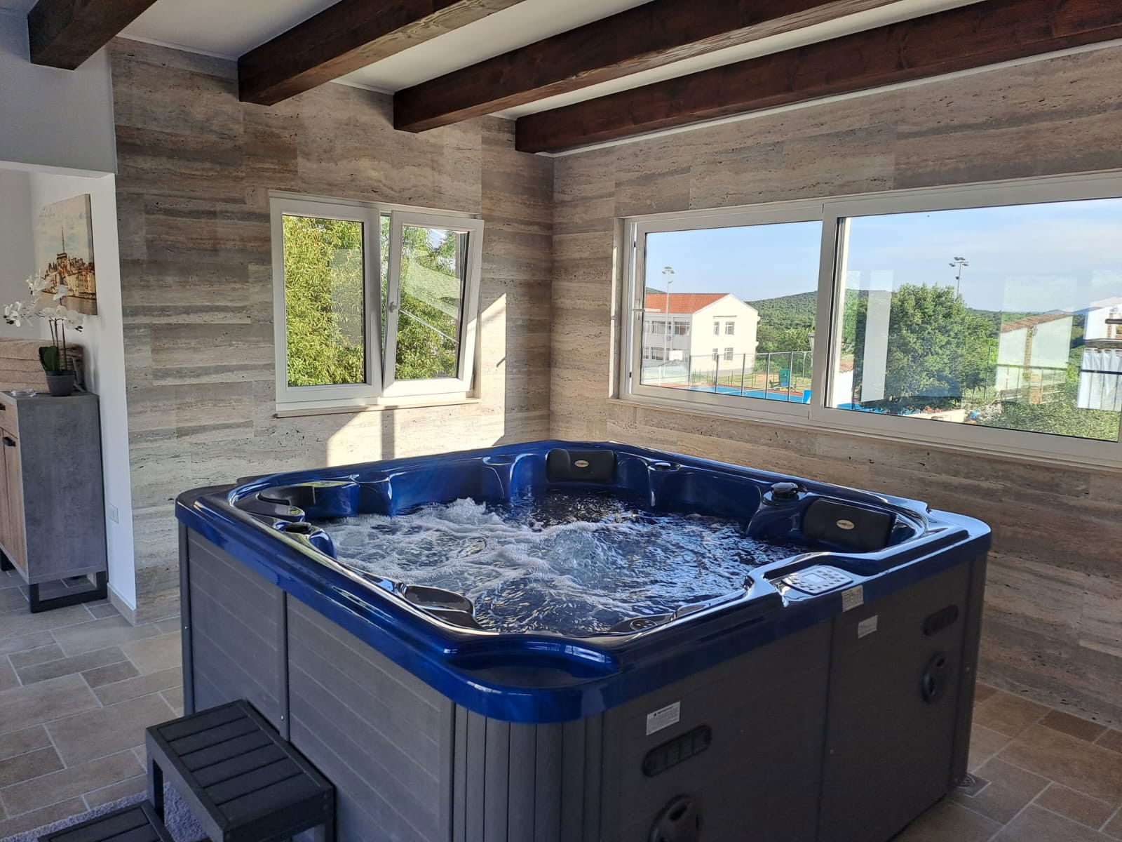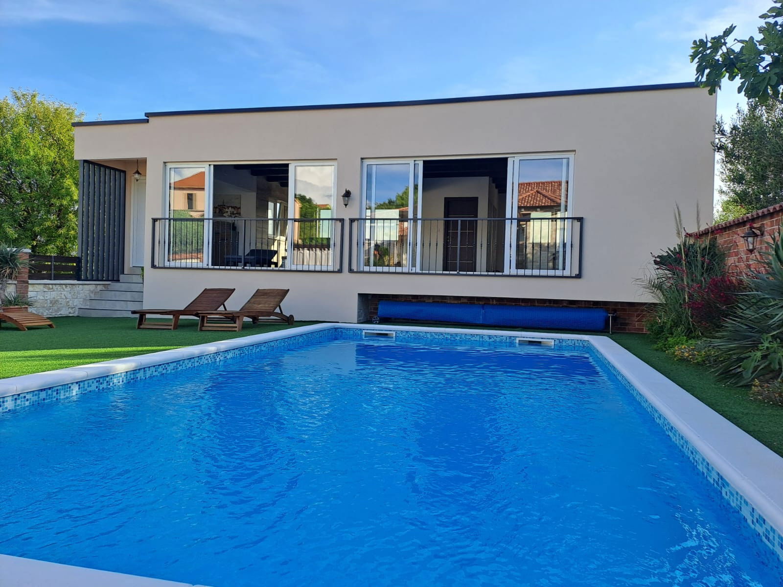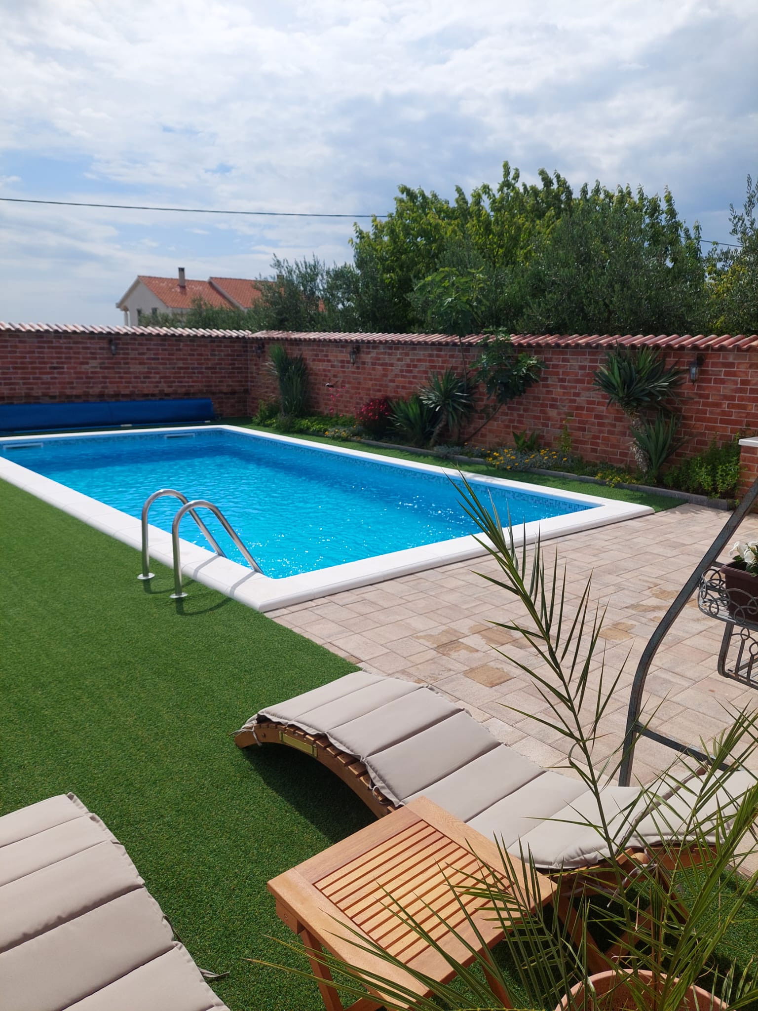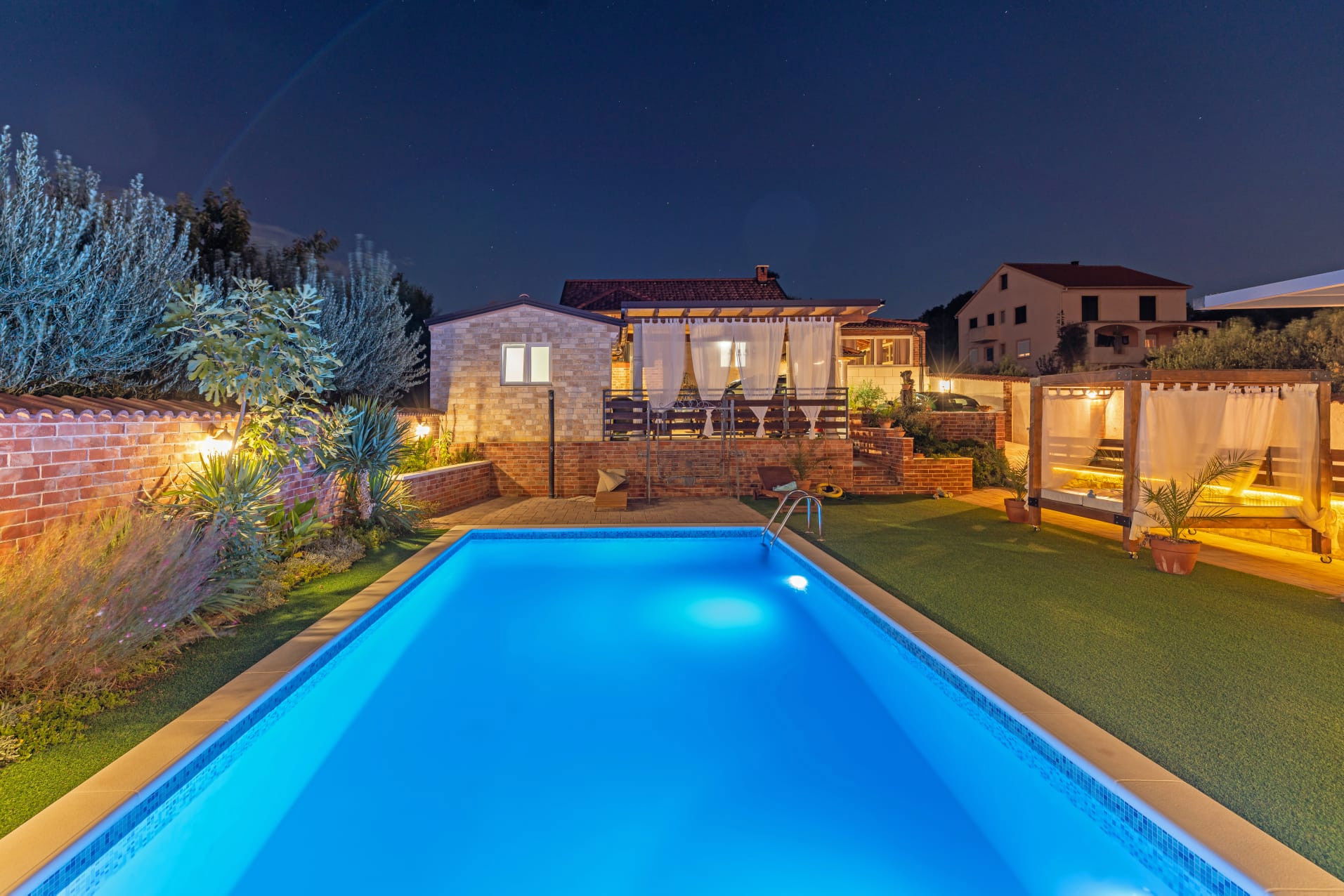 The outdoor terrace offers you the opportunity to refresh yourself in the 40 m2 swimming pool, next to which you can sunbathe and enjoy reading your favorite book. The beautifully landscaped garden will further relax you. In the yard there is also an outdoor wood or charcoal grill, where you can spend summer evenings with a glass of wine and delicious Dalmatian dishes. There is also an outdoor covered table for eating and socializing until late at night, and an outdoor kitchen.