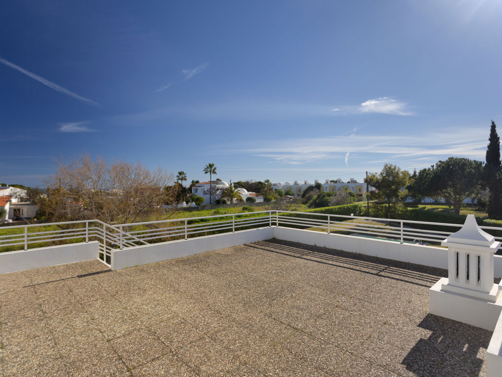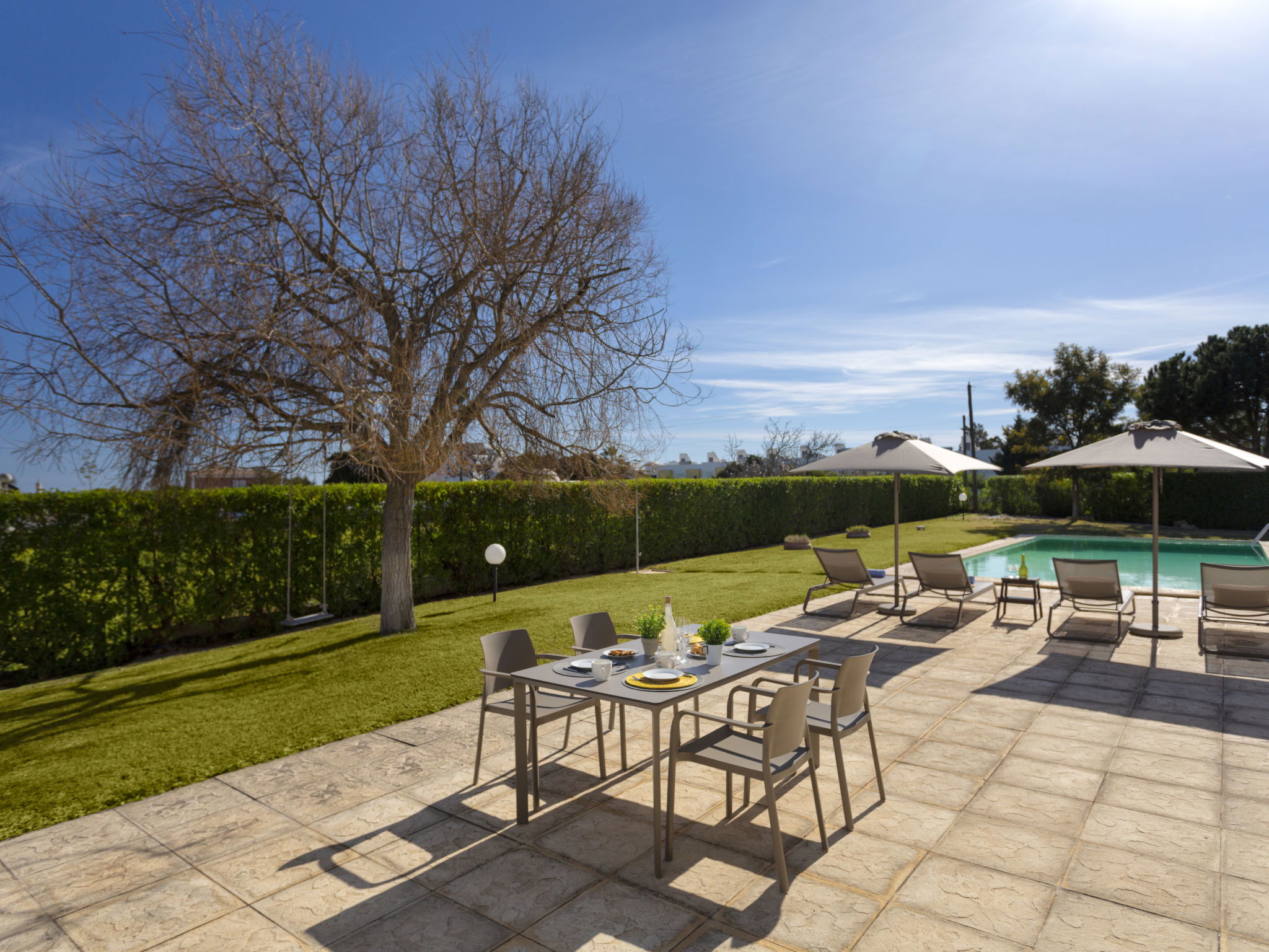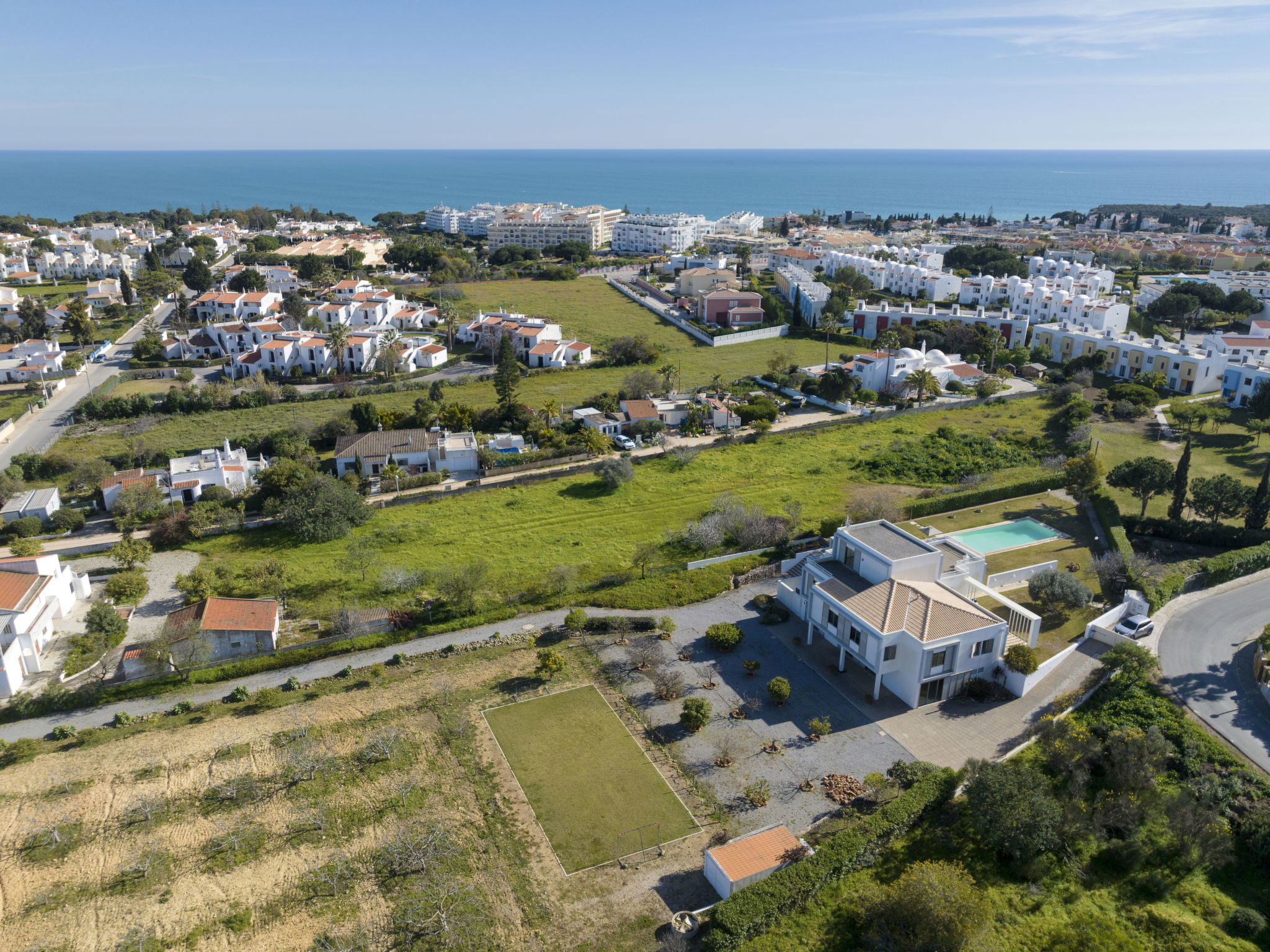 Very beautiful, cosy villa "Almond Tree", 2 storeys, detached, surrounded by trees and fields. Outside the resort, 3.4 km from the centre of Armação de Pera, in a quiet position residential area (villas), 1.3 km from the sea. Private: natural state property 2'520 m2 (fenced) with lawn and wildlife garden, beautiful garden to relax, swimming pool angular (5 x 12 m, depth 100 - 200 cm, seasonal availability: 01.Jan. - 31.Dec.) with salt-electrolysis pool-cleaning system. Outdoor shower, terrace, garden furniture, barbecue (swing), pool maintenance by the owner/gardener. In the house: WiFi, billiard table, air conditioning. Parking (for 4 cars). Grocery 800 m, supermarket 1.1 km, shopping centre 13 km, restaurant 650 m, bar 850 m, bakery 1.1 km, café 800 m, pedestrian zone 2.6 km, 40 minute walk to the centre, bus stop "Estrada Armação De Pera" 1.2 km, railway station "Alcantarilha" 12.3 km, sandy beach "Praia da Nossa Senhora da Rocha" 1.3 km, rocky beach "Praia da Cova Redonda" 1.3 km, diving center 3.4 km. Marina 13.9 km, golf course (18 hole) 9.5 km, surf school 3.8 km, indoor tennis centre 16.6 km, minigolf 1.5 km, riding stable 1.3 km, sports centre 16.2 km. Nearby attractions: Zoomarine 8.5 km, Algarve Shopping 11.5 km, Slide & Splash 9.5 km, Albufeira 17 km, Castelo de Silves 17.8 km, Krazy World 16.5 km. Hiking paths: Monchique Passeios na Serra 40.1 km. Please note: car recommended. Object suitable for 12 adults. The owner does not accept any youth groups. Loading and unloading of baggage is possible at the holiday house. Small football field on the land of the house for family fun.