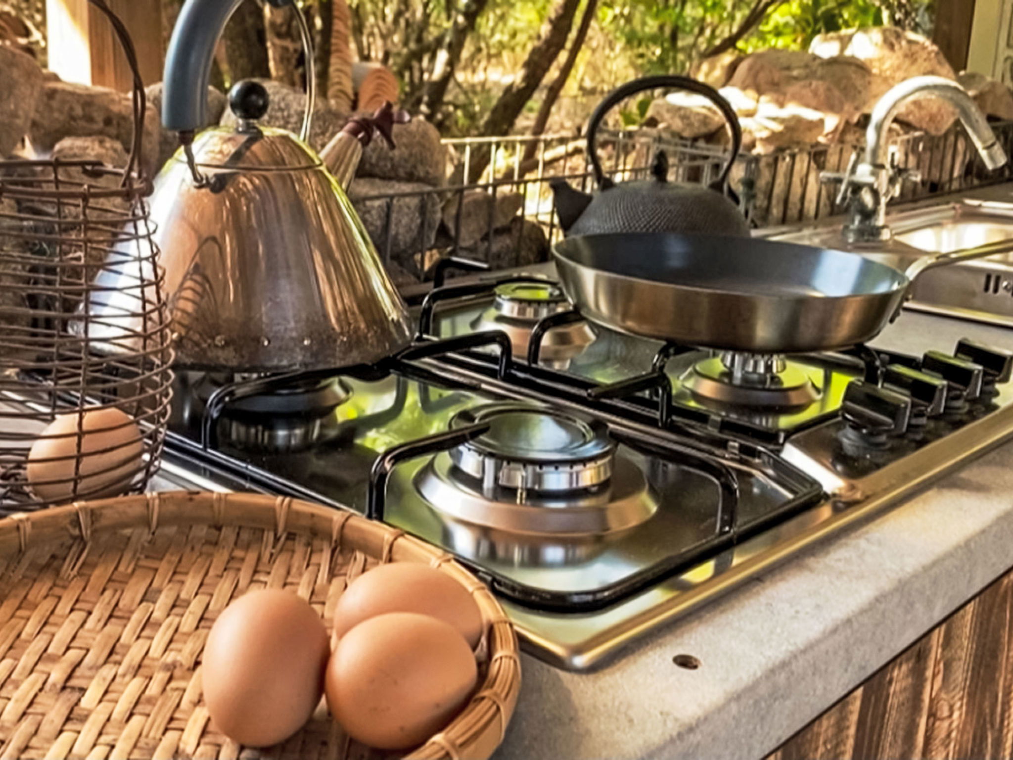2-room house 40 m2. Very rustic and wooden furniture furnishings: living room. 1 room with 1 double bed. Open kitchen (oven, Gas stove, toaster, kettle, electric coffee machine). Shower/WC. No heating option. Terrace 25 m2 partly roofed. Terrace furniture. Beautiful view of the forest. Facilities: washing machine, mosquito net. Internet (WiFi, free). Please note: maximum 1 pet/ dog allowed. Fire extinguisher. IT090084C2000T7575
