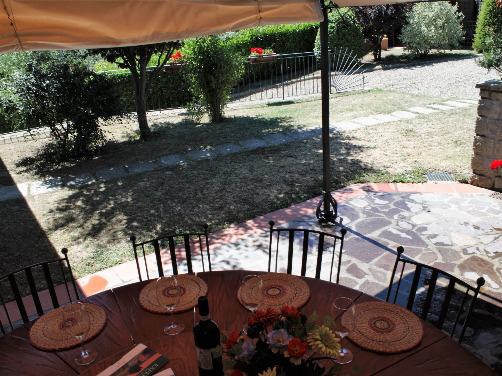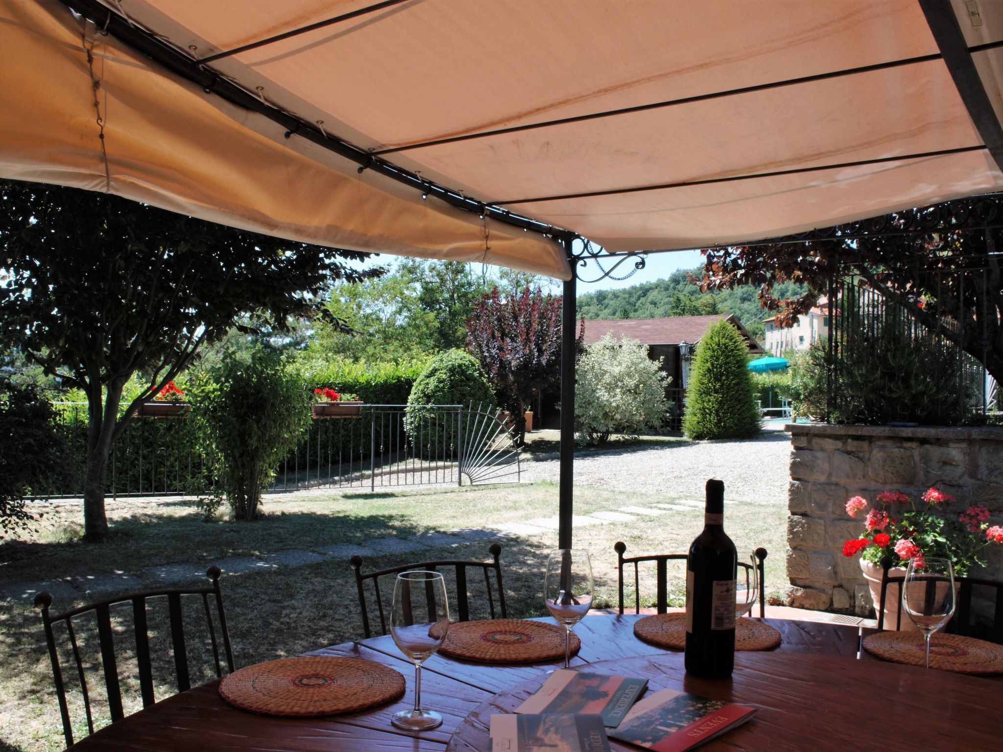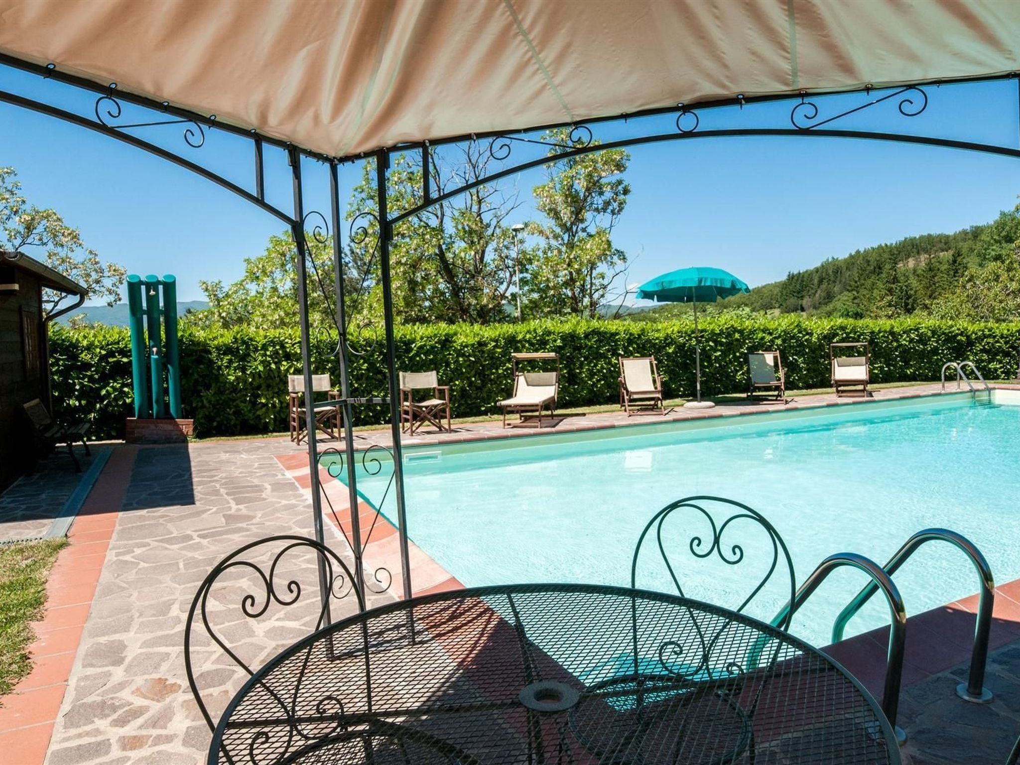 You can sit comfortably on the veranda and relax with a good glass of wine or use the completely enclosed garden (partly with a hedge, partly with a stone wall), for your own exclusive use and enjoy the view of the beautiful surroundings. You can cool off in the big pool (6 x 12m and 1.60m deep), which is open from April to October. Around the pool there are not only various sun loungers and parasols, but also other garden furniture. There is also an outdoor toilet by the pool, which has a wash corner. You can use the grill to prepare meals. There is also a wood-burning stove available for use. You can play a round of table tennis. There are four car parking spaces.