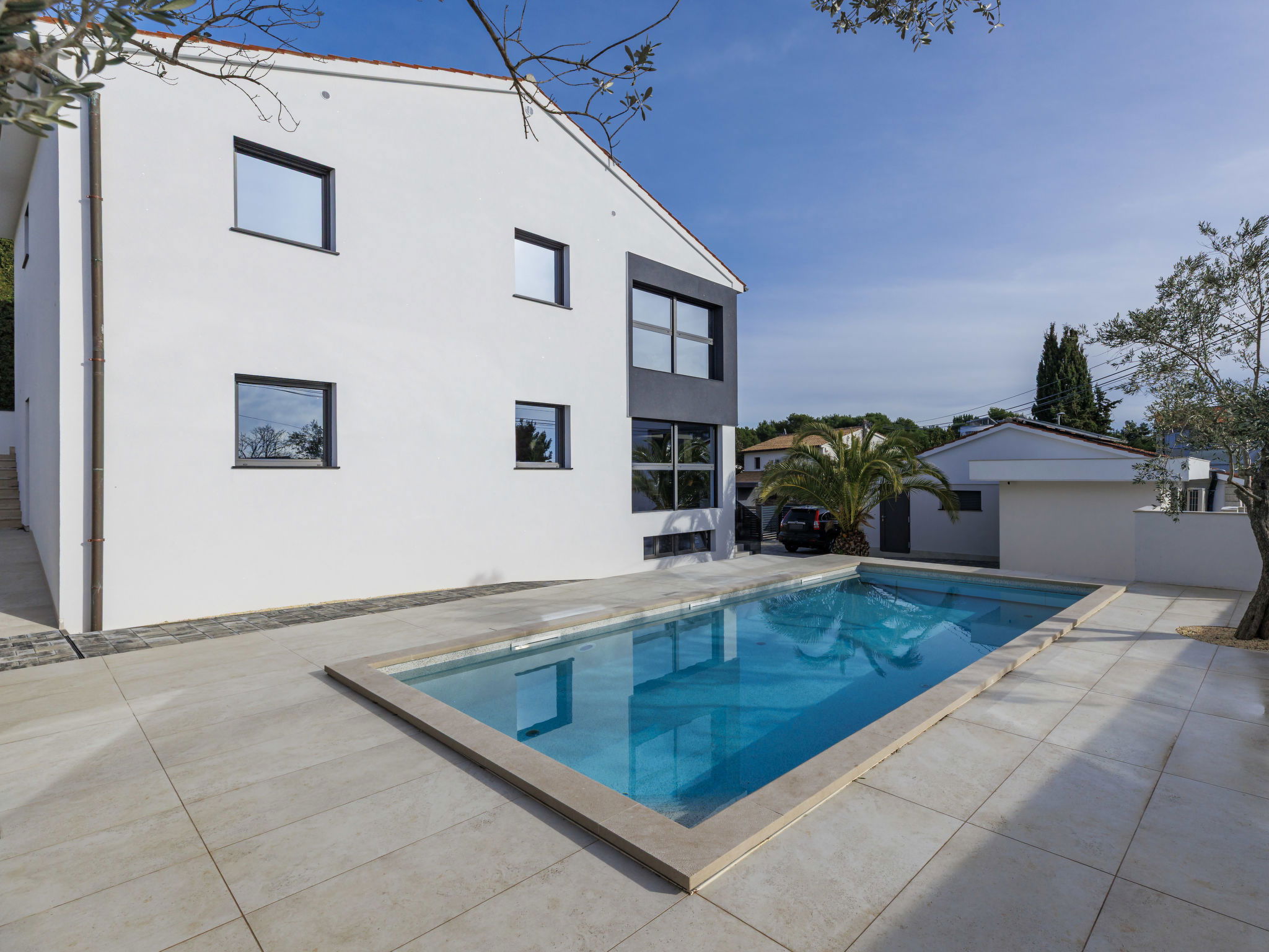 Premantura 11 km from Pula: Beautiful villa "Ventus", 2 storeys. 400 m from the centre of Premantura, in a quiet, sunny position, 400 m from the sea. Private: property 600 m2 (fenced), garden with flowers, swimming pool angular, heated (8 x 4 m, depth 140 cm, seasonal availability: 01.Apr. - 01.Nov.) with internal staircase. WC in the pool area, outdoor shower, terrace (20 m2), garden furniture, barbecue, pool maintenance by the owner/gardener. In the house: internet access, sauna. Parking (for 2 cars) at the house on the premises, single garage (extra). E-charging station. Shop 400 m, restaurant, bicycle rental 200 m, bus stop 180 m, pebble beach, rocky beach 400 m. Surf school 400 m, riding stable 3 km, walking paths from the house, cycle lane 800 m. Nearby attractions: Amphiteatar 11 km, Park prirode Kamenjak 1 km. The owner does not accept any youth groups.