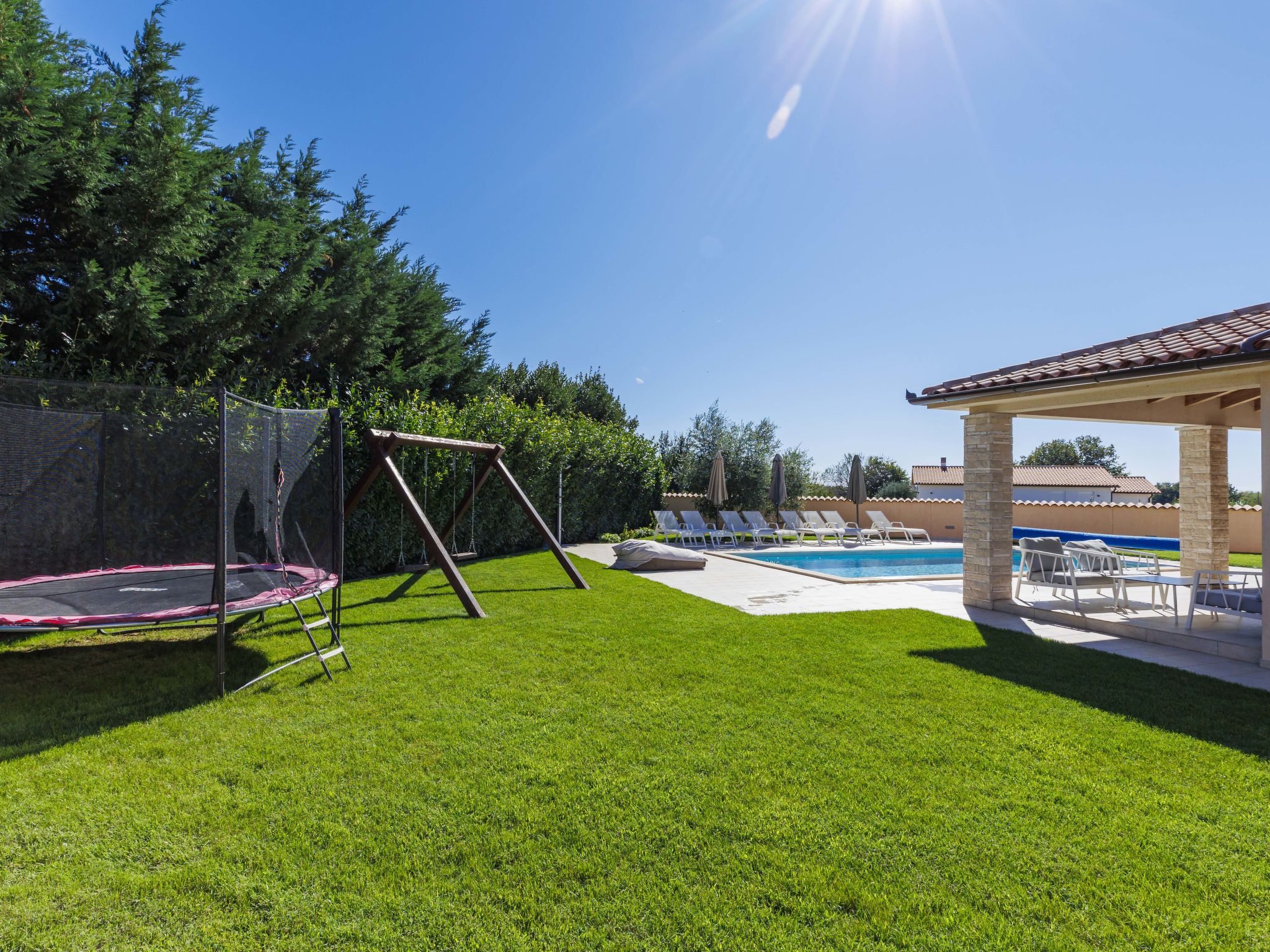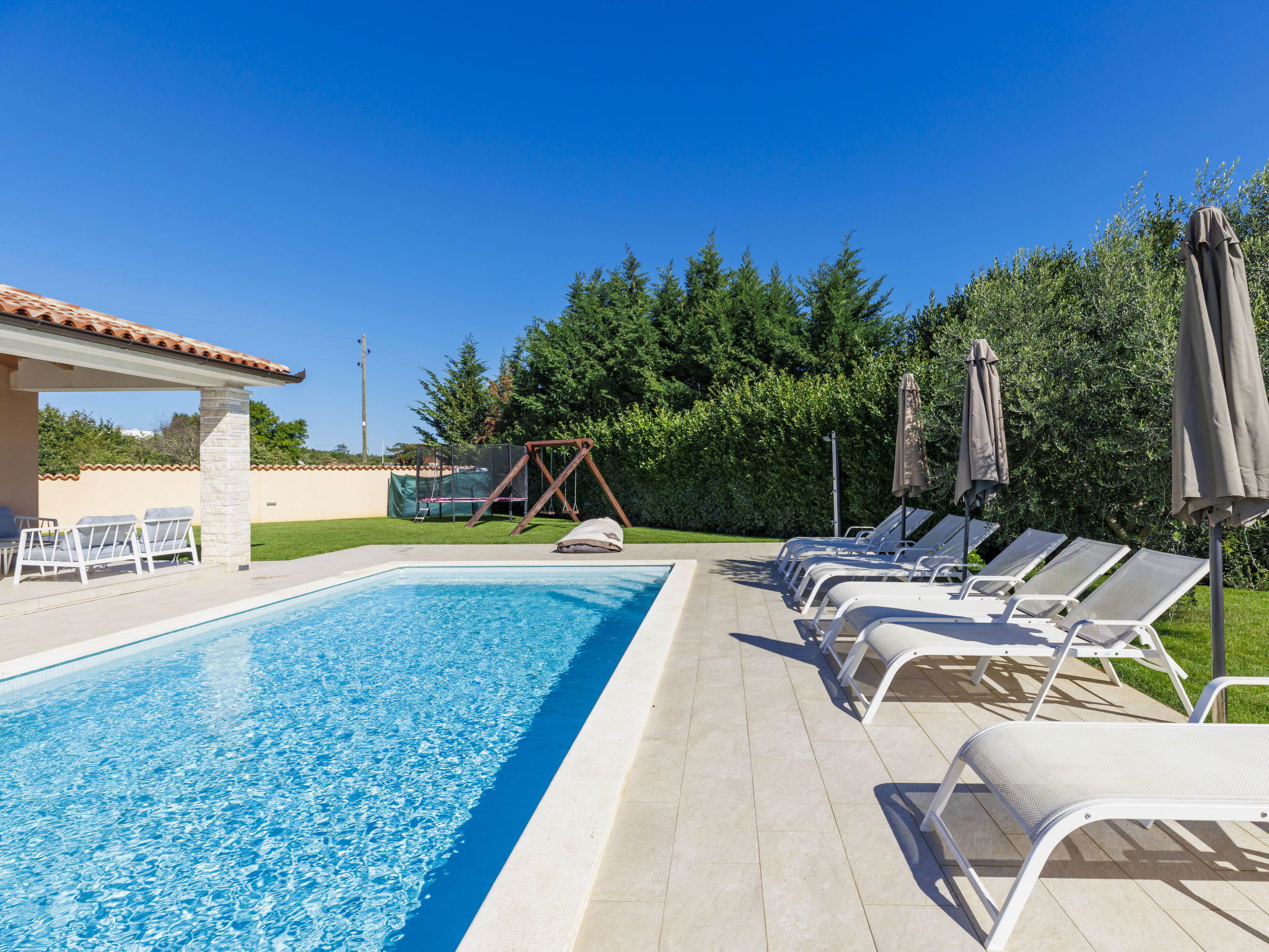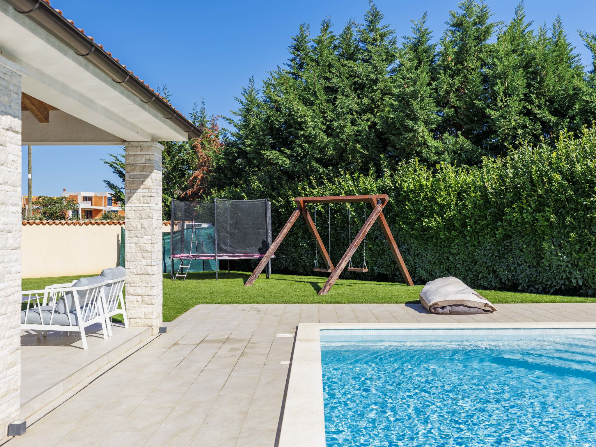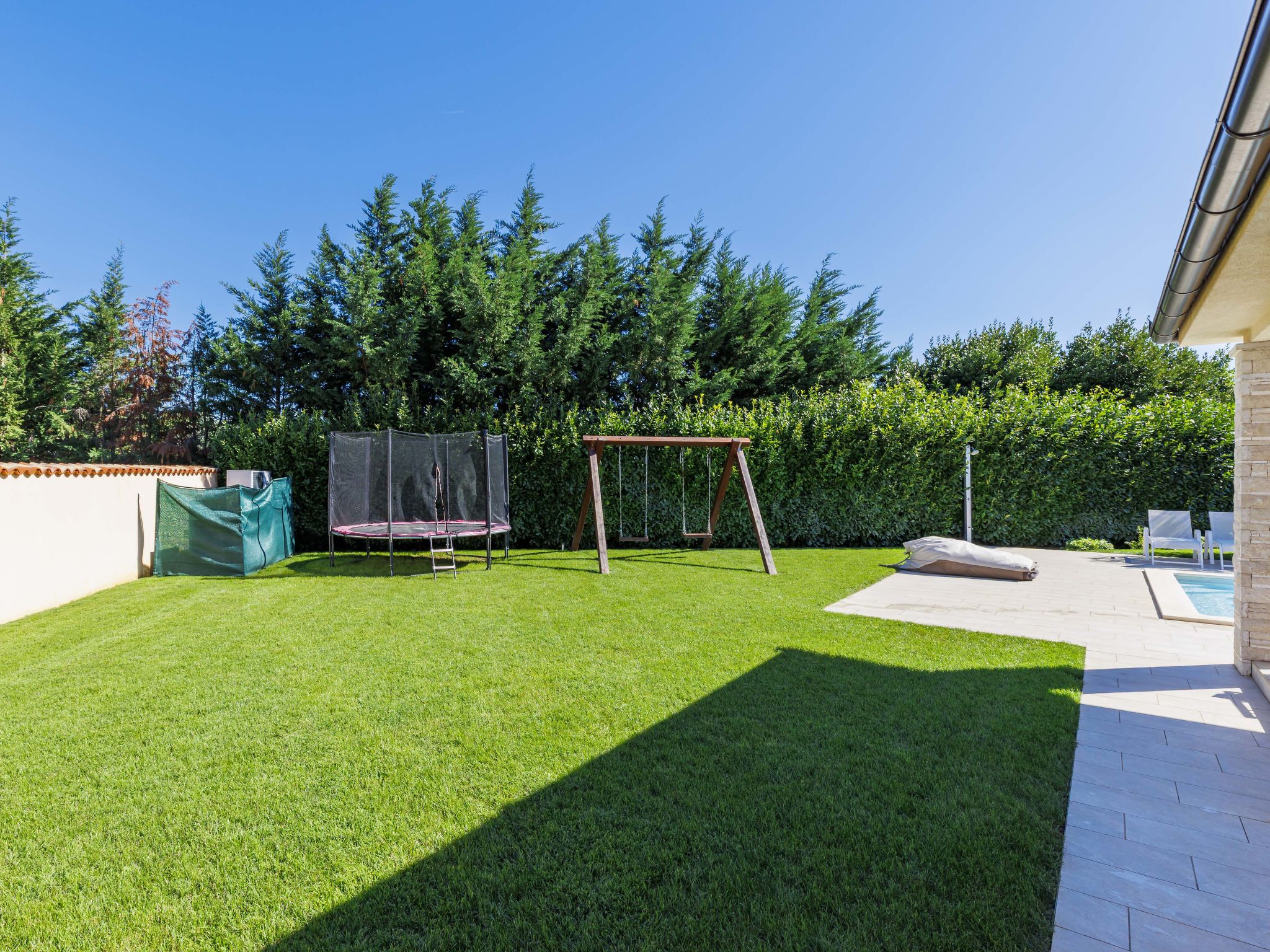 Villa "Magica", 2 storeys. In the hamlet Loborika 6 km from the centre of Pula, 6 km from the centre of Marčana, in a quiet, sunny position, 8 km from the sea. Private: property 1'200 m2 (fenced), garden with wildlife garden and flowers, swimming pool angular, heated (8 x 4 m, depth 140 cm, seasonal availability: 01.Apr. - 01.Nov.) with internal staircase. Outdoor shower, terrace (30 m2), garden furniture, barbecue, children's playground (swing), pool maintenance by the owner/gardener. In the house: internet access, trampoline, washing machine. Parking (for 4 cars) at the house on the premises. Shop 2.3 km, supermarket 6 km, restaurant 2 km, café 2.3 km, bus stop 2.3 km, sandy beach 16 km pebble beach 13 km. Tennis 15 km, riding stable 5 km, walking paths from the house 100 m, cycle lane 150 m. Nearby attractions: Amphitheater 8 km, National park Brijuni 14 km, Nature park Rt. Kamenjak 18 km.