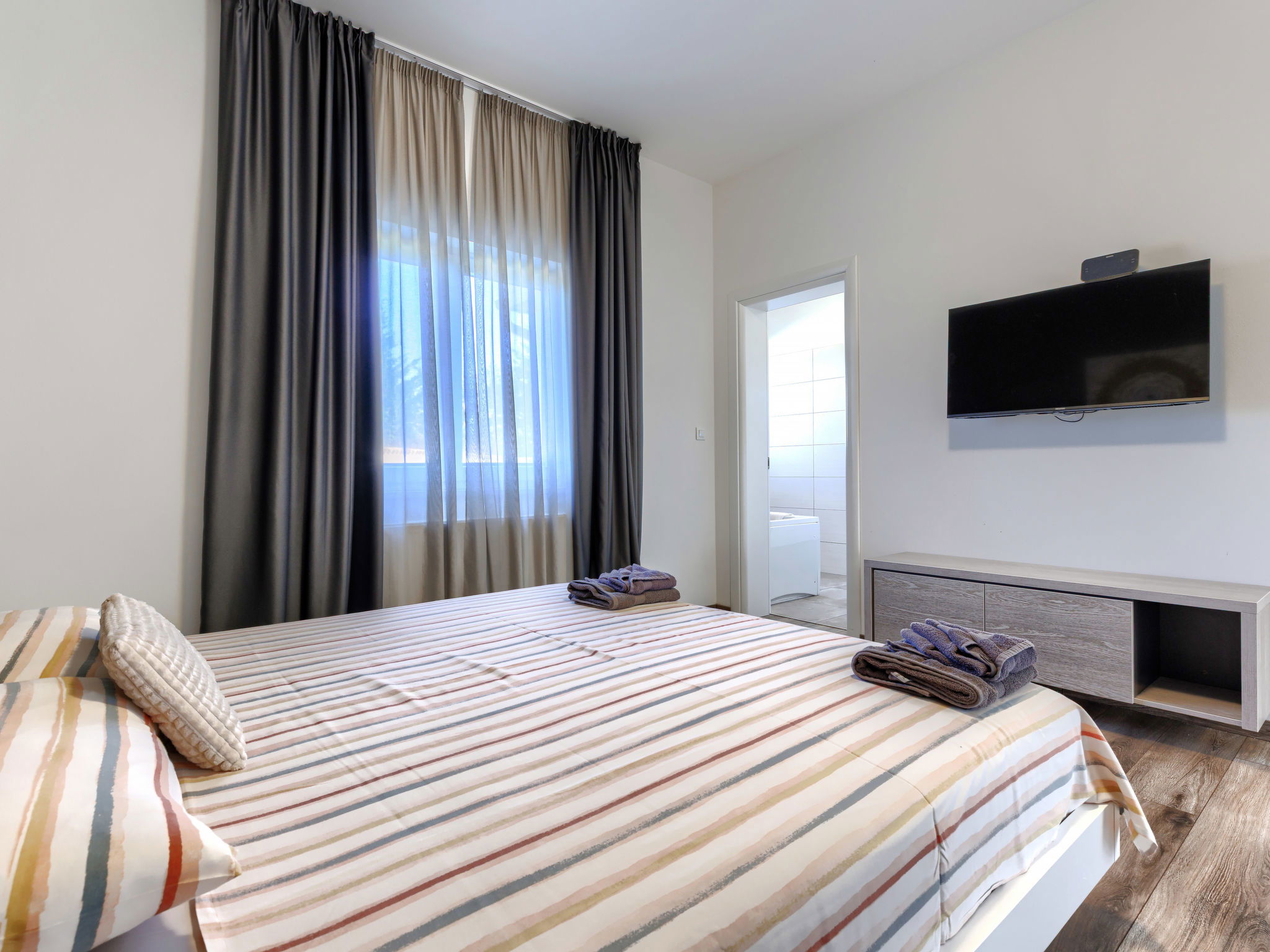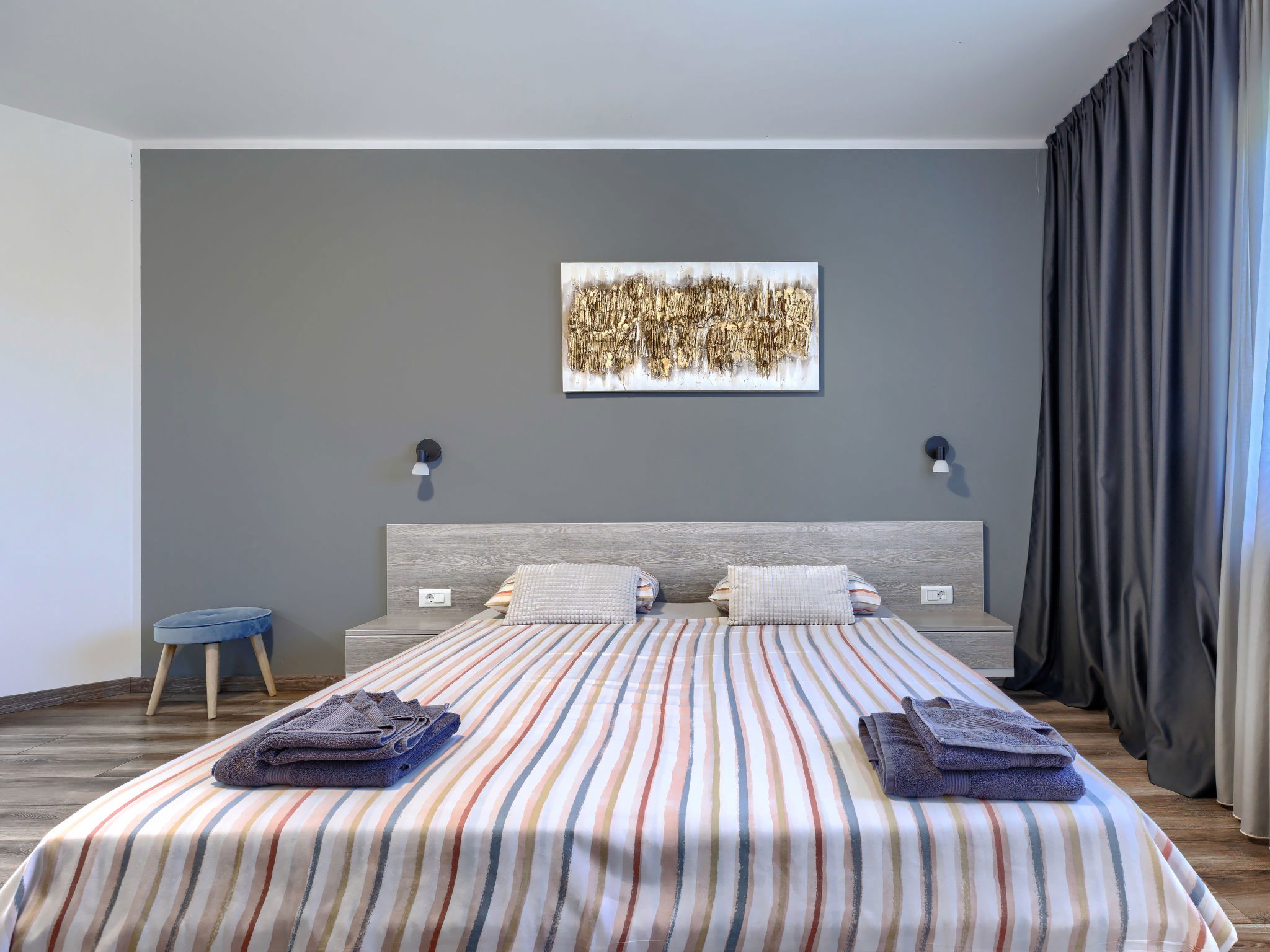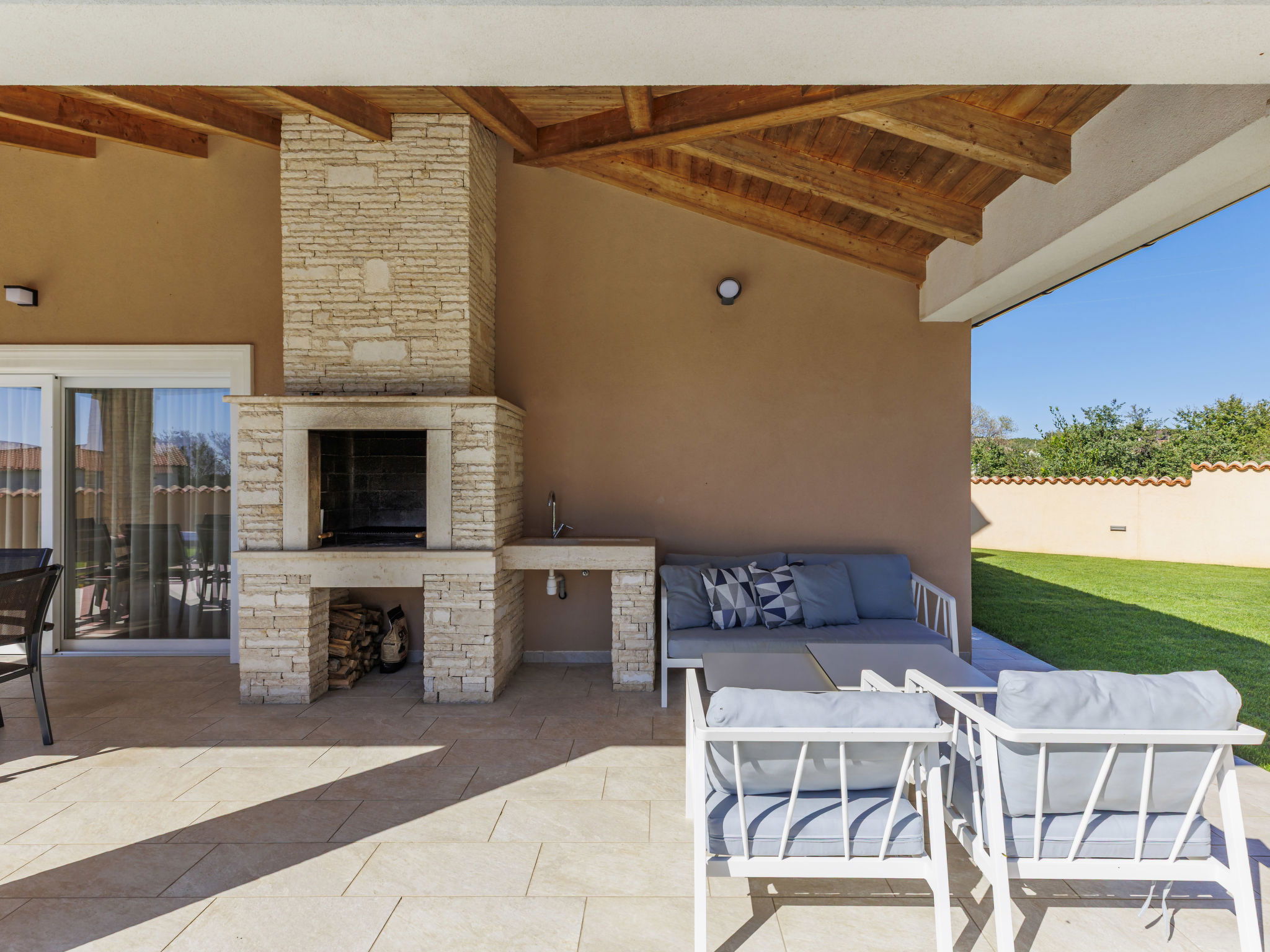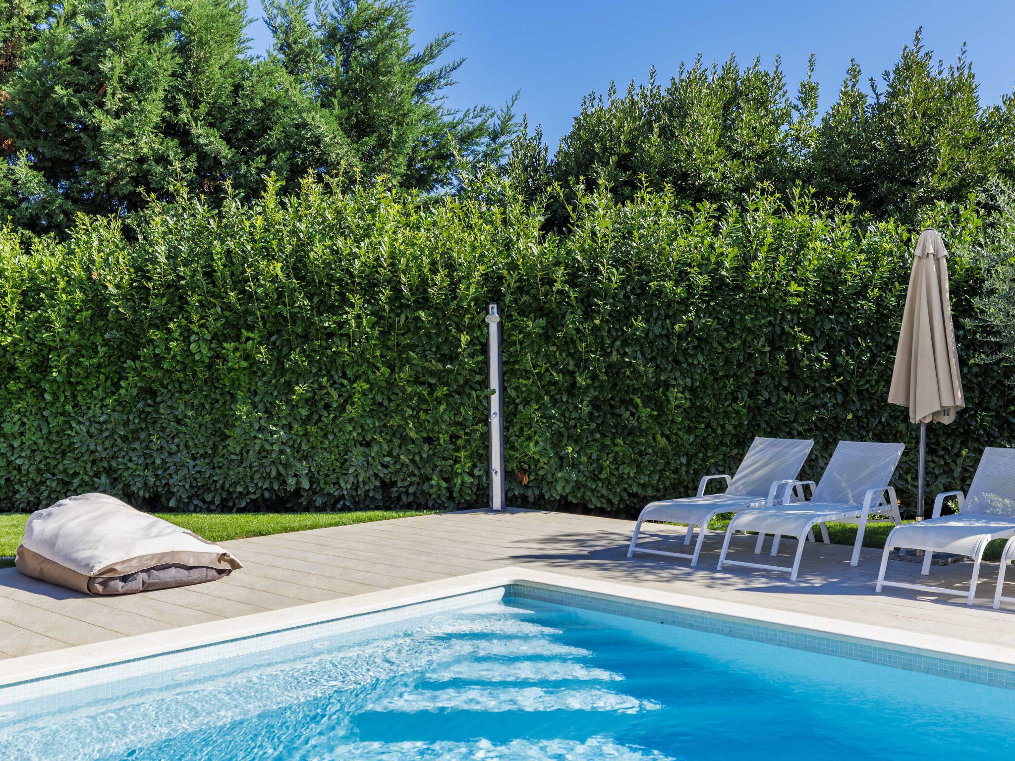 Villa "Magica", 2 storeys. In the hamlet Loborika 6 km from the centre of Pula, 6 km from the centre of Marčana, in a quiet, sunny position, 8 km from the sea. Private: property 1'200 m2 (fenced), garden with wildlife garden and flowers, swimming pool angular, heated (8 x 4 m, depth 140 cm, seasonal availability: 01.Apr. - 01.Nov.) with internal staircase. Outdoor shower, terrace (30 m2), garden furniture, barbecue, children's playground (swing), pool maintenance by the owner/gardener. In the house: internet access, trampoline, washing machine. Parking (for 4 cars) at the house on the premises. Shop 2.3 km, supermarket 6 km, restaurant 2 km, café 2.3 km, bus stop 2.3 km, sandy beach 16 km pebble beach 13 km. Tennis 15 km, riding stable 5 km, walking paths from the house 100 m, cycle lane 150 m. Nearby attractions: Amphitheater 8 km, National park Brijuni 14 km, Nature park Rt. Kamenjak 18 km.