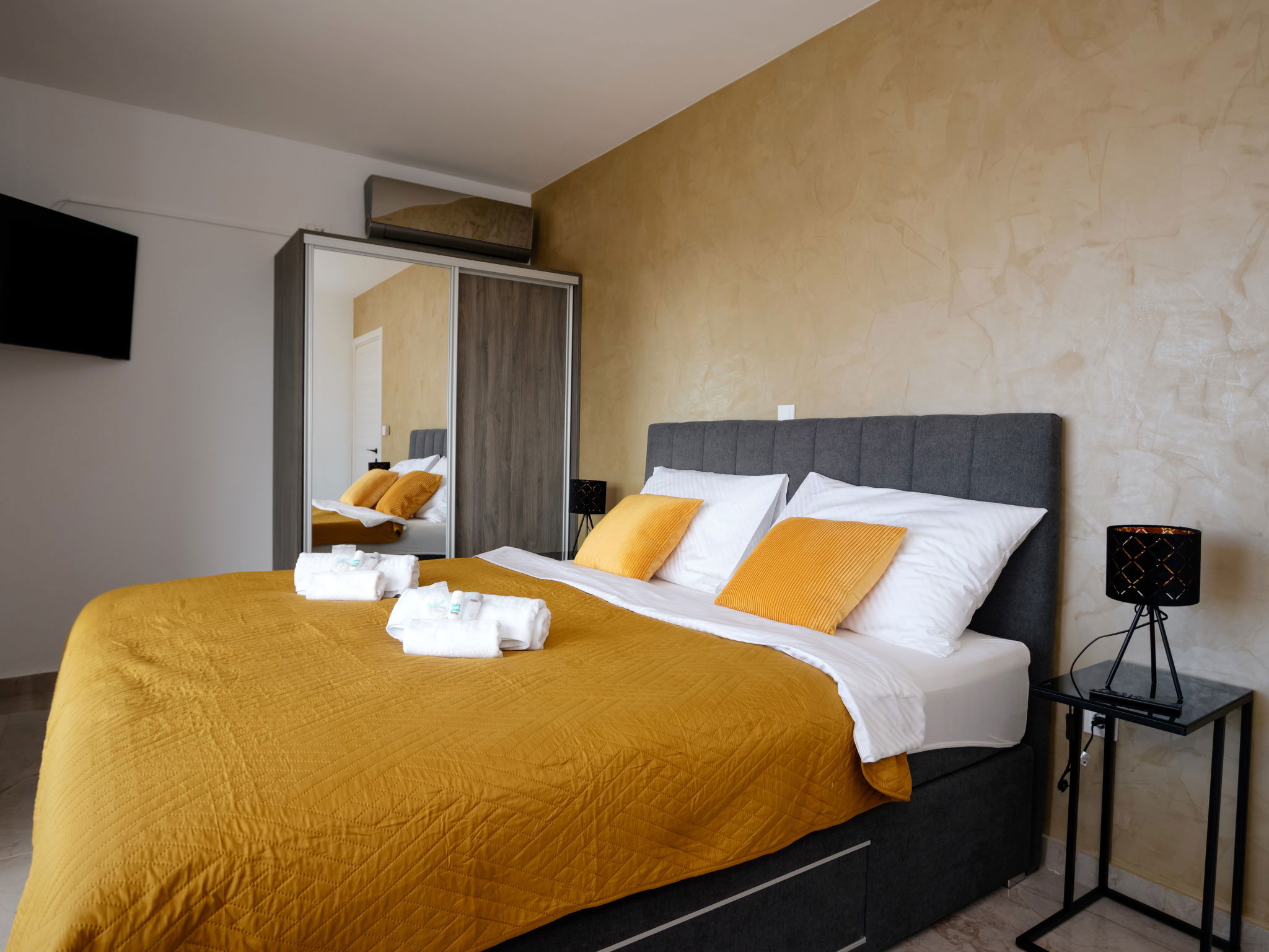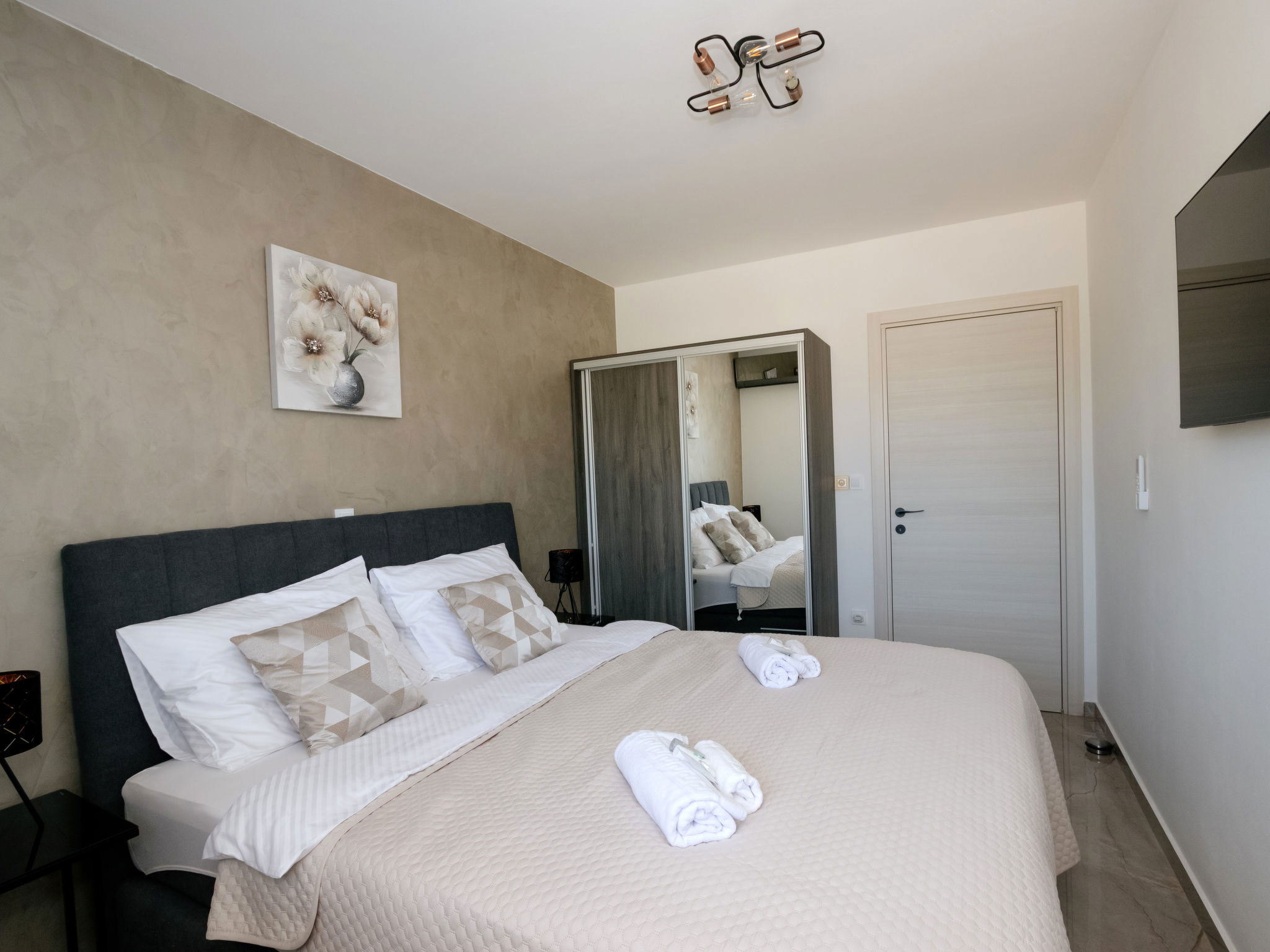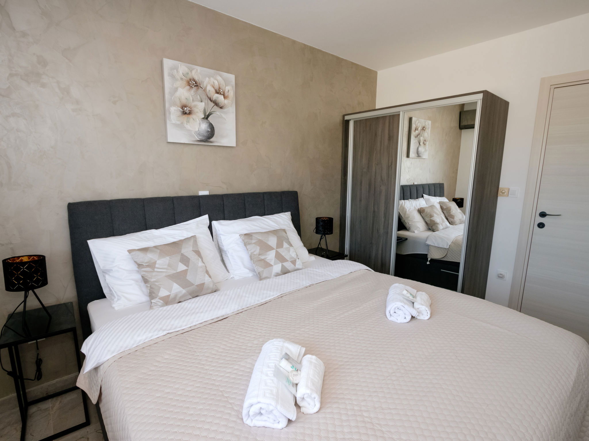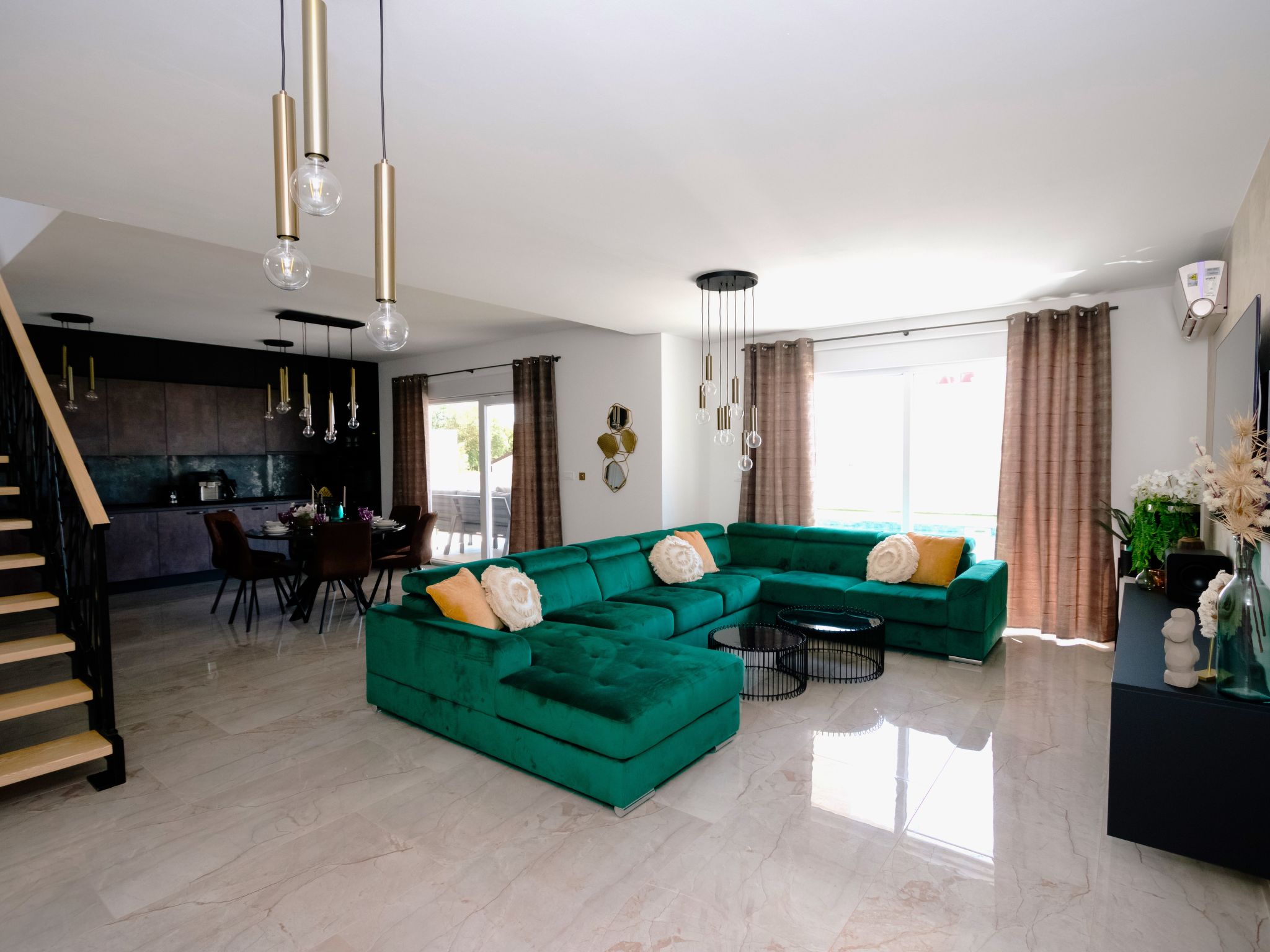 4-room villa 150 m2 on 2 levels. Living/dining room with satellite TV (flat screen), air conditioning. Exit to the terrace, to the swimming pool. 1 room with 1 french bed (180 cm, length 200 cm), satellite TV (flat screen), air conditioning. Exit to the garden, to the swimming pool. Open kitchen (oven, dishwasher, 4 induction hot plates, toaster, kettle, microwave, freezer, electric coffee machine). Shower/WC, sep. WC. Upper floor: 2 rooms, each room with 1 french bed (180 cm, length 200 cm), satellite TV (flat screen), air conditioning. Exit to the terrace. Shower/WC. No heating option. Deck chairs. Facilities: hair dryer. Internet (WiFi, free). Please note: non-smoking house. 1 pet/ dog allowed.