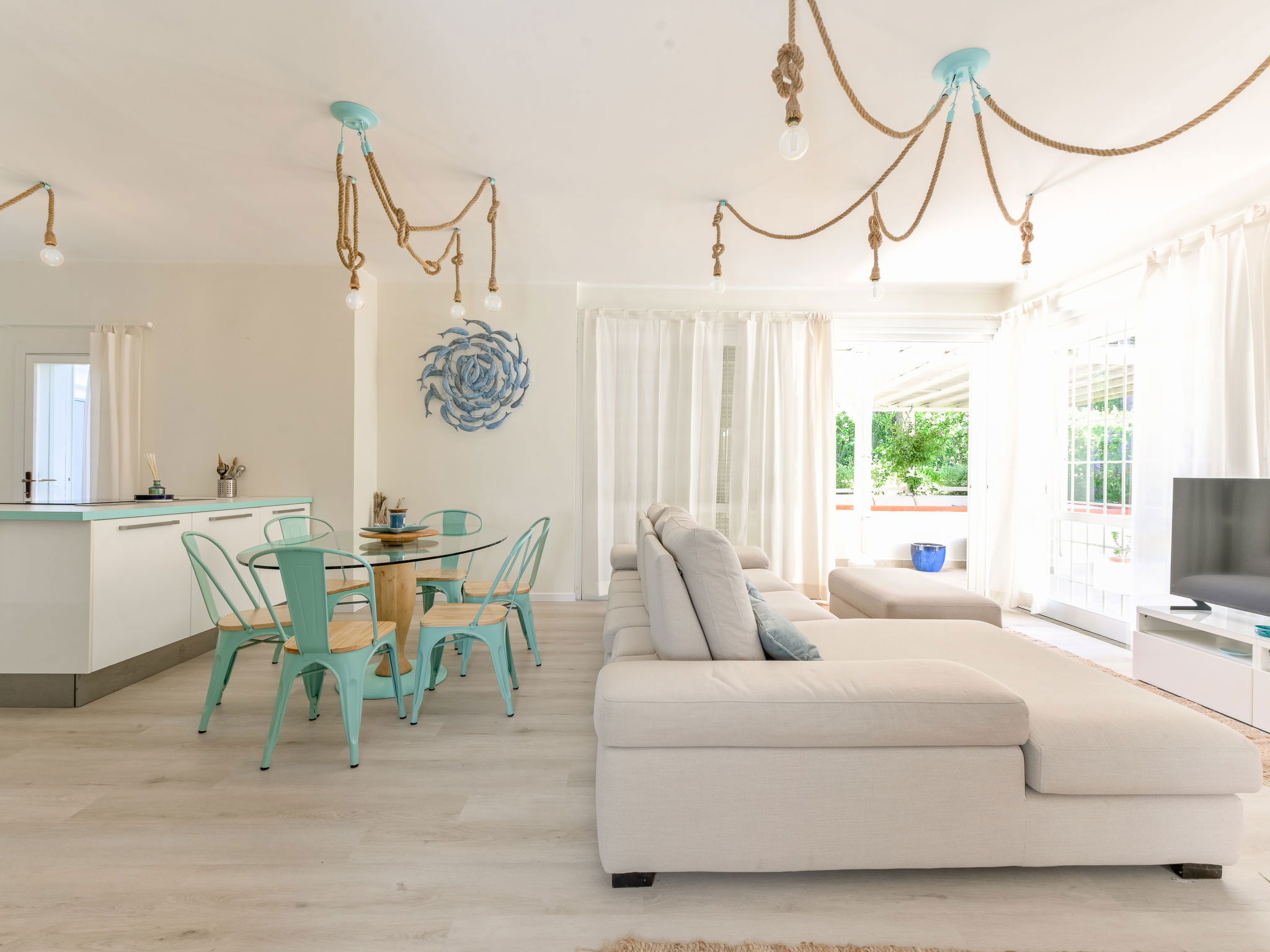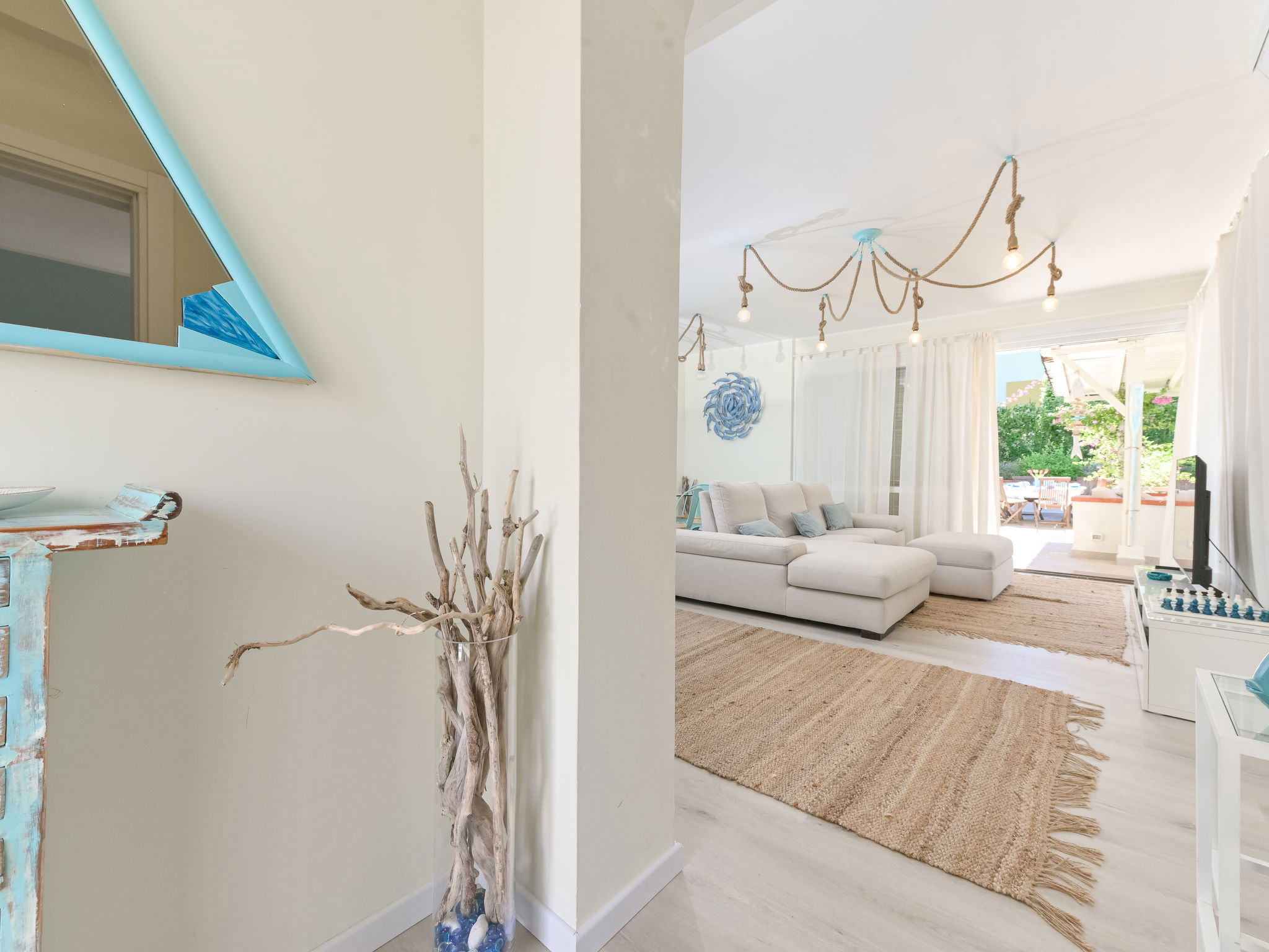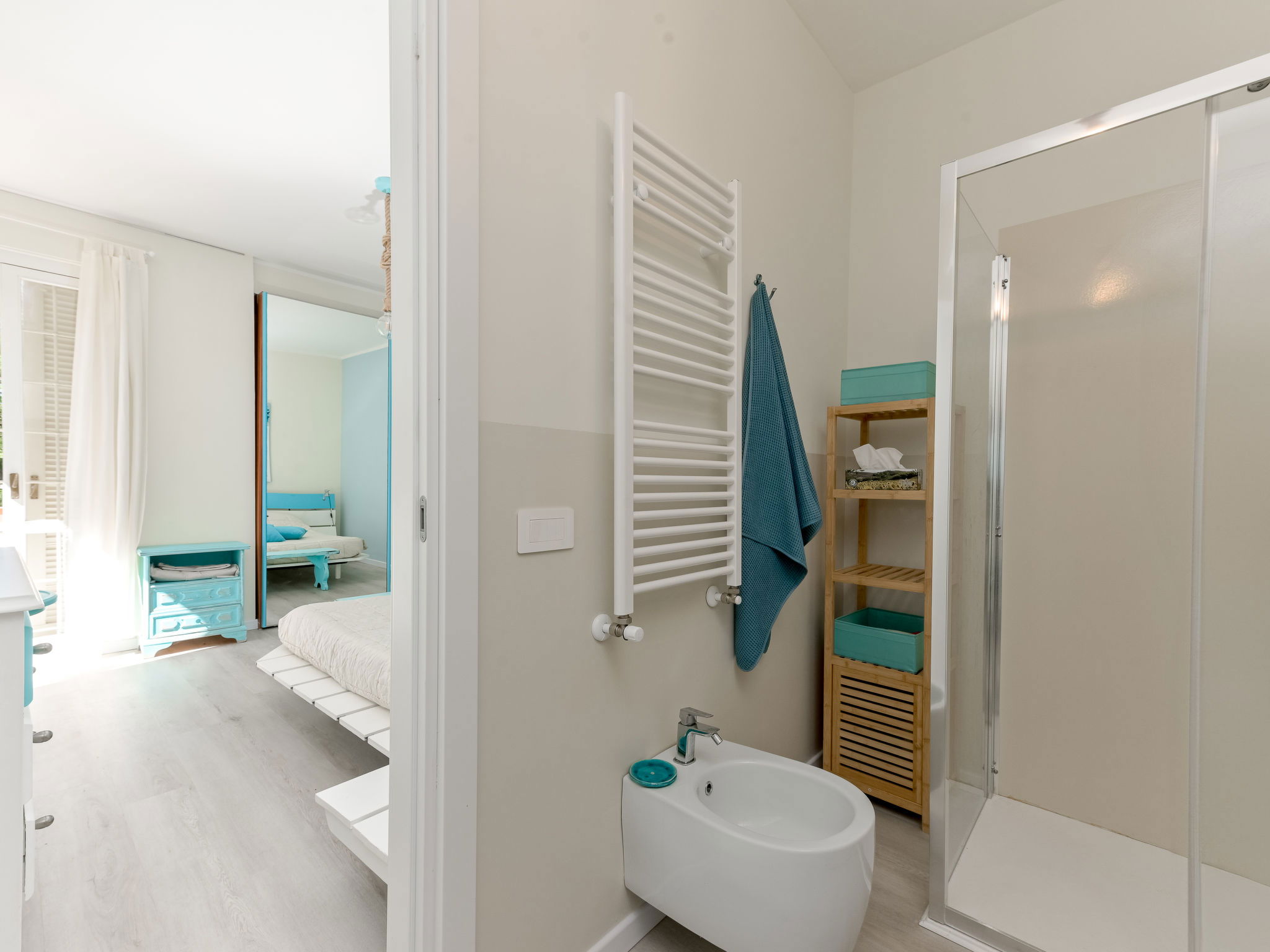 6-room villa 200 m2 on 2 levels. Modern and tasteful furnishings: open large living/dining room with sliding door with dining table and TV. Exit to the garden. 2 double bedrooms, each room with shower/bidet/WC. Open kitchen (oven, dishwasher, 4 induction hot plates, microwave, electric coffee machine). Exit to the garden. Upper floor: large, 1 double bedroom with shower/bidet/WC. Exit to the terrace. 1 double bedroom with shower/bidet/WC. 1 room with 1 bed, 1 pull-out bed and shower/bidet/WC. Air-conditioning, forced-air heating. Large balcony, terrace partly roofed, patio, lawn. Terrace furniture, barbecue. Facilities: washing machine, dryer. Internet (WiFi, free). Parking. Please note: maximum 1 pet/ dog allowed. Private entrance, fire extinguisher. IT053006C2BD5EBUWV