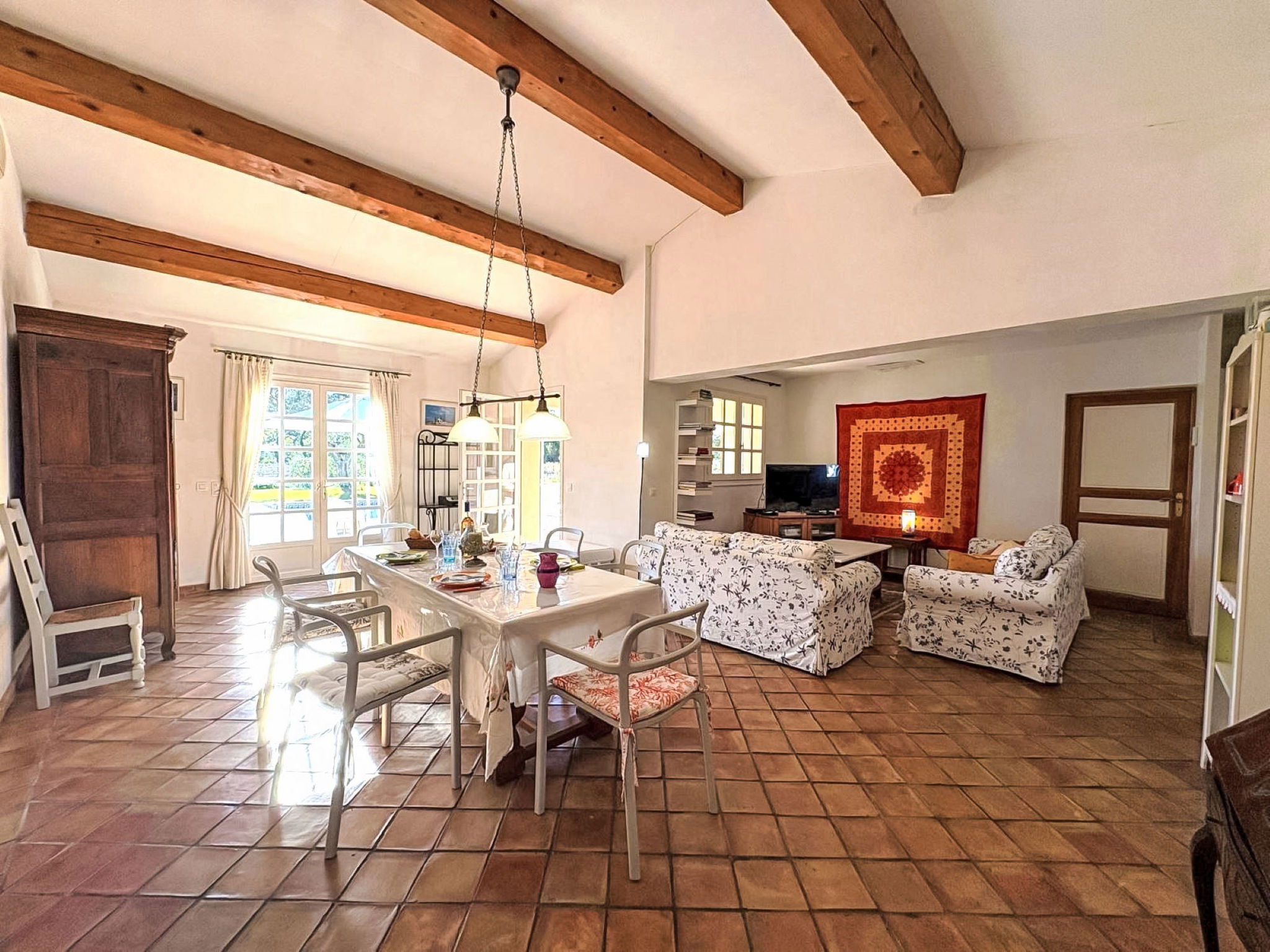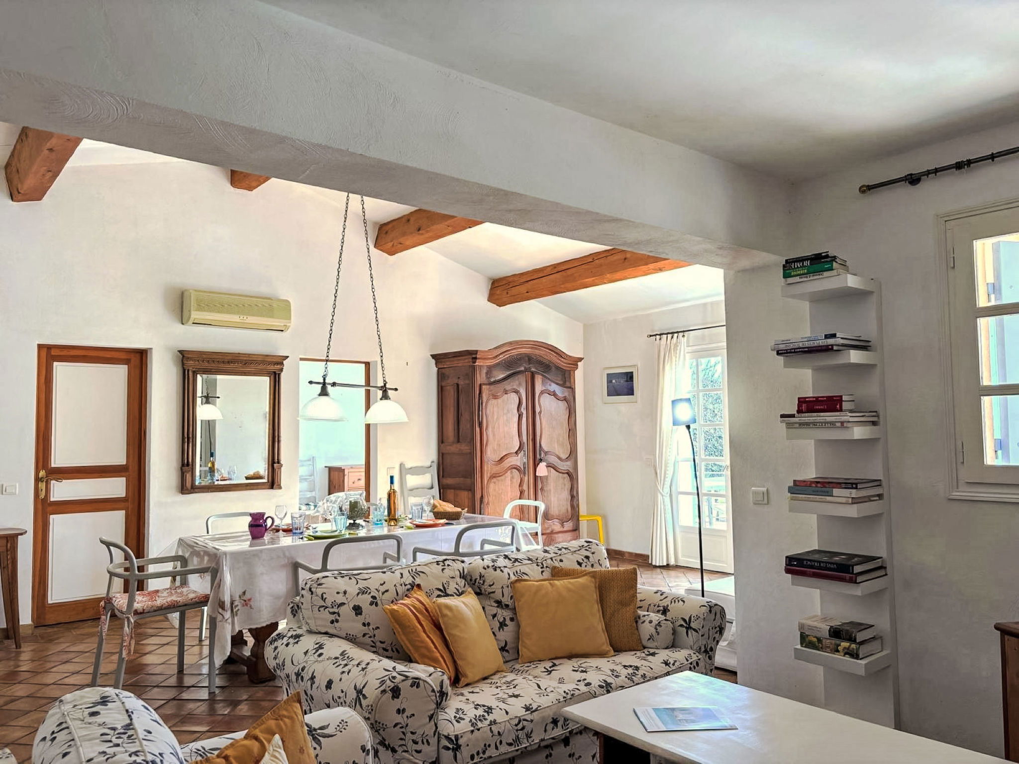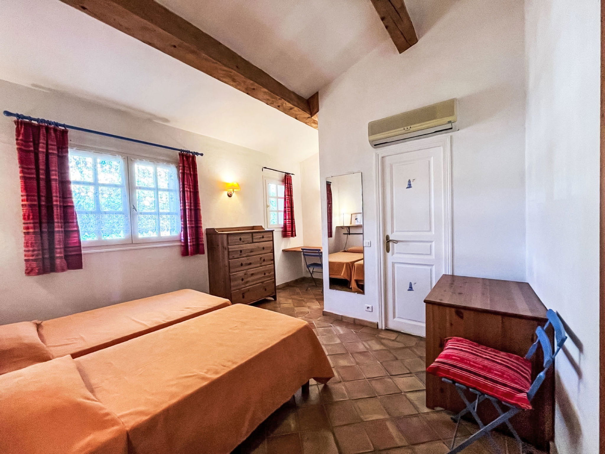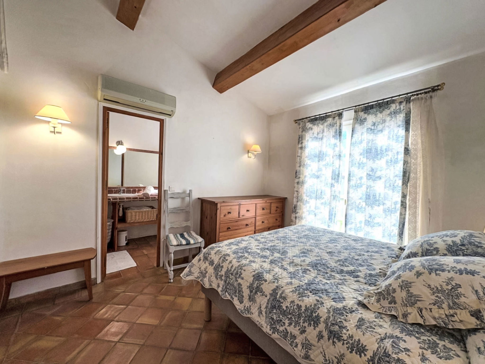 3-room house 90 m2. Cosy furnishings: living/dining room with TV (flat screen). Exit to the terrace. 1 room with 1 french bed (160 cm, length 190 cm), shower/WC and double hand-basin. Exit to the terrace. 1 room with 2 beds (90 cm, length 190 cm), shower. Open kitchen (4 hot plates, oven, dishwasher, toaster, kettle, microwave, freezer, electric coffee machine, Capsules for coffee machine (Nespresso) extra). Sep. WC. Electric heating, air-conditioning. Large terrace 45 m2 partly roofed, south-east facing position. Terrace furniture, barbecue, deck chairs (4). Facilities: washing machine, iron. Internet (WiFi, free). Parking (2 cars). Please note: non-smokers only. Maximum 1 pet/ dog allowed. Smoke alarm. Offer by a private individual according to Art. 155, IV of CGI.