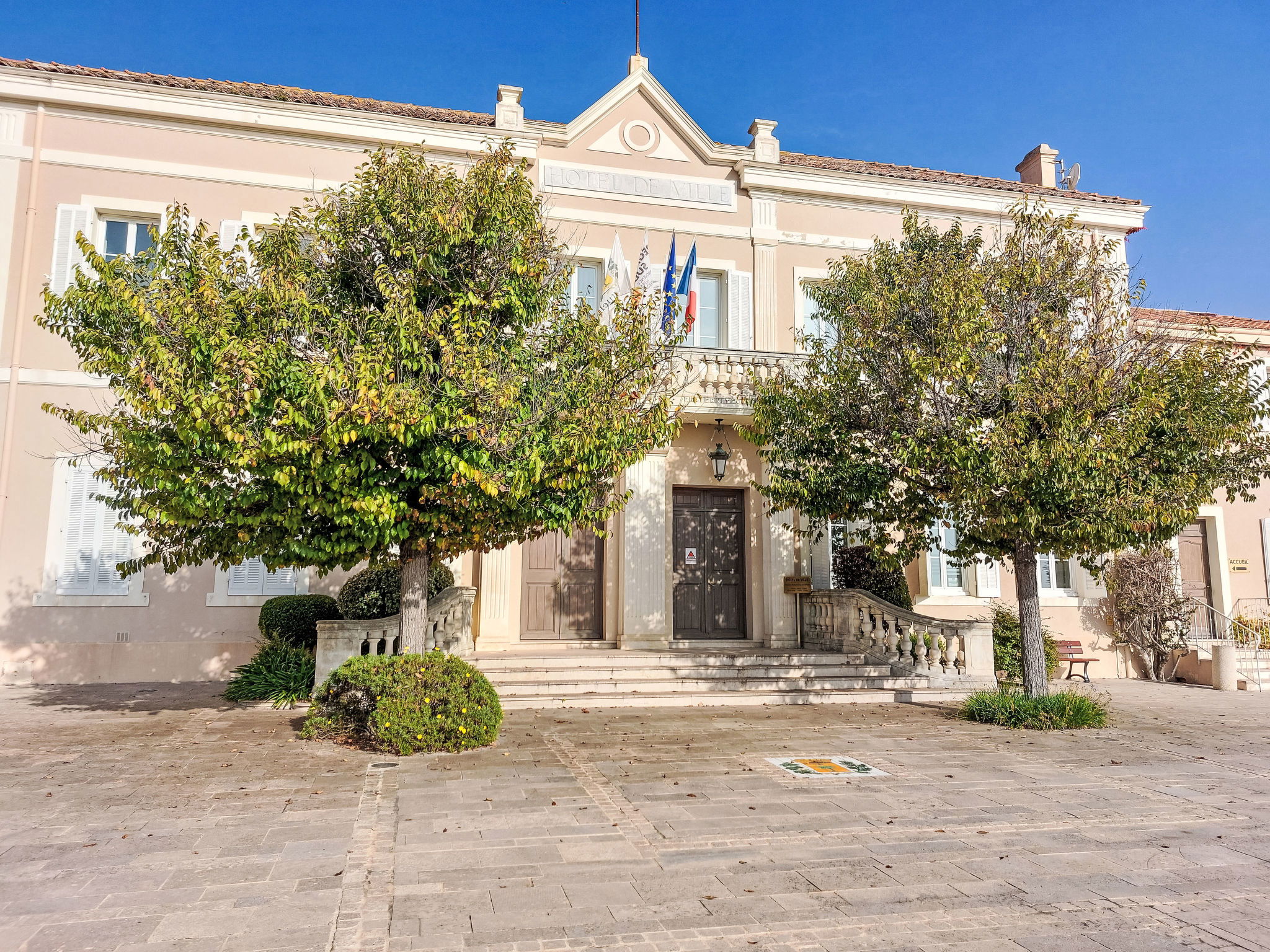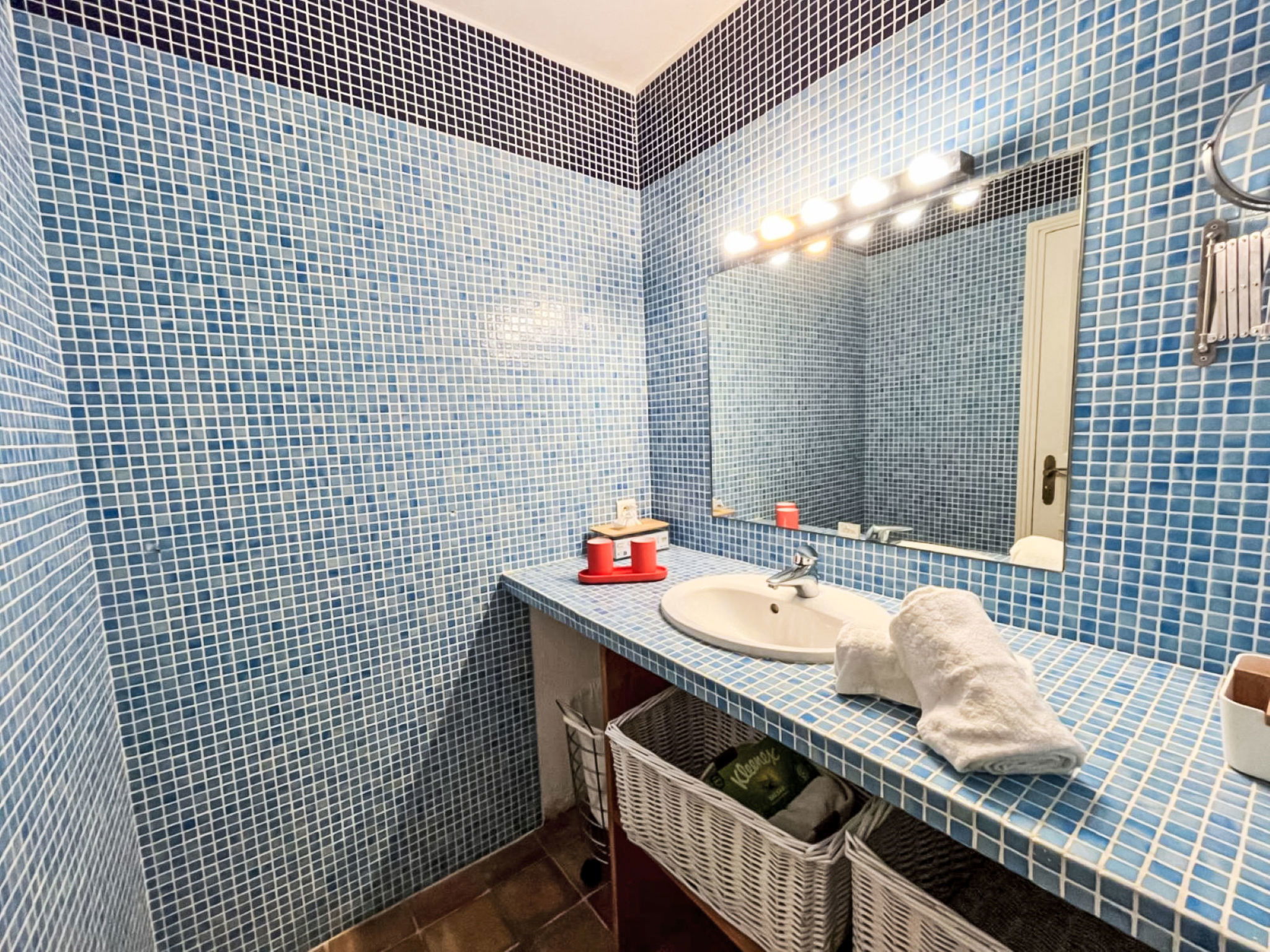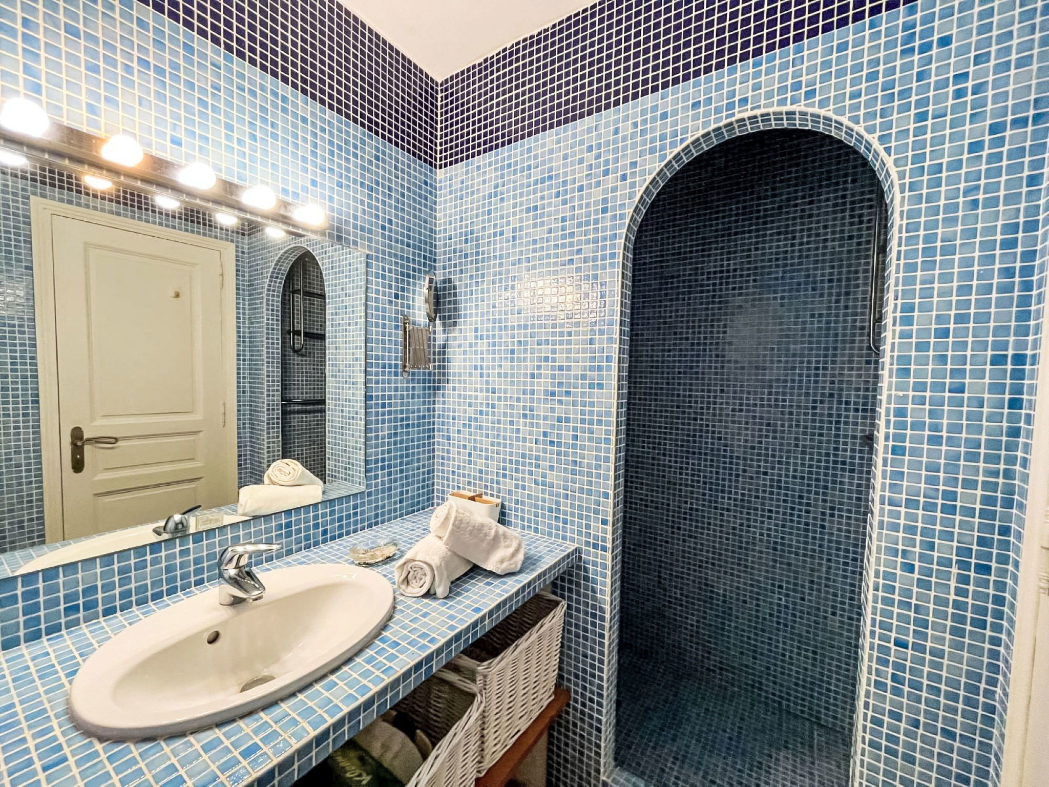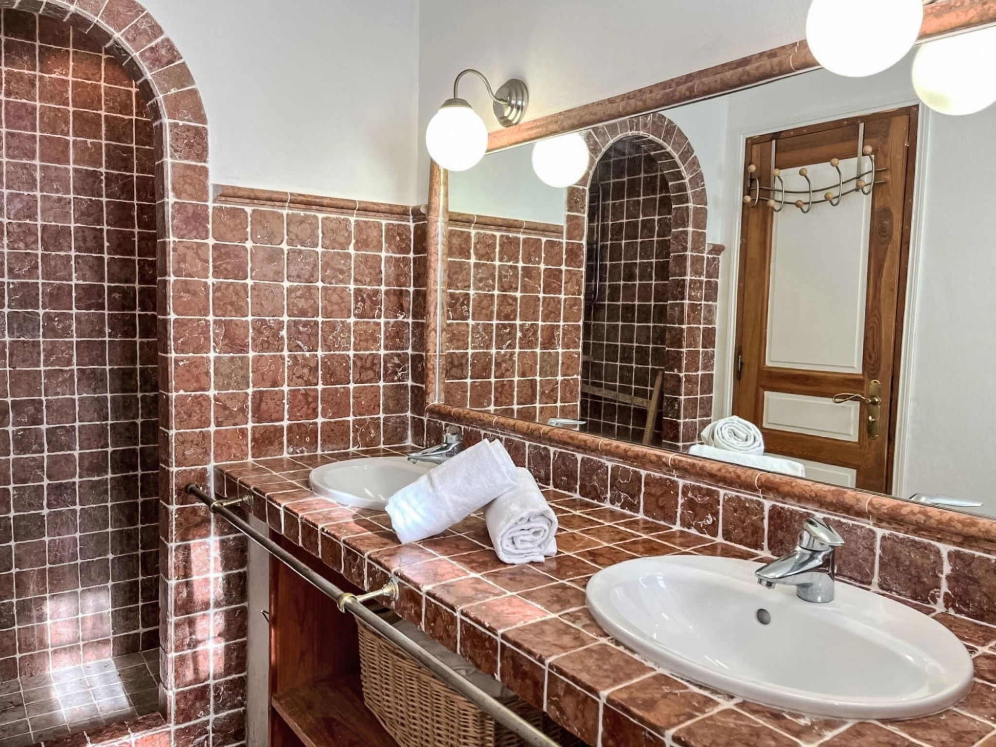 3-room house 90 m2. Cosy furnishings: living/dining room with TV (flat screen). Exit to the terrace. 1 room with 1 french bed (160 cm, length 190 cm), shower/WC and double hand-basin. Exit to the terrace. 1 room with 2 beds (90 cm, length 190 cm), shower. Open kitchen (4 hot plates, oven, dishwasher, toaster, kettle, microwave, freezer, electric coffee machine, Capsules for coffee machine (Nespresso) extra). Sep. WC. Electric heating, air-conditioning. Large terrace 45 m2 partly roofed, south-east facing position. Terrace furniture, barbecue, deck chairs (4). Facilities: washing machine, iron. Internet (WiFi, free). Parking (2 cars). Please note: non-smokers only. Maximum 1 pet/ dog allowed. Smoke alarm. Offer by a private individual according to Art. 155, IV of CGI.